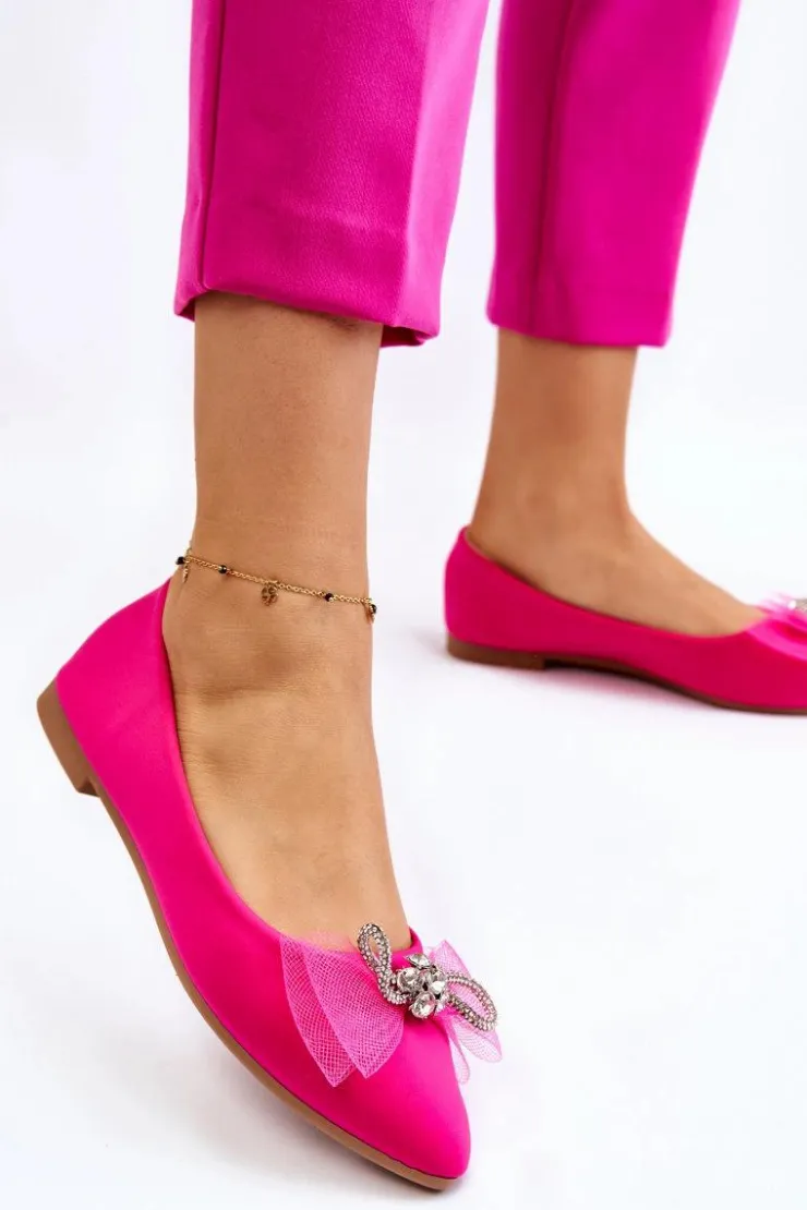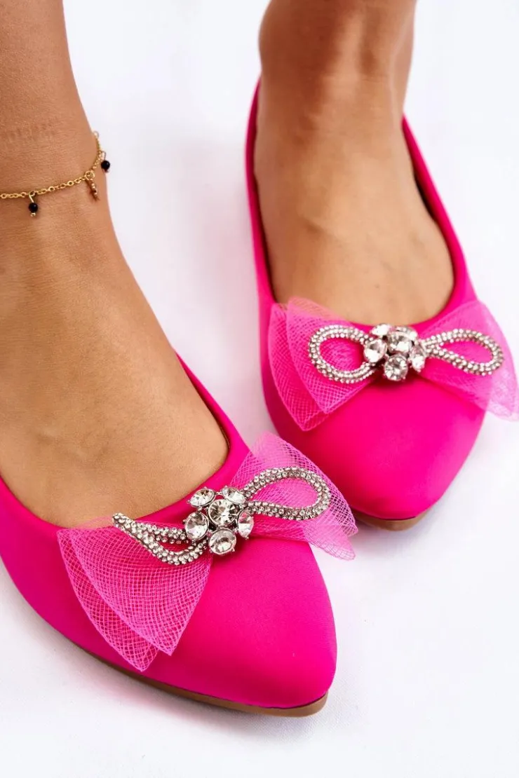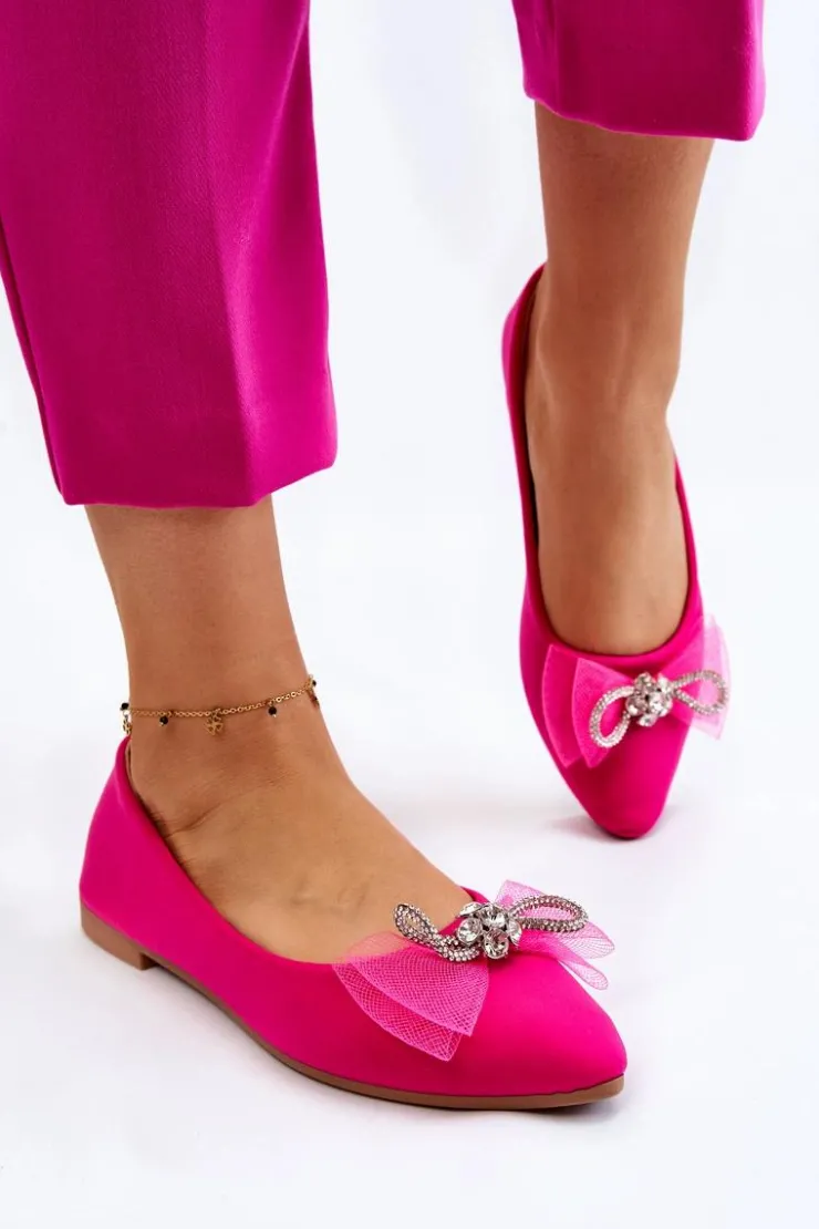 Eleganckie, damskie baleriny zostały wykonane z materiału tekstylnego. Model ten posiada na przodzie kokardę oraz dżety imitujące cyrkonie. Nosek w szpic. Baleriny to buty, z którymi stworzysz mnóstwo stylizacji. Będą idealne na różne, ważne okazje. Miękka wkładka wykonana z eko skóry zapewni wygodę podczas użytkowania. Przy wyborze rozmiaru prosimy sugerować się tabelą rozmiarów.
