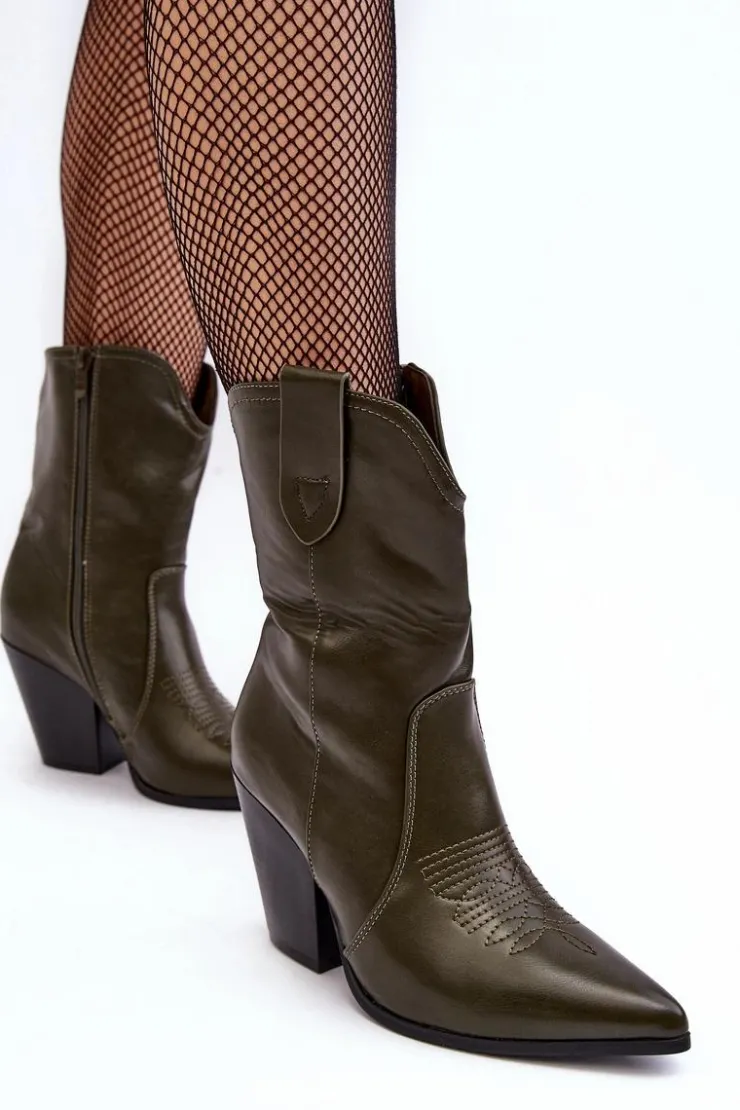 Damskie botki w stylu kowbojek wykonane z eko skóry. Osadzone na obcasie w postaci słupka. Noski w szpic optycznie wysmuklą nogi. Miękka eko skórzana wkładka zapewni komfort podczas użytkowania. Model ten jest zapinany na suwak z boku cholewki. Zapiętek jest usztywniony. Przy wyborze rozmiaru prosimy sugerować się tabelą rozmiarów.