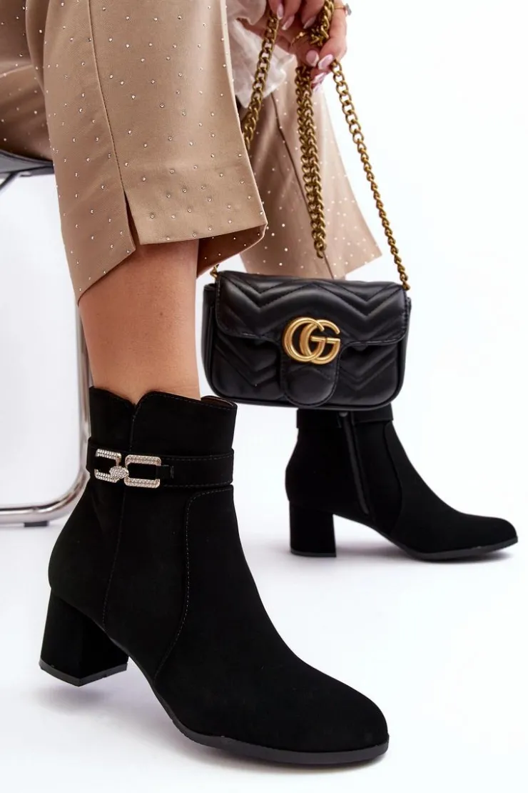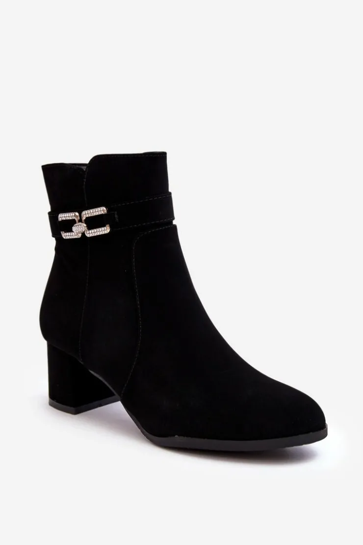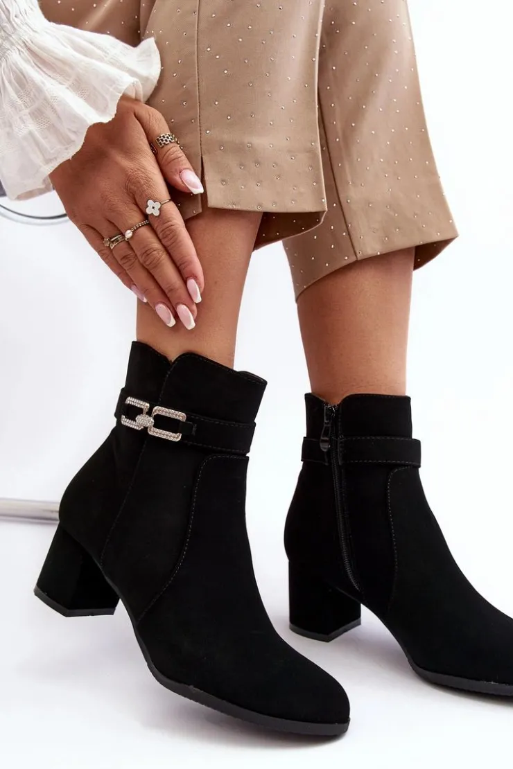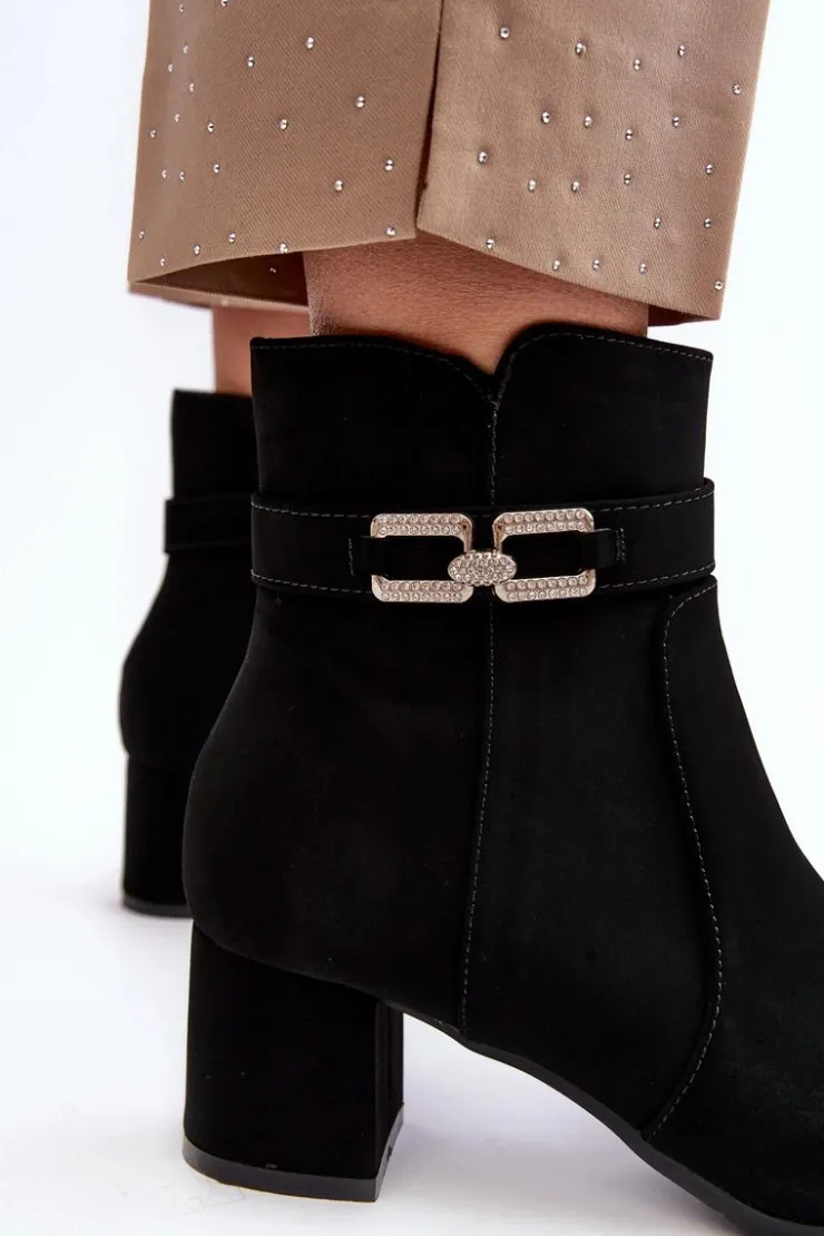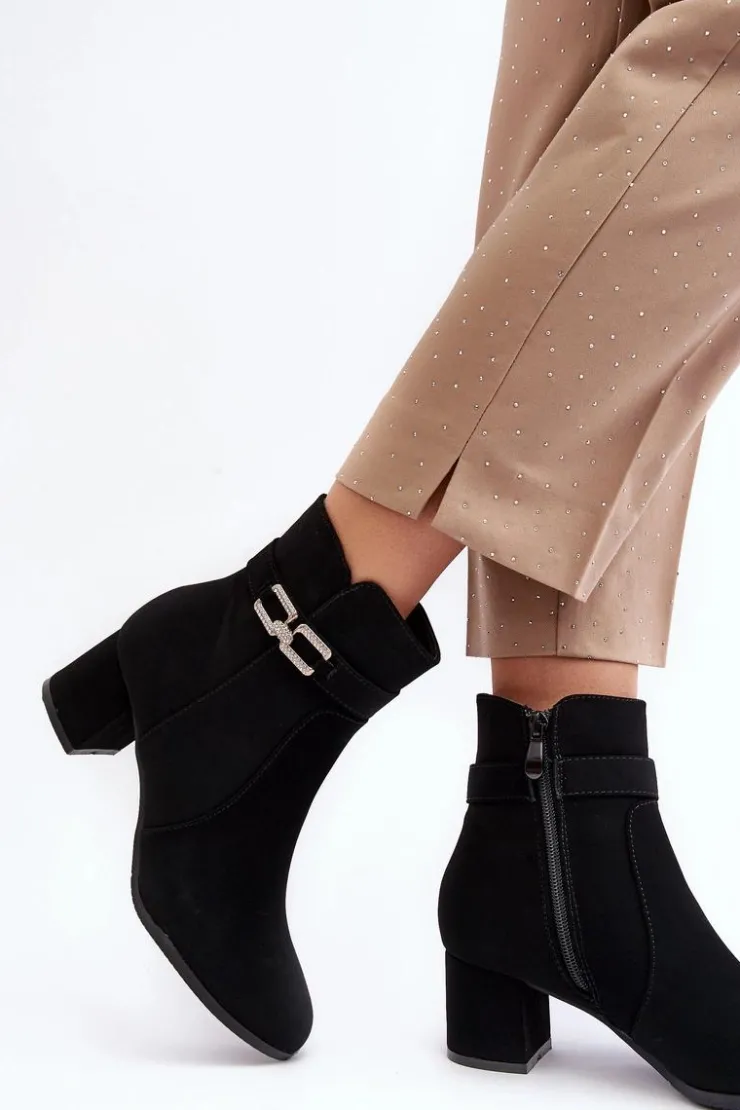 Damskie botki z cholewką za kostkę wykonane z eko skóry. Osadzone na niskim słupku. Noski zaokrąglone. Zapinane suwakiem z boku. Na cholewce pasek z ozdobą. Klasyczny model, idealny do wielu jesiennych stylizacji! Przy wyborze rozmiaru prosimy sugerować się tabelą rozmiarów.