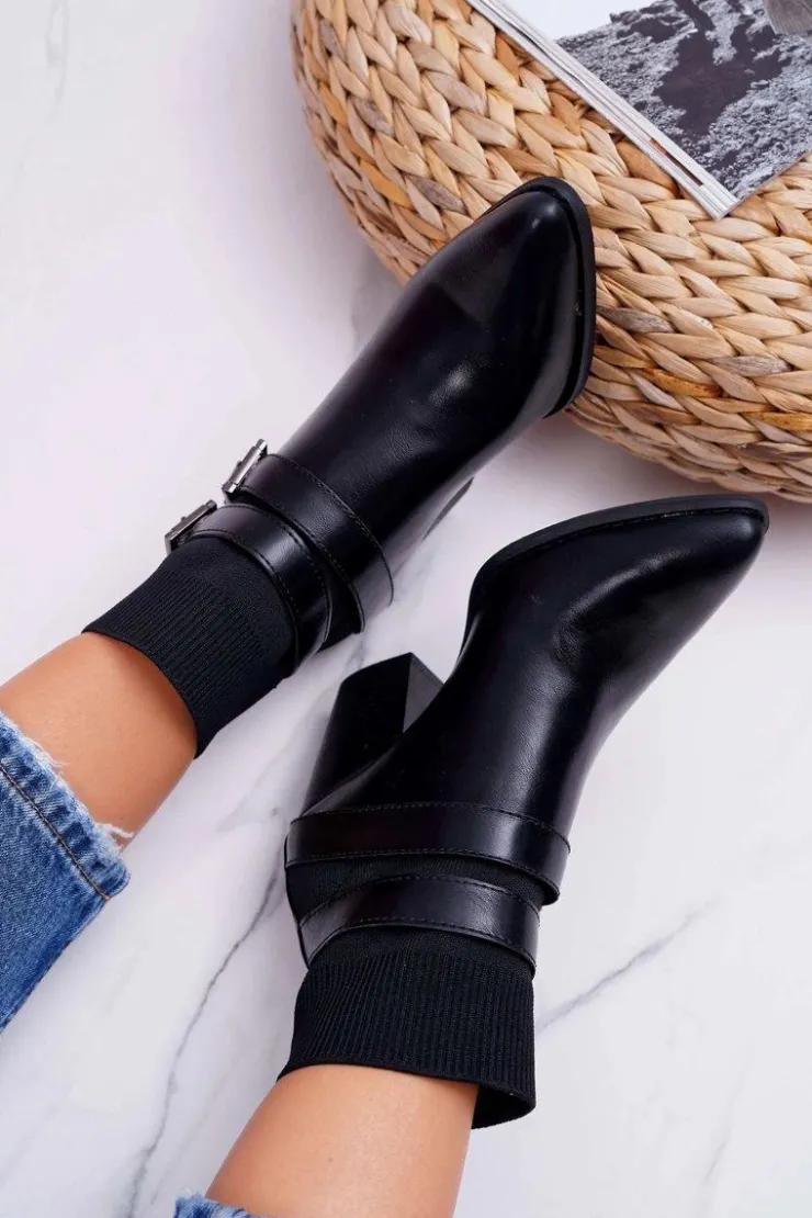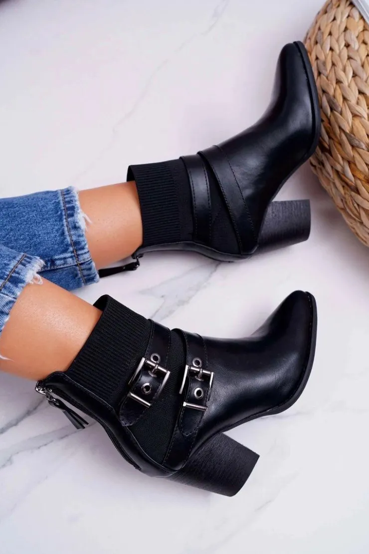 Czarne botki w nowoczesnym wydaniu. Suwak na tylnej części cholewki wygląda modnie oraz ułatwia zakładanie. Elastyczna gumka, klamry oraz nosek w szpic, te wspaniałe buty mogą być Twoje! Przy wyborze rozmiaru prosimy sugerować się tabelą rozmiarów.