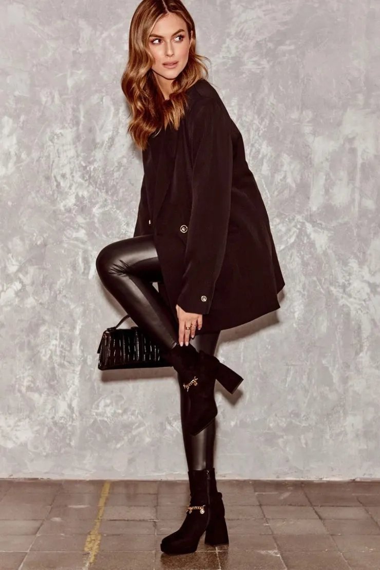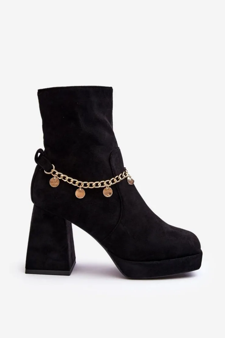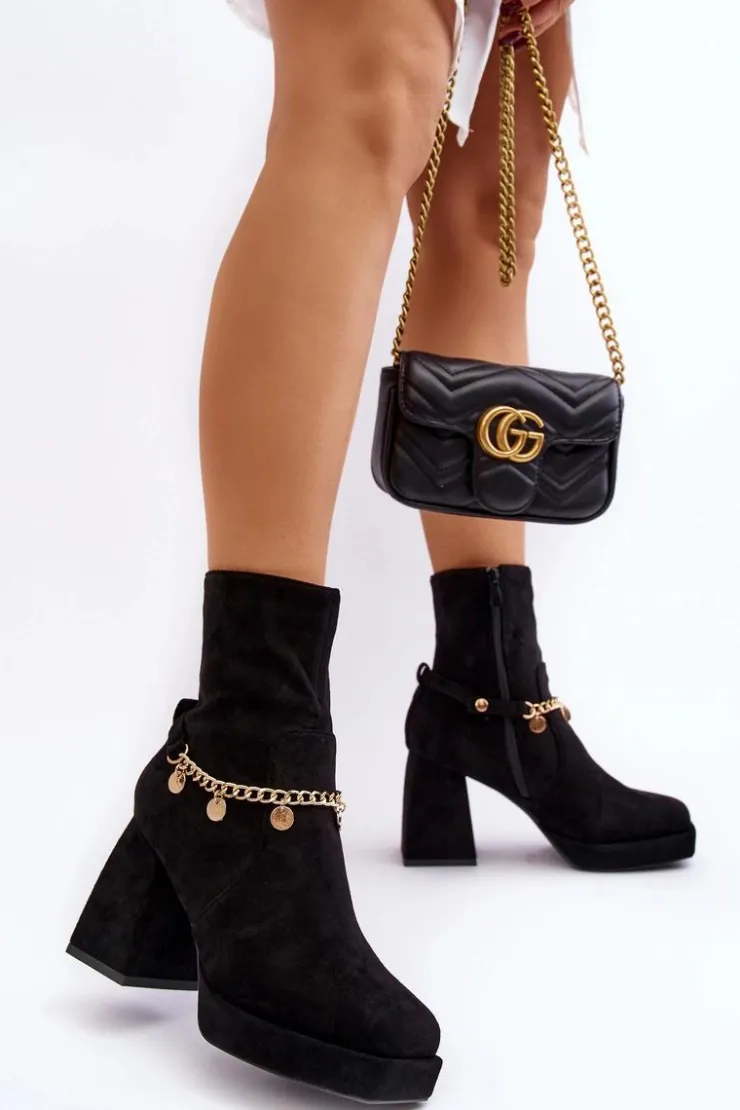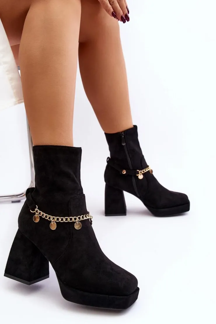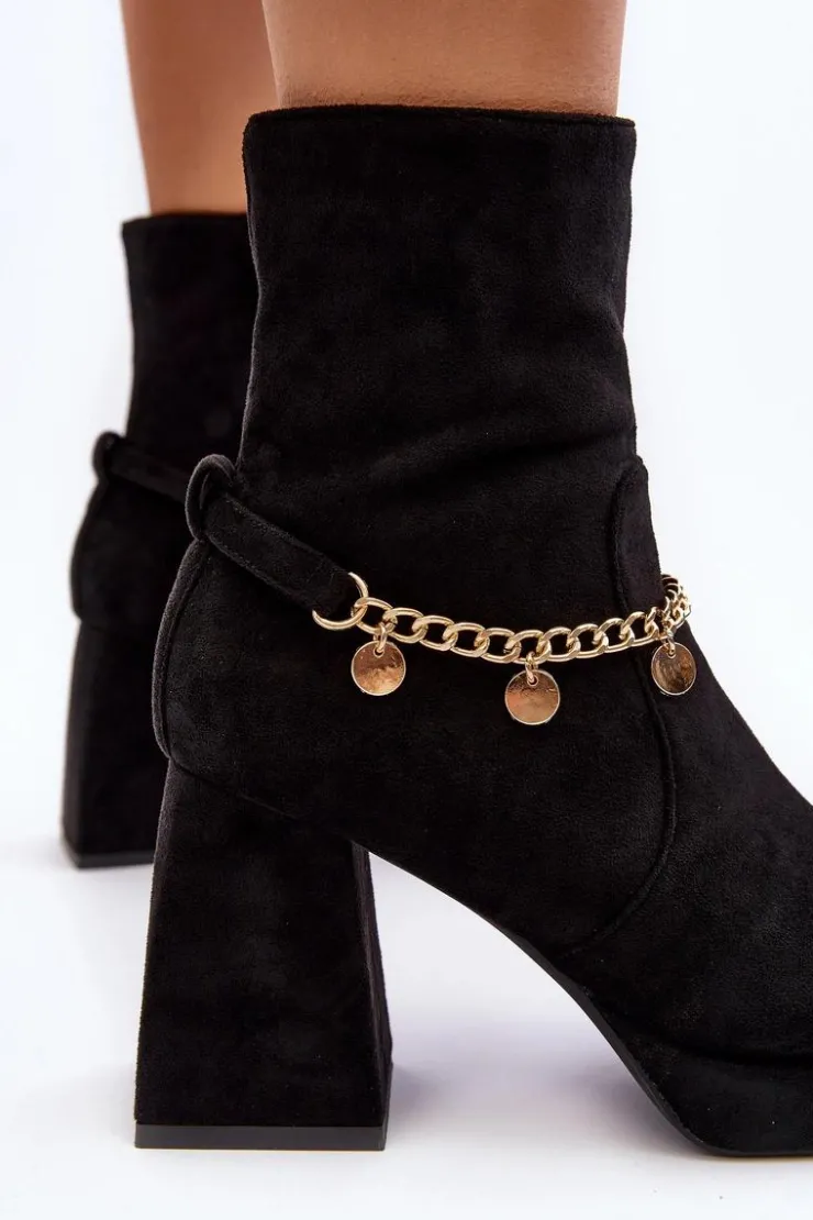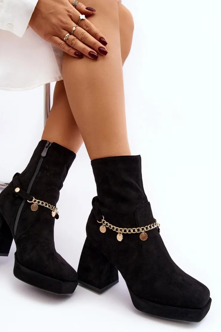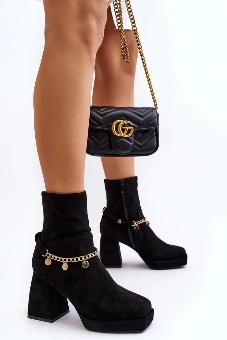 Botki damskie zostały wykonane z eko zamszu, co nadaje im eleganckiego wyglądu. Charakteryzują się solidnym obcasem typu klocek oraz noskami w kształcie kwadratu, dodającymi nutę nowoczesności. Usztywniony zapiętek zapewnia stabilność i wygodę podczas użytkowania. Cholewka ozdobiona łańcuszkiem. Botki te będą idealnym dodatkiem do jesiennych stylizacji! Przy wyborze rozmiaru prosimy sugerować się tabelą rozmiarów.
