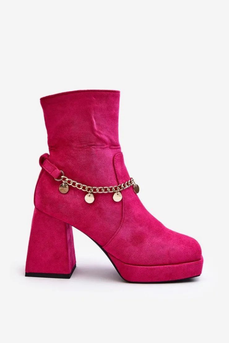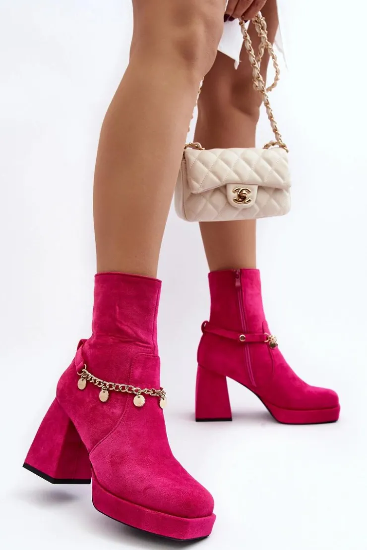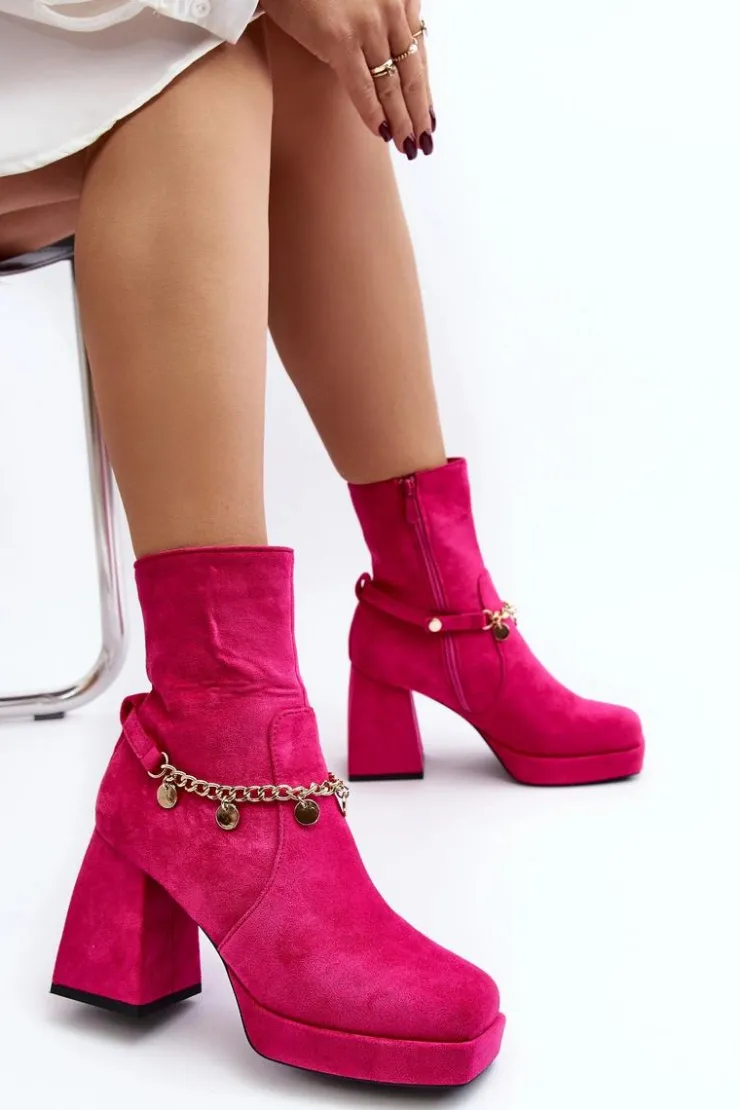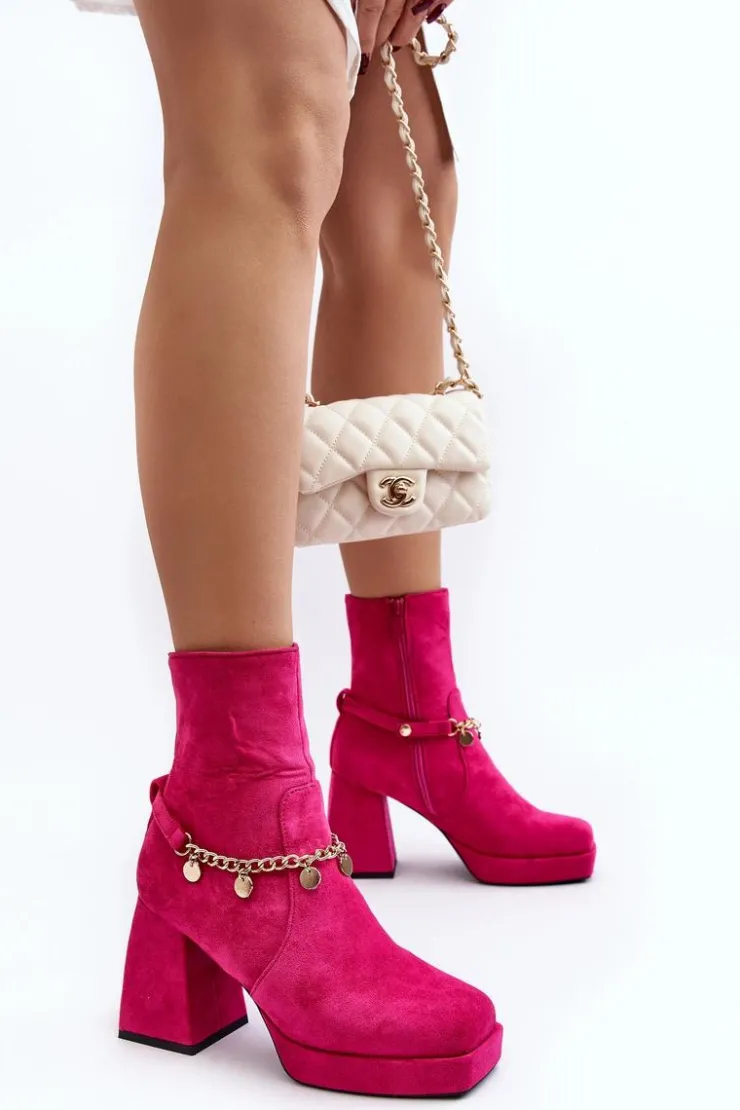 Botki damskie zostały wykonane z eko zamszu, co nadaje im eleganckiego wyglądu. Charakteryzują się solidnym obcasem typu klocek oraz noskami w kształcie kwadratu, dodającymi nutę nowoczesności. Usztywniony zapiętek zapewnia stabilność i wygodę podczas użytkowania. Cholewka ozdobiona łańcuszkiem. Botki te będą idealnym dodatkiem do jesiennych stylizacji! Przy wyborze rozmiaru prosimy sugerować się tabelą rozmiarów.