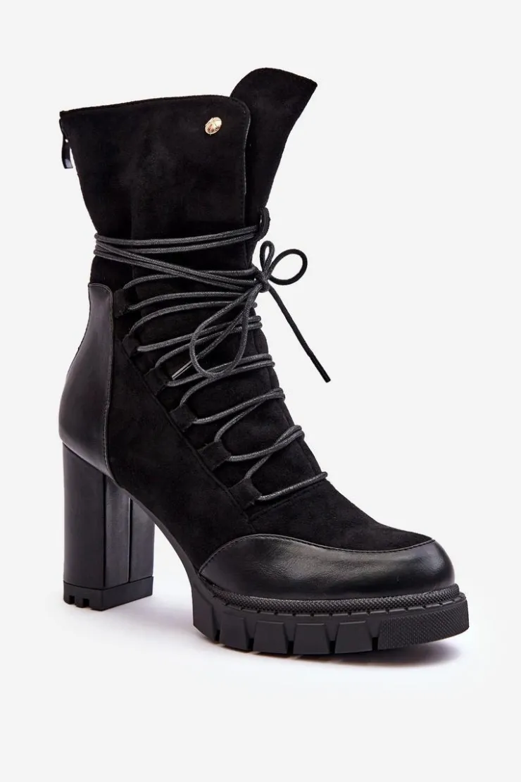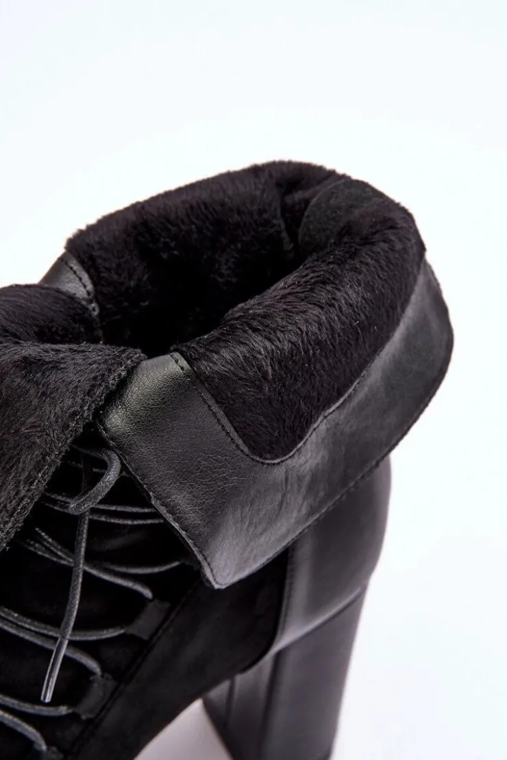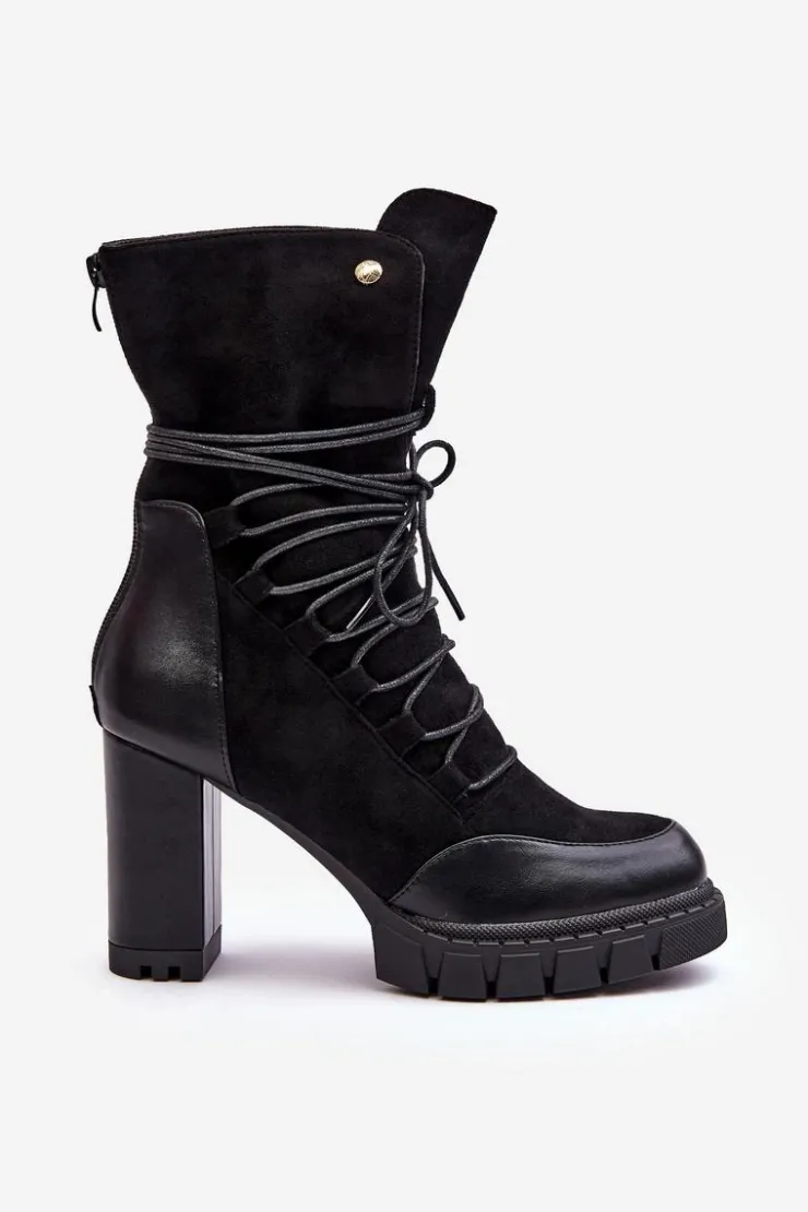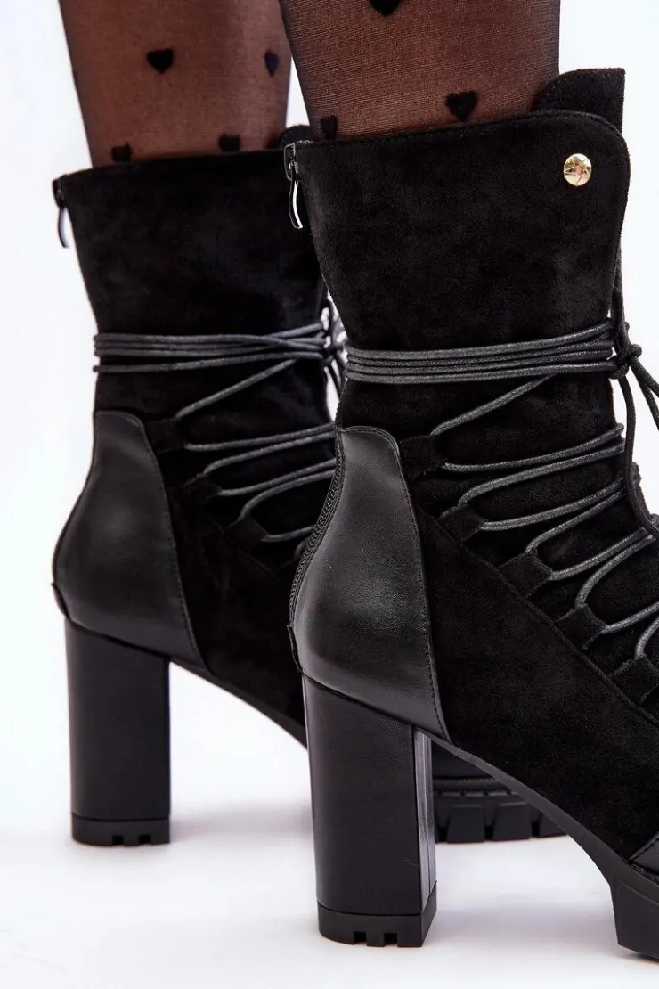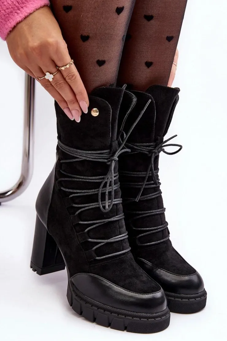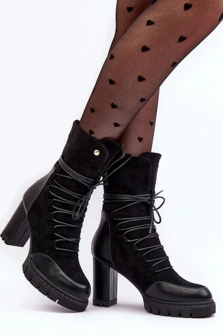 Damskie botki osadzone na platformie i masywnym obcasie w postaci słupka. Wykonane z połączenia eko skóry i eko zamszu. Z tyłu cholewki suwak. Ocieplone kocem obuwniczym w środku. Noski zaokrąglone. Zapiętek usztywniony. Koniecznie musisz je mieć! Przy wyborze rozmiaru prosimy sugerować się tabelą rozmiarów.