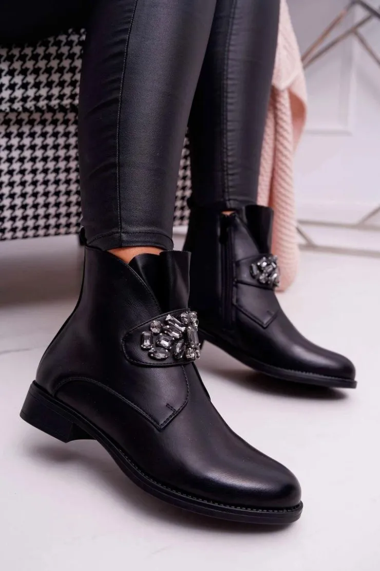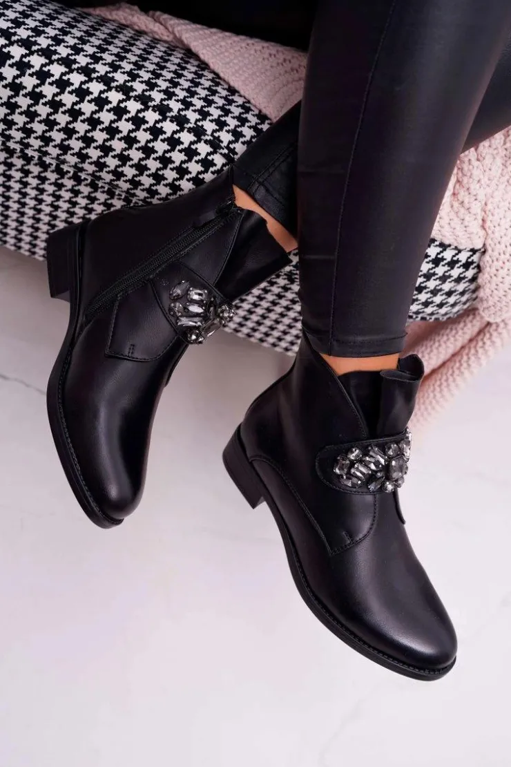 Wspaniałe botki wykonane ze skóry ekologicznej! Ocieplenie w postaci koca obuwniczego. Ponadczasowy wzór na płaskim obcasie. Idealny w każde warunki pogodowe! Zdobiony kryształkami na przodzie cholewki. Koniecznie sprawdź całą naszą kolekcję damskich botków.