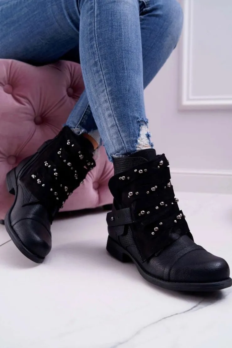Damskie Boto Damskie Botki Płaski Obcas Z Dżetami Czarne Valko