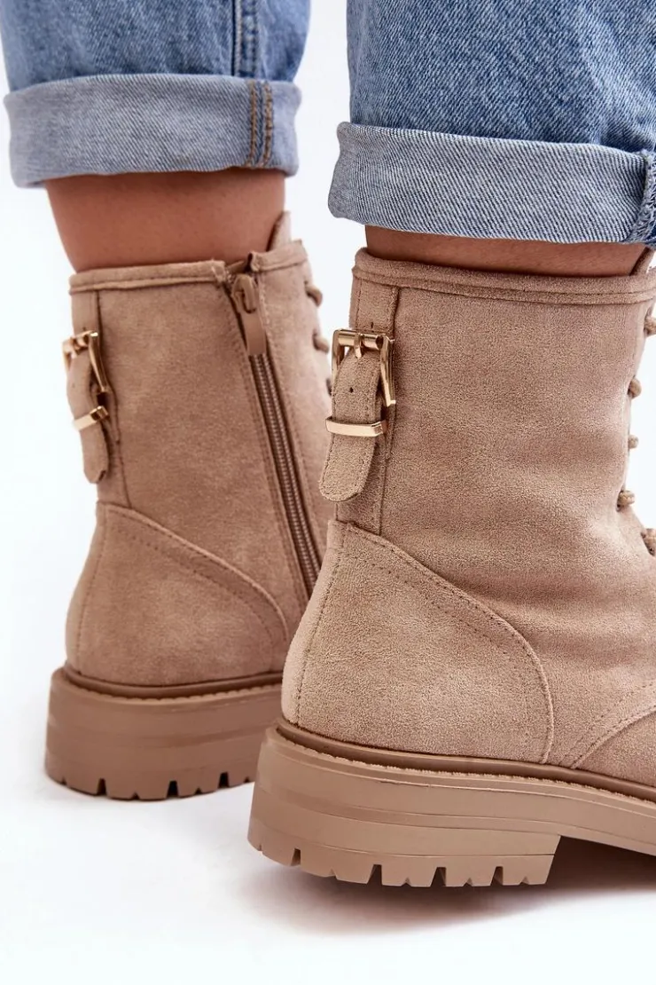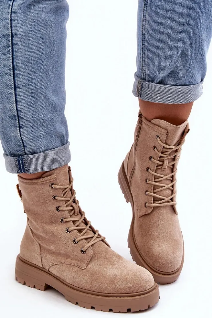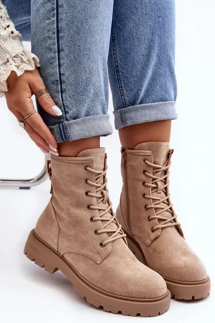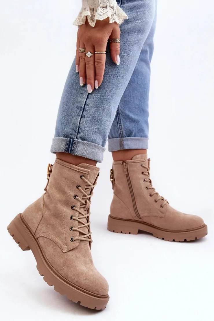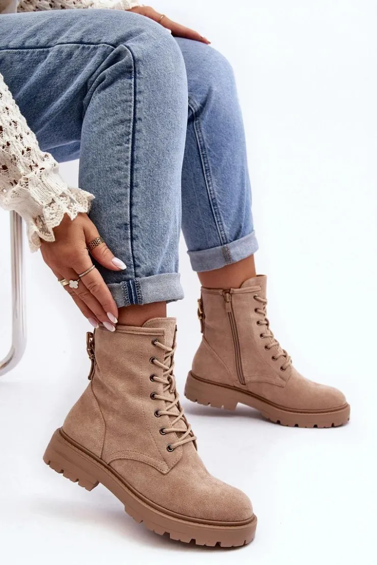 Klasyczne botki damskie wykonane z eko zamszu. Osadzone na platformie oraz płaskim obcasie. Model ten zapinany jest na suwak oraz dodatkowo posiada sznurowanie. Noski zaokrąglone. Zapiętek usztywniany pozwoli na odpowiednią stabilizację stopy. Z tyłu cholewki krótki pasek z klamrą. Koniecznie powinnaś je mieć! Przy wyborze rozmiaru prosimy sugerować się tabelą rozmiarów.