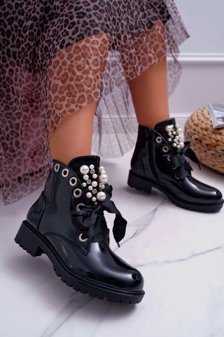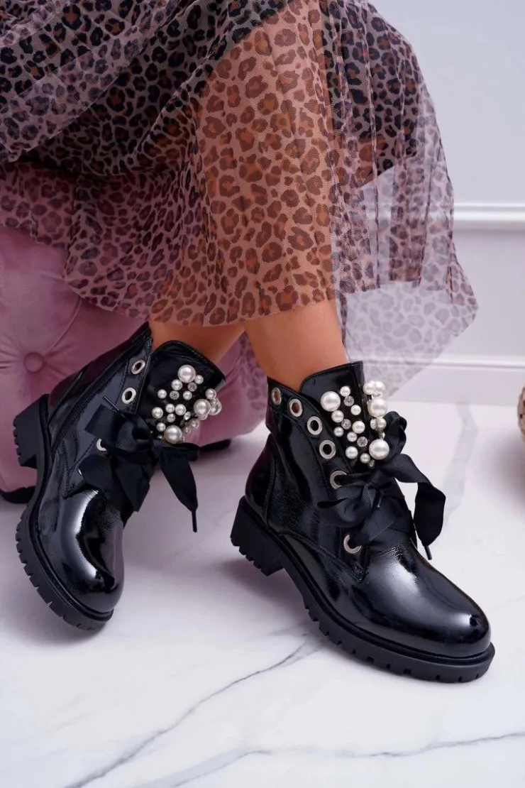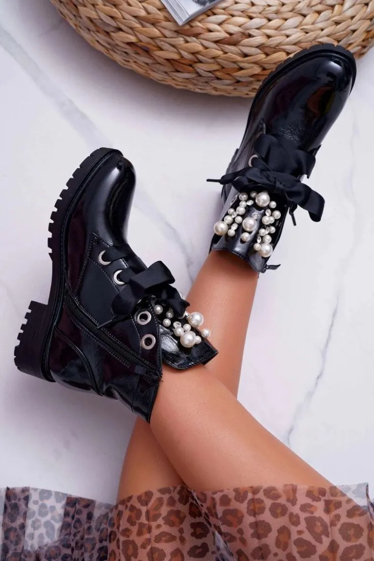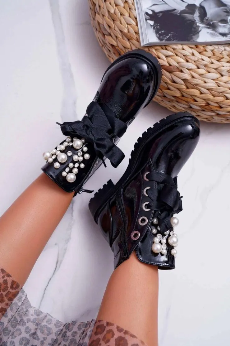 Damskie Boto Damskie Botki Z Perełkami Ocieplane Wstążka Sia