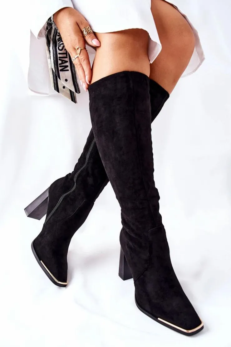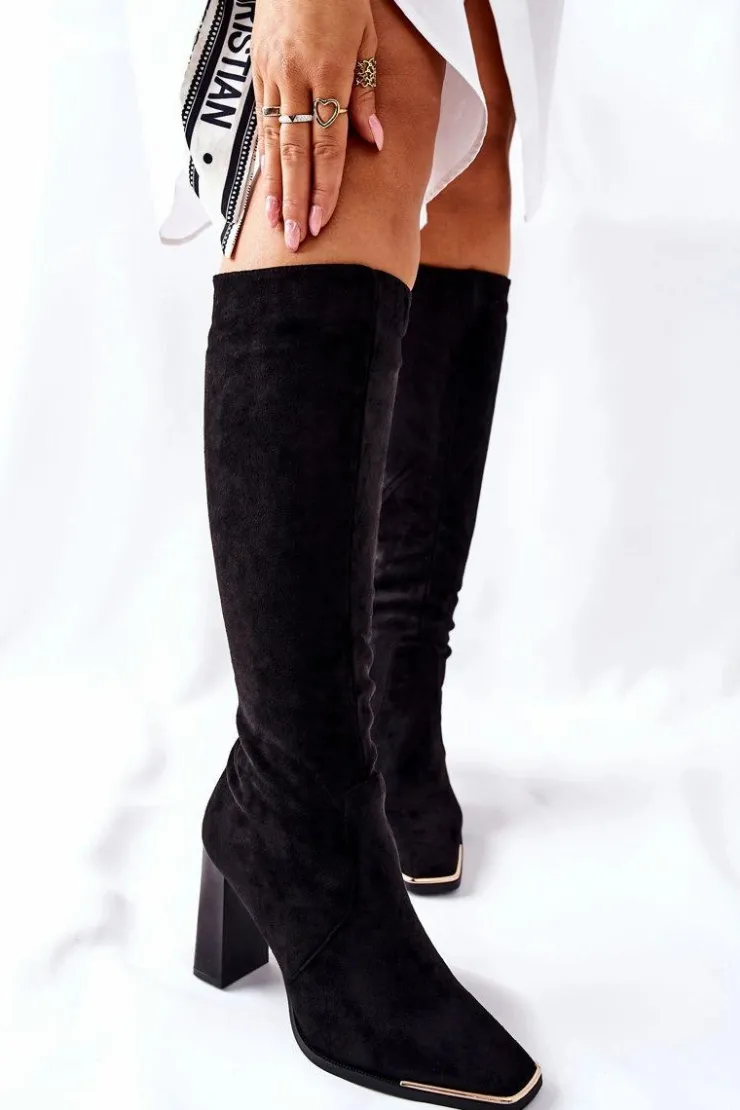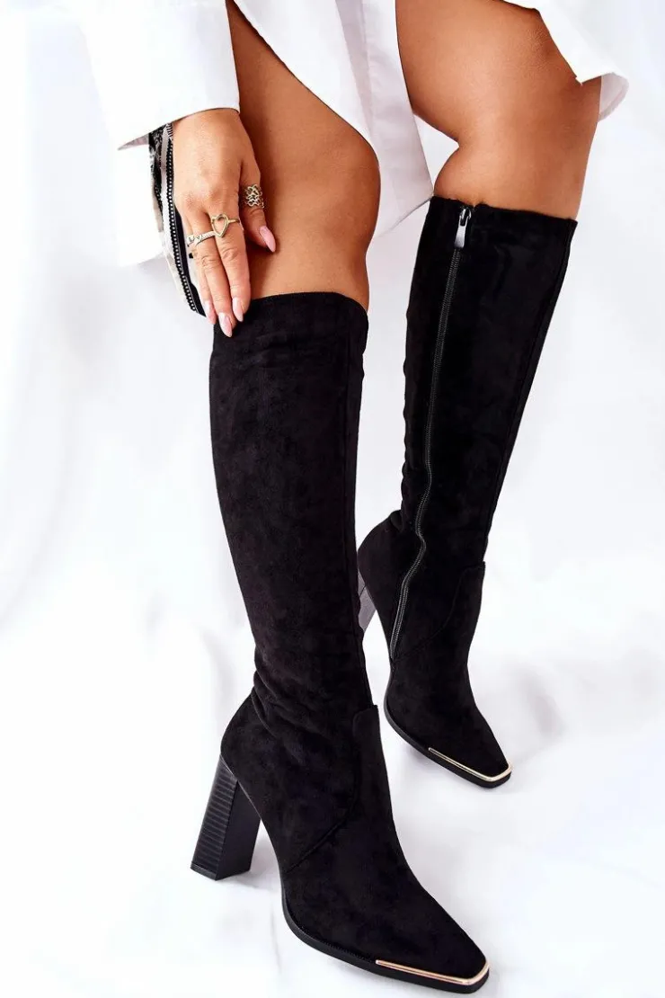 Piękne kozaki damskie, które ozdobią każdą stylizację. Model osadzony na delikatnym słupku, uniesie i wysmukli Twoją sylwetkę. Piękne złote zdobienie na nosku to totalny must have tego sezonu. Wnętrze pokryte ciepłym i miłym w dotyku kocem obuwniczym. Wszyty zamek w cholewce ułatwi zakładanie, a dodatkowa guma dopasuje kozaki do łydki. Przy wyborze rozmiaru prosimy sugerować się tabelą rozmiarów.