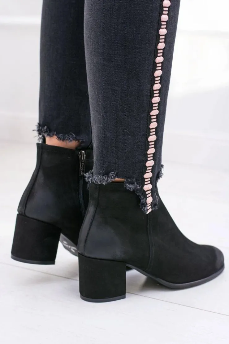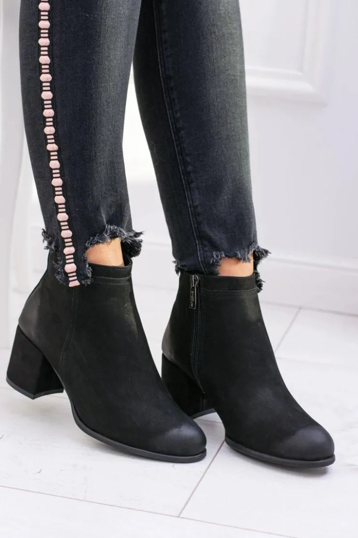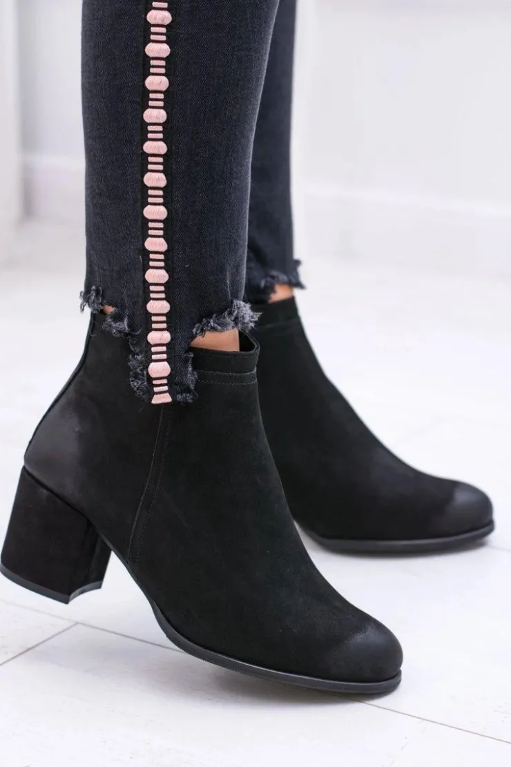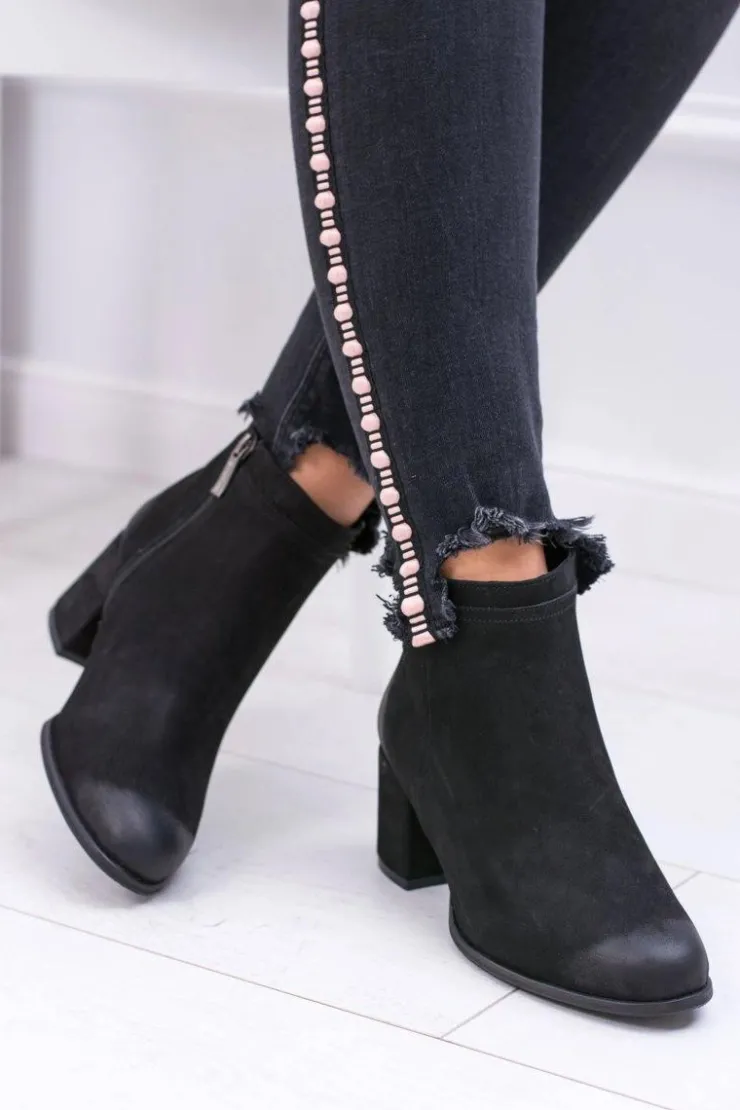Klasyczne botki na słupku, wykonane w całości ze skór naturalnych typu nubuk! Wnętrze ocieplane kocem obuwniczym. Idealnie wkomponują się do codziennych jak i wieczorowych stylizacji. Wszyty na boku suwak ułatwi ich zakładanie. Nie przegap i kup teraz w wyjątkowej cenie!