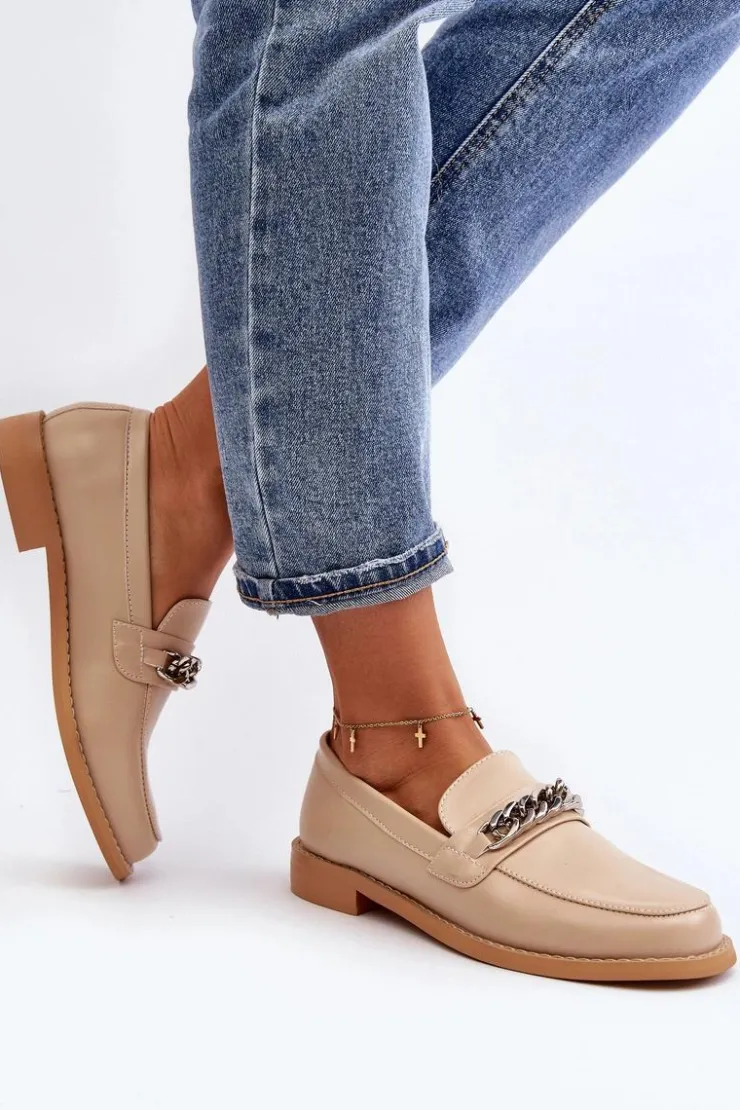 Klasyczne, wsuwane mokasyny damskie z pewnością sprawdzą się w wielu stylizacjach! Wykonane z eko skóry. Osadzone na płaskim obcasie, dzięki któremu są wygodne w użytkowaniu. Model ten posiada ozdobny łańcuch z przodu. Koniecznie powinnaś je mieć w swojej wiosennej garderobie! Przy wyborze rozmiaru prosimy sugerować się tabelą rozmiarów.