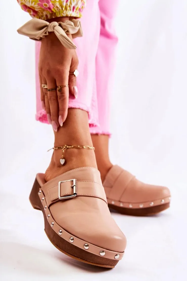 Klasyczny model damskich chodaków osadzony na obcasie i platformie. Model wsuwany. Przyozdobione na przodzie paskiem ze sprzączką. Dodatkowo wokół podeszwy znajdują się ozdobne ćwieki. Podeszwa wykonana z gumowego tworzywa, antypoślizgowa. Model ten dodatkowo posiada gumkę, dzięki której but będzie odpowiednio dopasowany do tęgości nogi. Wkładka wykonana z eko skóry. Model ten świetnie sprawdzi się na co dzień. Nosek zakryty, zaokrąglony. Przy wyborze rozmiaru prosimy sugerować się tabelą rozmiarów.