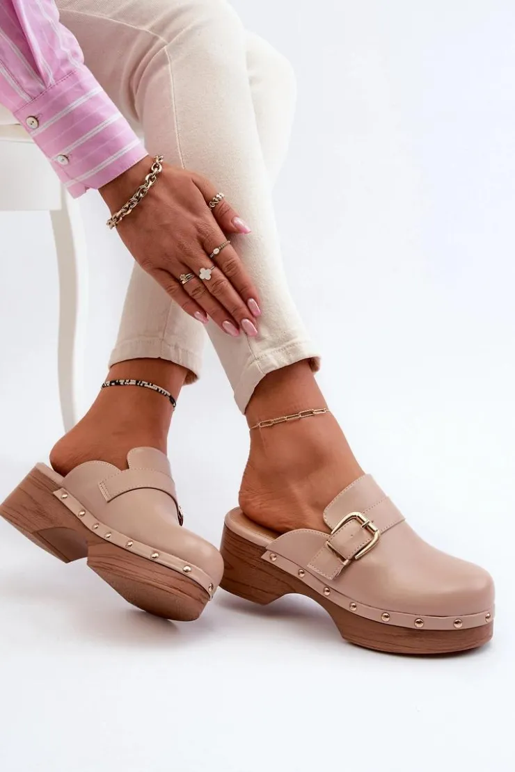 Lekkie klapki osadzone na obcasie i platformie, co nadaje im subtelny wyraz. Na cholewce pasek z klamrą oraz ozdobne ćwieki wokół podeszwy. Wykonane z eko skóry, zarówno cholewka, jak i wkładka gwarantują trwałość i komfort noszenia. Ten model świetnie komponuje się z codziennymi stylizacjami, dodając im nuty szyku i wyrafinowania. Przy wyborze rozmiaru prosimy sugerować się tabelą rozmiarów.