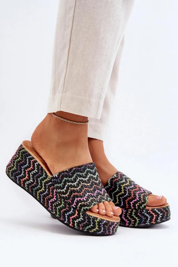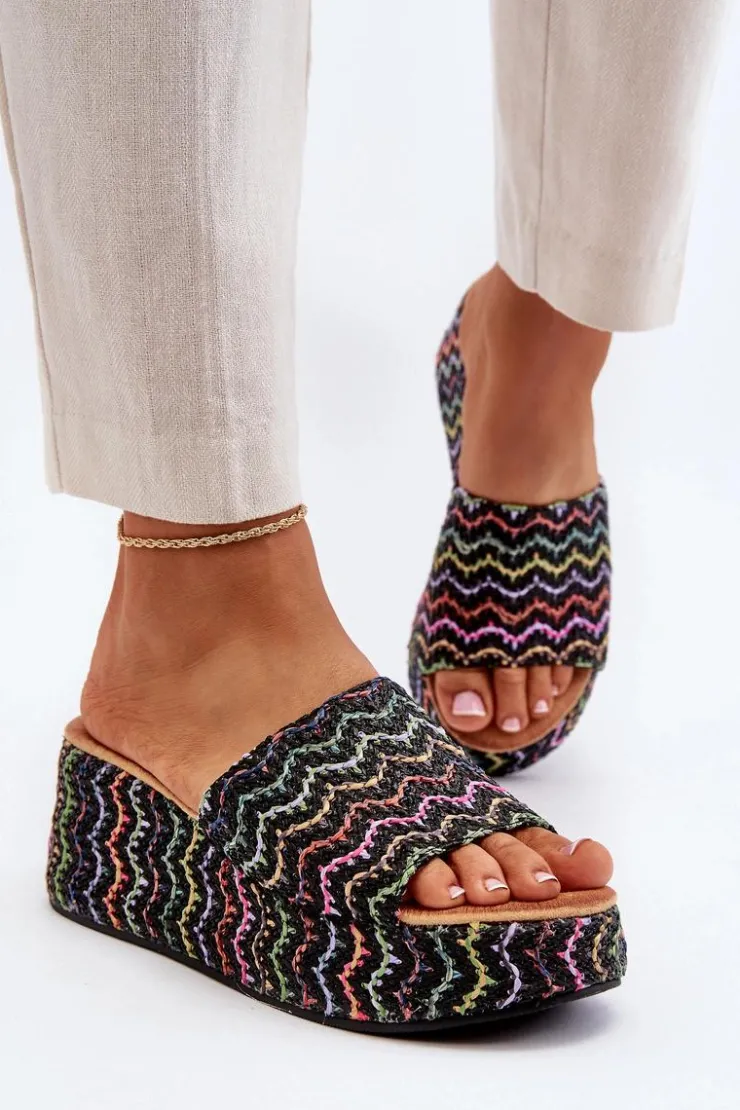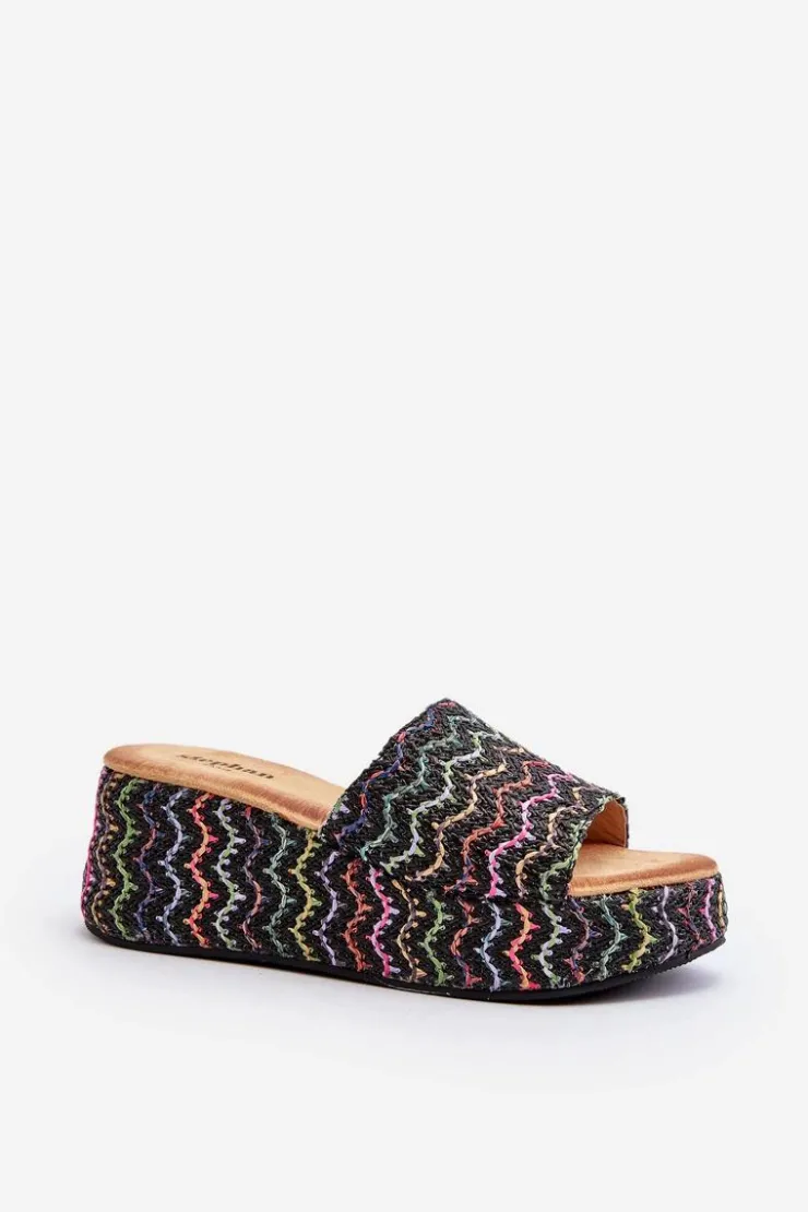 Damskie klapki zostały osadzone na masywnej platformie i koturnie, które dodatkowo zostały ozdobione plecionymi warkoczami. Miękka wkładka została wykonana z miękkiego eko zamszu. Te klapki to świetny wybór na letnie, upalne dni! Przy wyborze rozmiaru prosimy sugerować się tabelą rozmiarów.