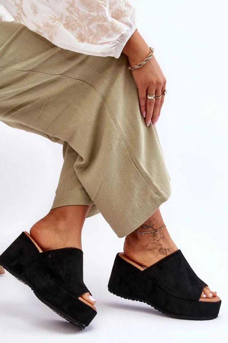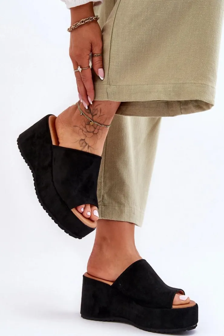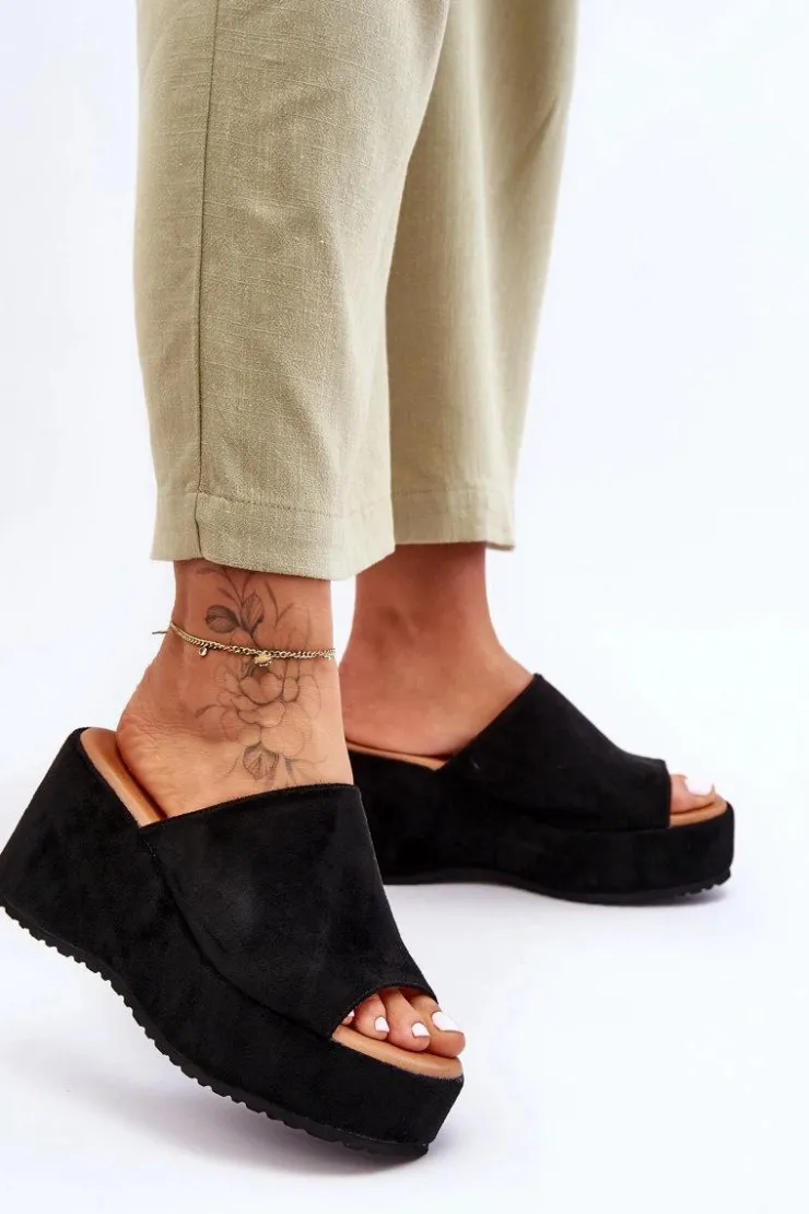 Wyjątkowe, damskie klapki zostały osadzone na masywnej platformie i koturnie. Wykonane z wierzchu z miłego w dotyku eko zamszu. Miękka wkładka została wykonana z eko skóry. Klapki posiadają odkryty nosek. Model ten posiada podeszwę z tworzywa sztucznego. Te klapki to świetny wybór na letnie, upalne dni! Przy wyborze rozmiaru prosimy sugerować się tabelą rozmiarów.
