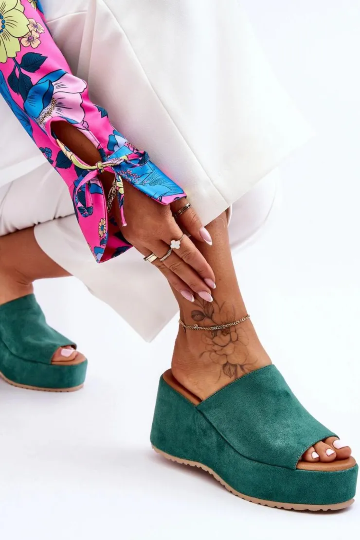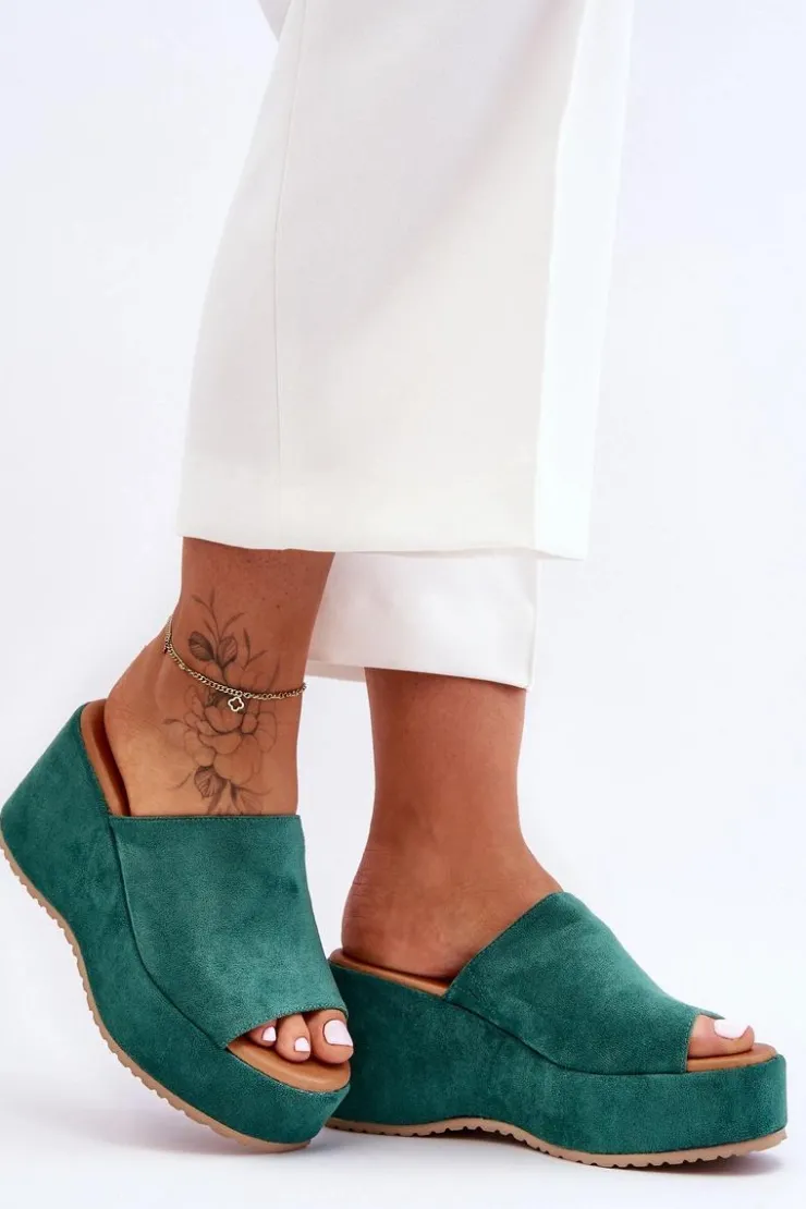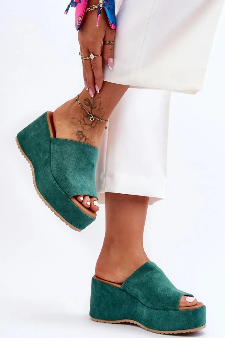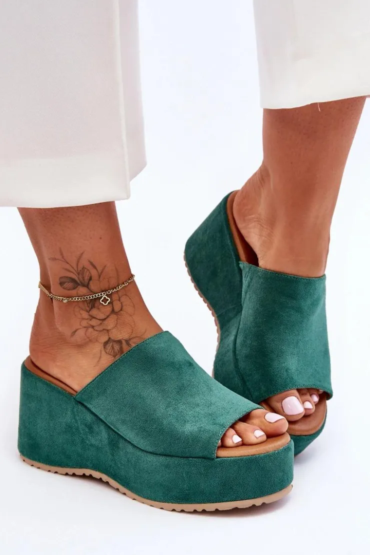 Wyjątkowe, damskie klapki zostały osadzone na masywnej platformie i koturnie. Wykonane z wierzchu z miłego w dotyku eko zamszu. Miękka wkładka została wykonana z eko skóry. Klapki posiadają odkryty nosek. Model ten posiada podeszwę z tworzywa sztucznego. Te klapki to świetny wybór na letnie, upalne dni! Przy wyborze rozmiaru prosimy sugerować się tabelą rozmiarów.