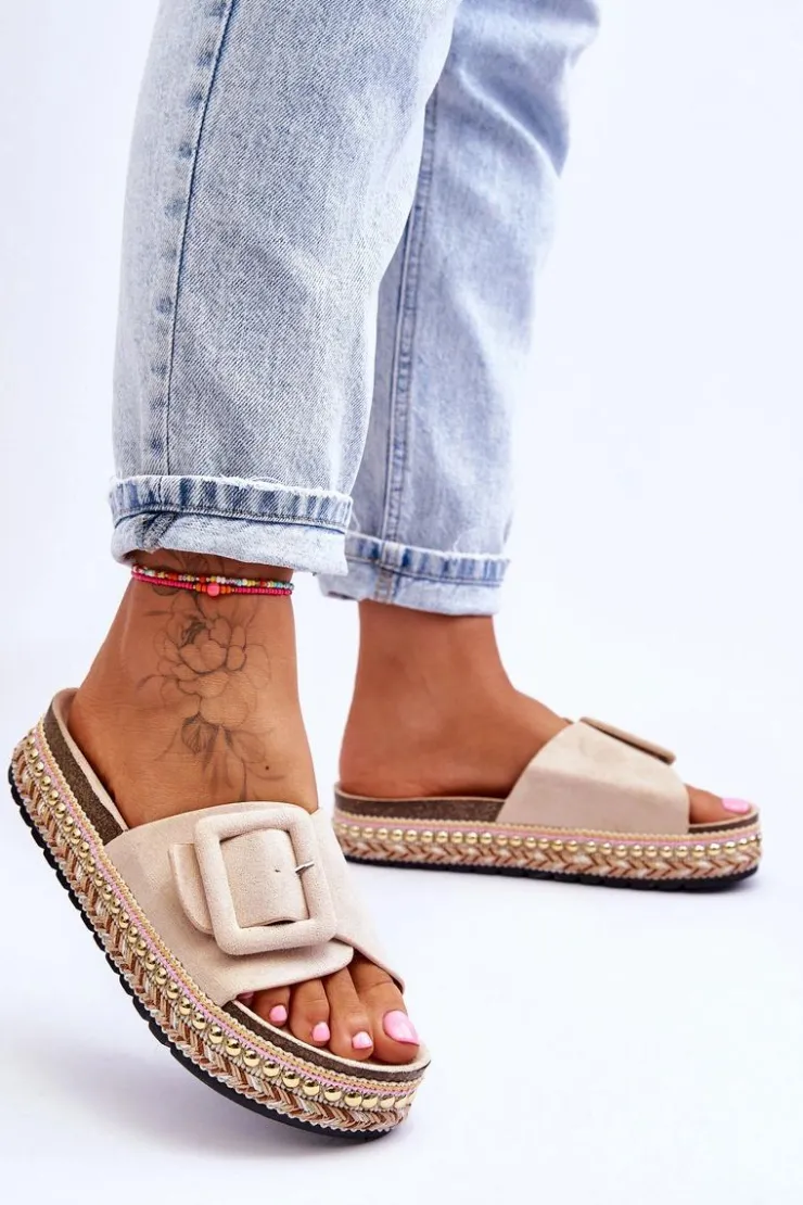 Wyjątkowe, damskie klapki zostały osadzone na platformie ozdobionej nitami oraz kolorowymi plecionkami. Model klasyczny, wsuwany, ozdobną klamrą i regulowanym paskiem, który pozwoli na odpowiednie dopasowanie obuwia do tęgości nogi. Profilowana wkładka zapewni wygodę w użytkowaniu. Świetny model do wielu stylizacji! Przy wyborze rozmiaru prosimy sugerować się tabelą rozmiarów.