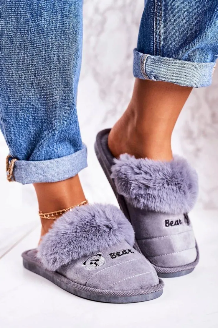 Damskie Boto Damskie Klapki Papcie Z Futerkiem Szare Teddy
