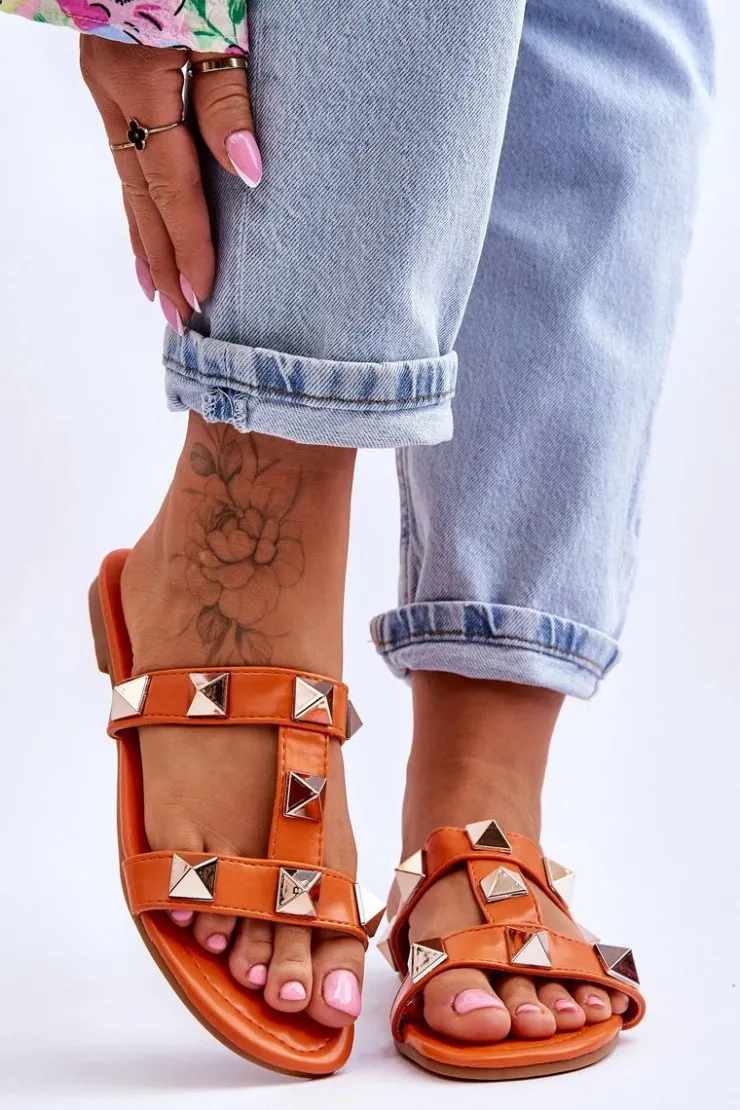 Damskie, klasyczne klapki zostały wykonane z eko skóry. Posiadają modne wycięcia na bokach. Dodatkowo zostały ozdobione dużymi ćwiekami. Klapki osadzono na płaskim obcasie z gumową, antypoślizgową podeszwą. Model ten z pewnością przypadnie do gustu każdej kobiecie podczas upalnych dni. Miękka, eko skórzana wkładka pozwoli na komfortowe użytkowanie obuwia nawet przez cały dzień. Przy wyborze rozmiaru prosimy sugerować się tabelą rozmiarów.