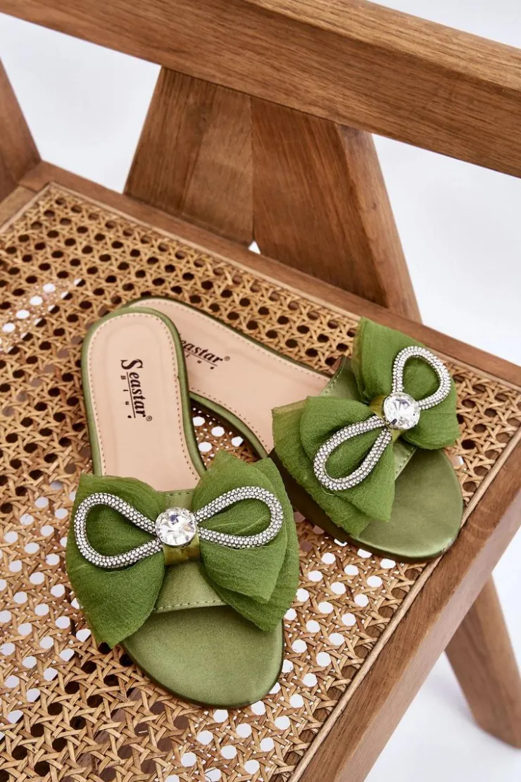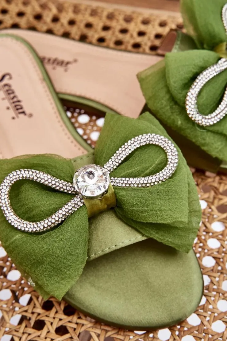 Wygodne klapki wykonane z materiału tekstylnego. Posiadają z przodu piękną kokardę z dodatkami w postaci dżetów imitujących cyrkonie. Miękka wkładka została wykonana z eko skóry. Buty te osadzono na płaskim obcasie. Model idealny na co dzień. Świetnie podkreśli wiele Twoich letnich stylizacji! Przy wyborze rozmiaru prosimy sugerować się tabelą rozmiarów.