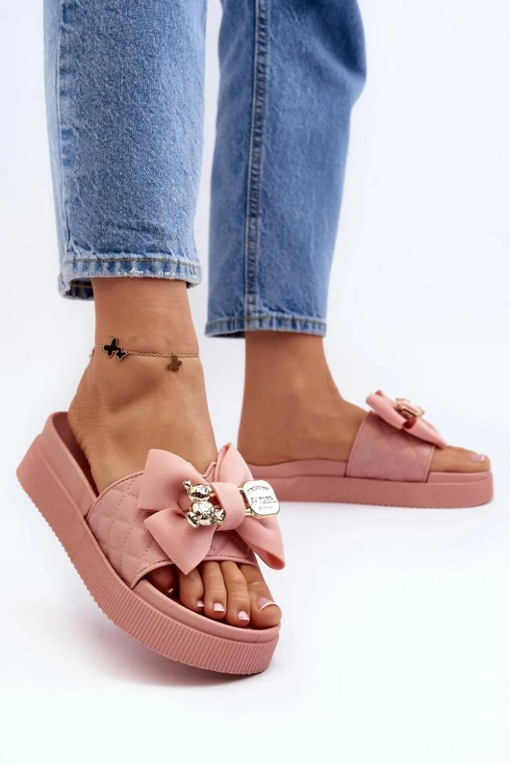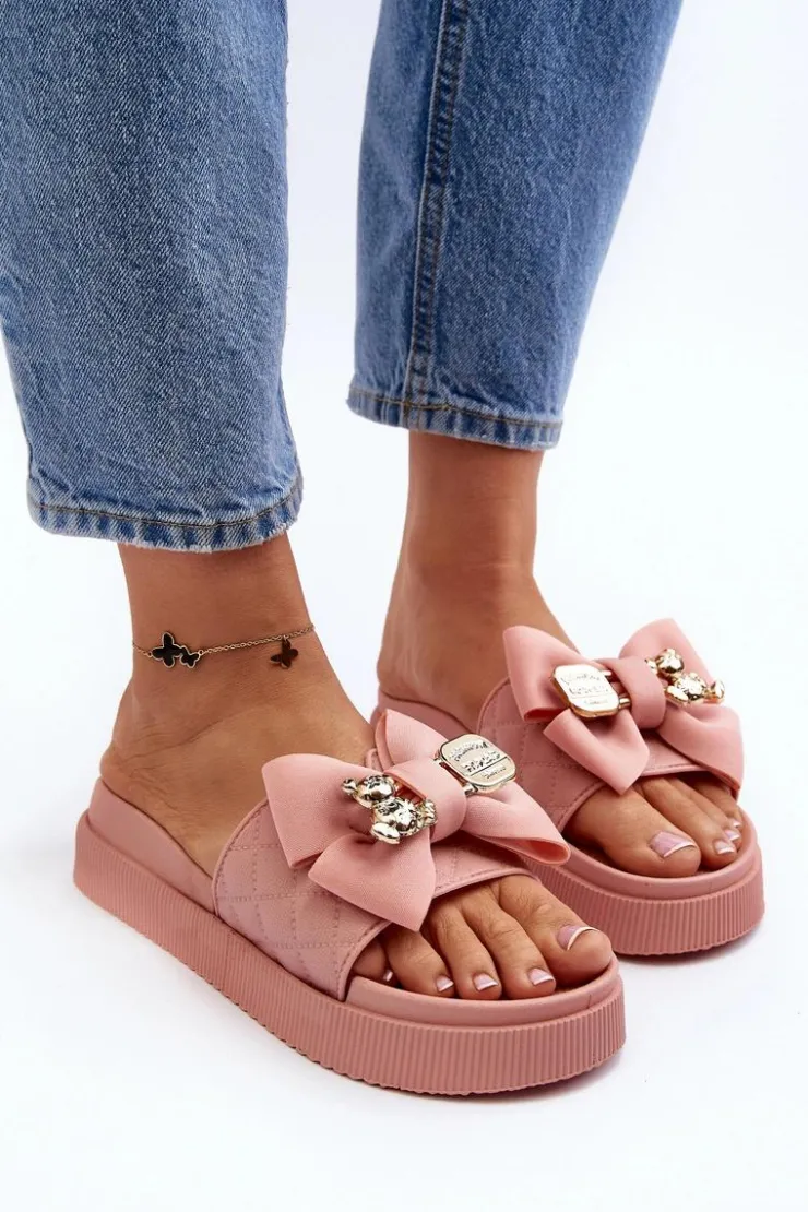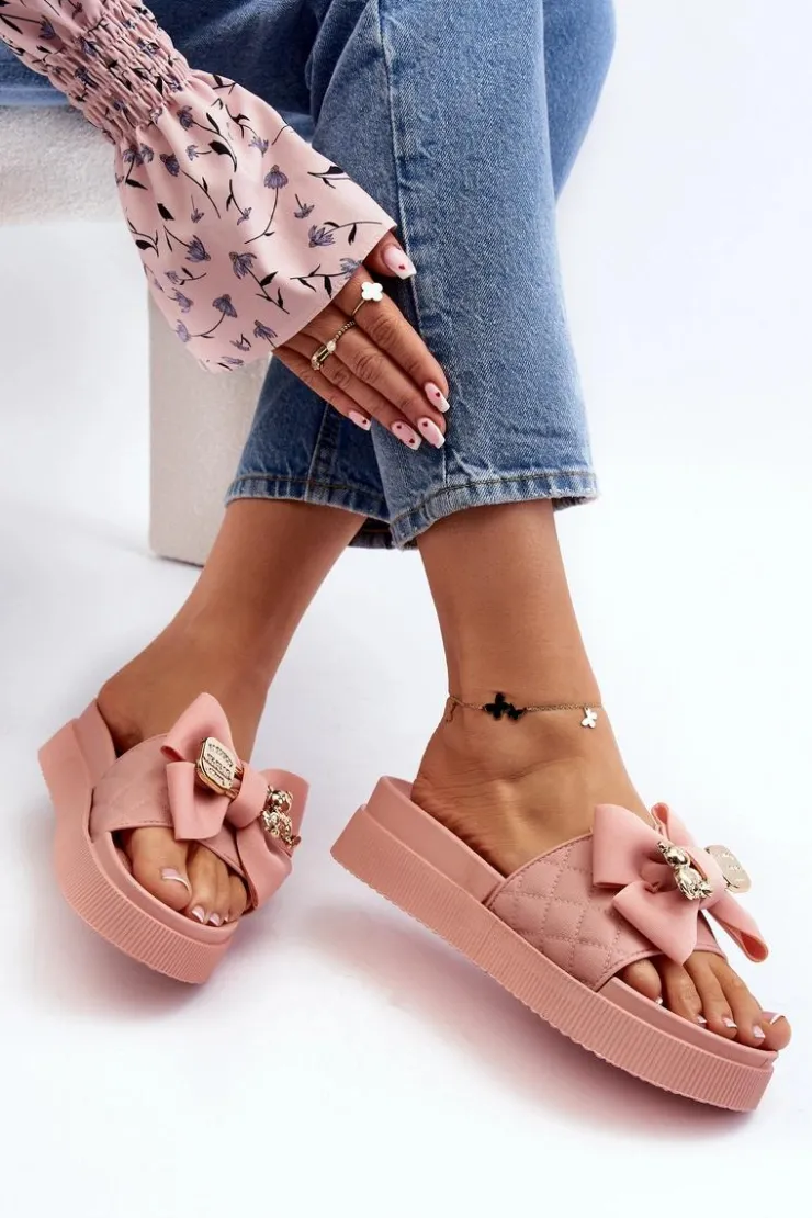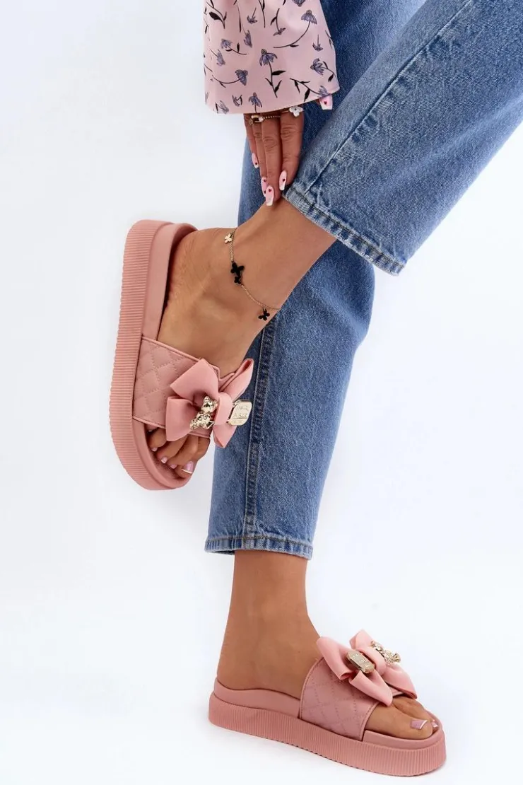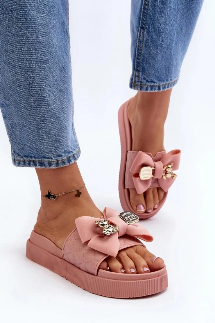 Damskie klapki wykonane z eko skóry. Osadzone na masywnej platformie. Model ten posiada materiałową kokardę i imitację agrafki z misiem i blaszką z napisem. Idealne klapki na nadchodzący sezon! Koniecznie powinnaś je mieć! Przy wyborze rozmiaru prosimy sugerować się tabelą rozmiarów.