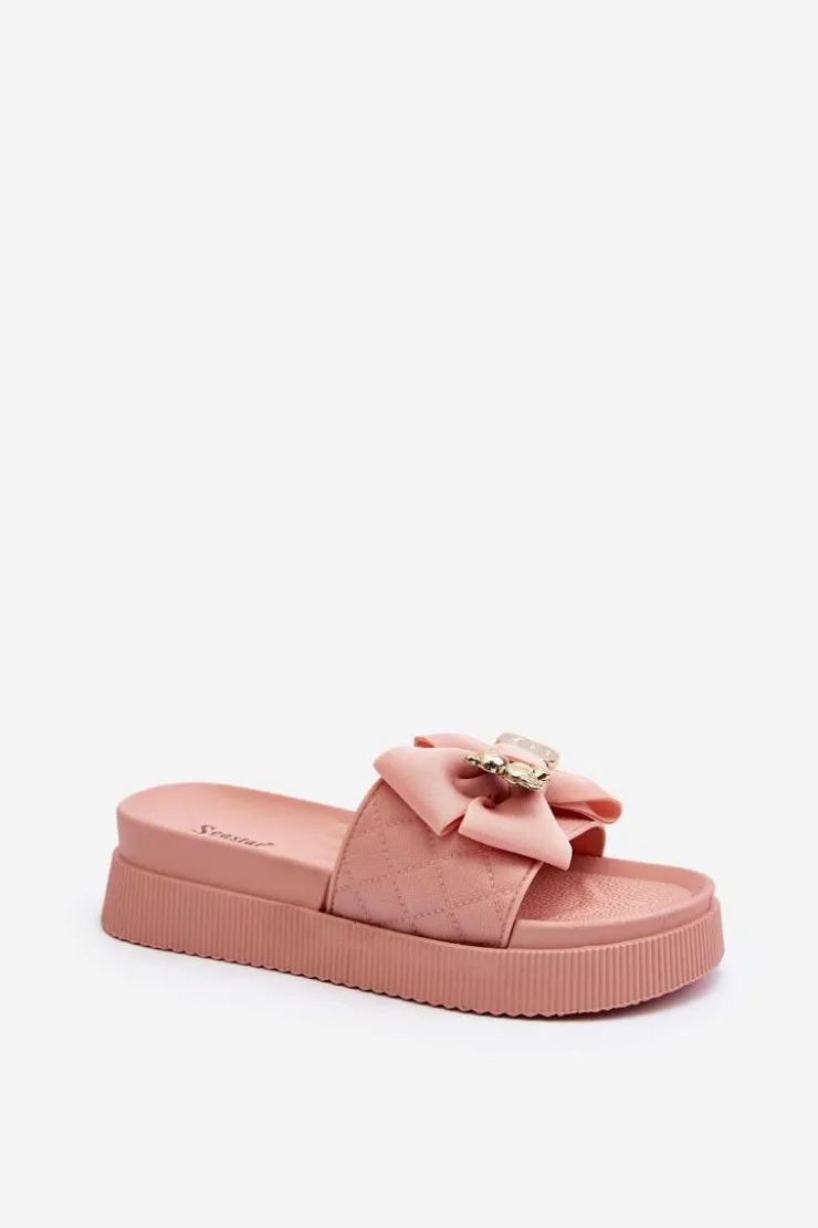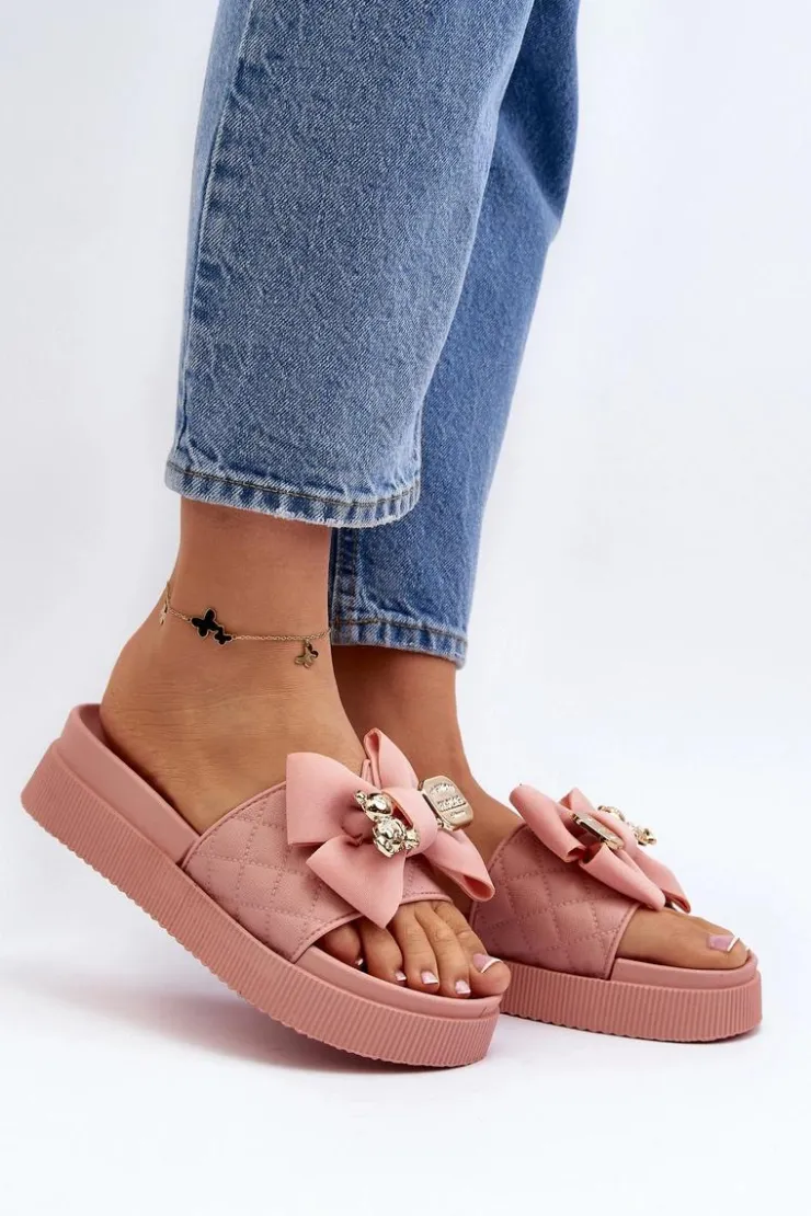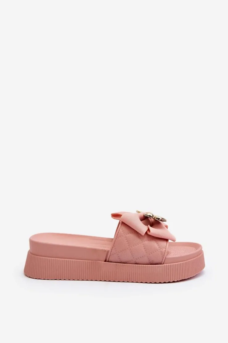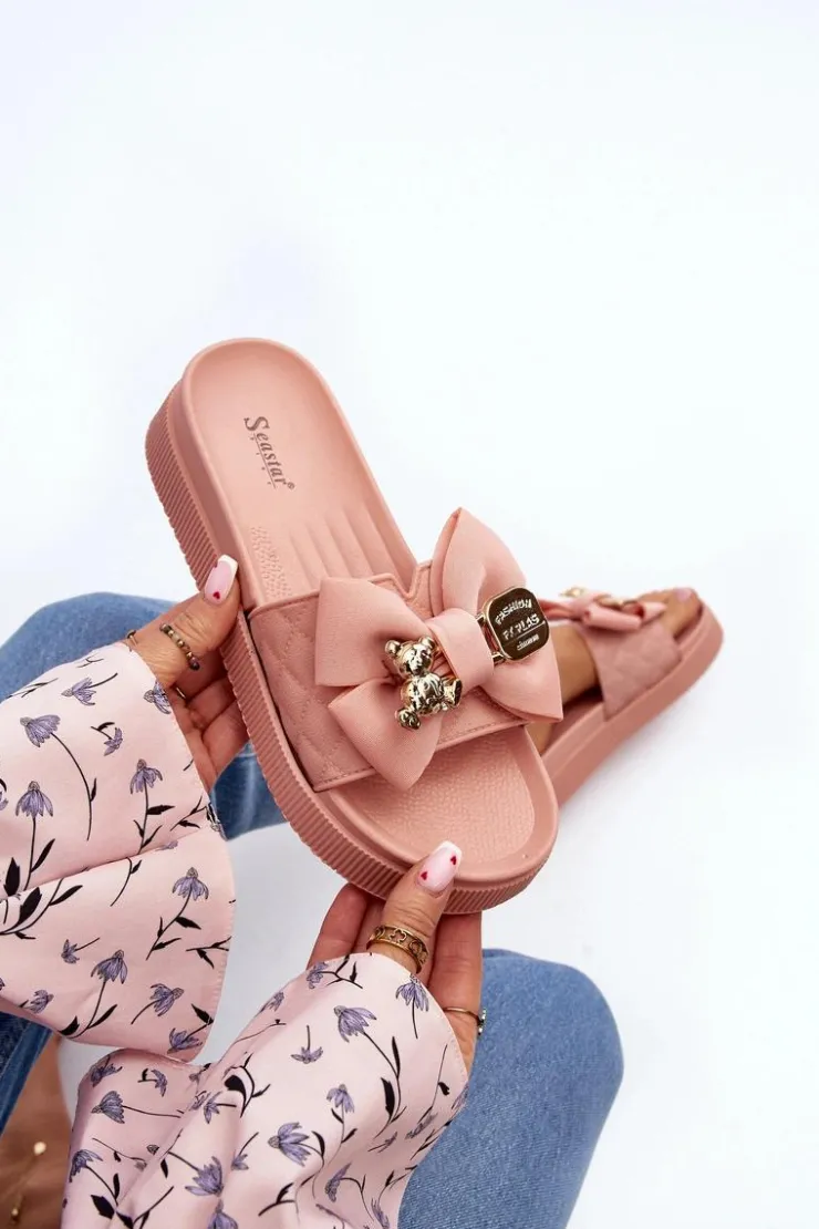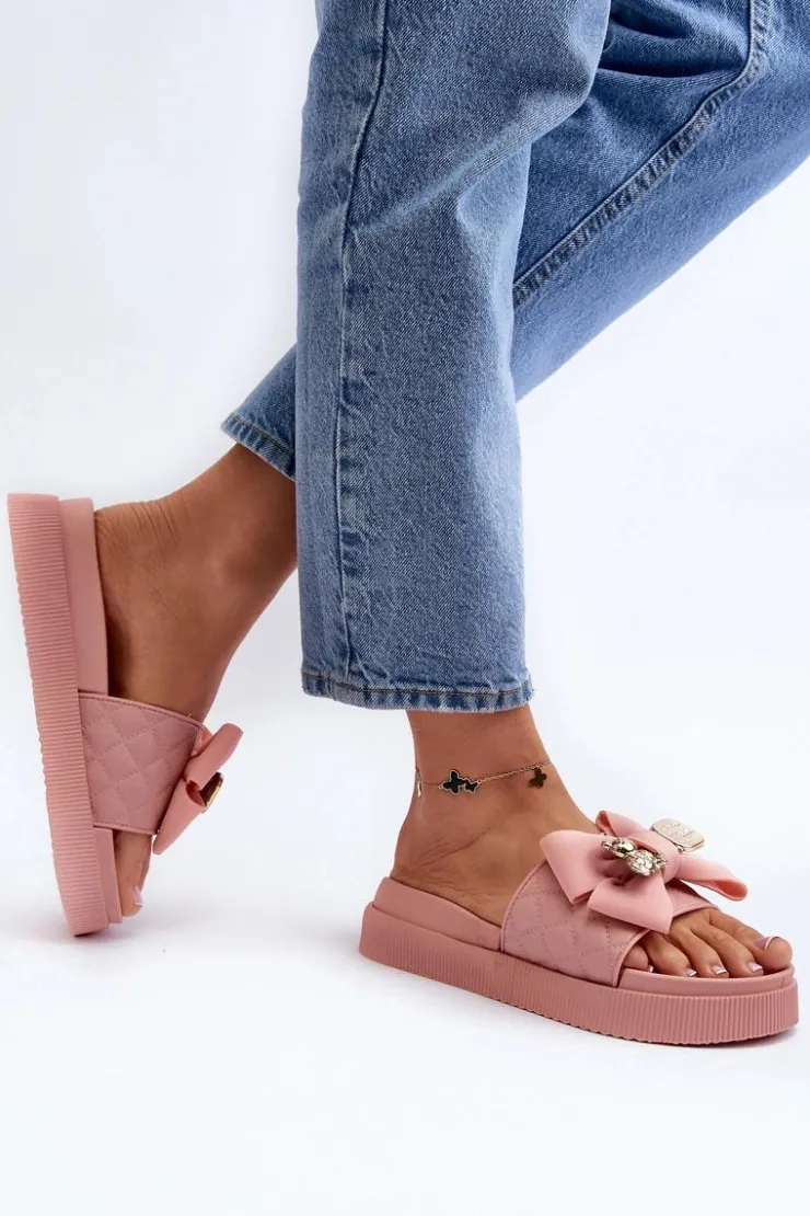 Damskie klapki wykonane z eko skóry. Osadzone na masywnej platformie. Model ten posiada materiałową kokardę i imitację agrafki z misiem i blaszką z napisem. Idealne klapki na nadchodzący sezon! Koniecznie powinnaś je mieć! Przy wyborze rozmiaru prosimy sugerować się tabelą rozmiarów.