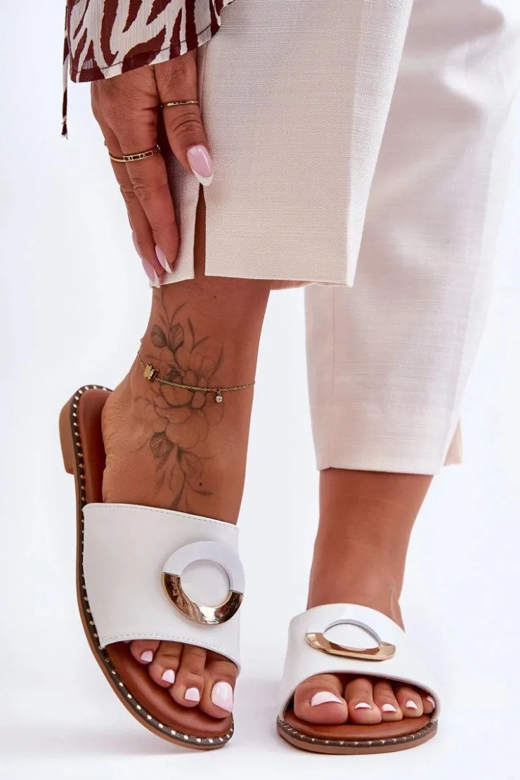 Damskie klapki zostały wykonane z eko skóry. Posiadają na przodzie ozdobę w postaci koła. Klapki osadzono na płaskim obcasie i antypoślizgowej, gumowej podeszwie. Wkładka jest niezwykle miękka i wygodna w użytkowaniu, co zwiększa komfort użytkowania. Nosek w tych klapkach jest odkryty i lekko zaokrąglony. Dodatkowo przy podeszwie znajdują się ozdobne ćwieki. Przy wyborze rozmiaru prosimy sugerować się tabelą rozmiarów.