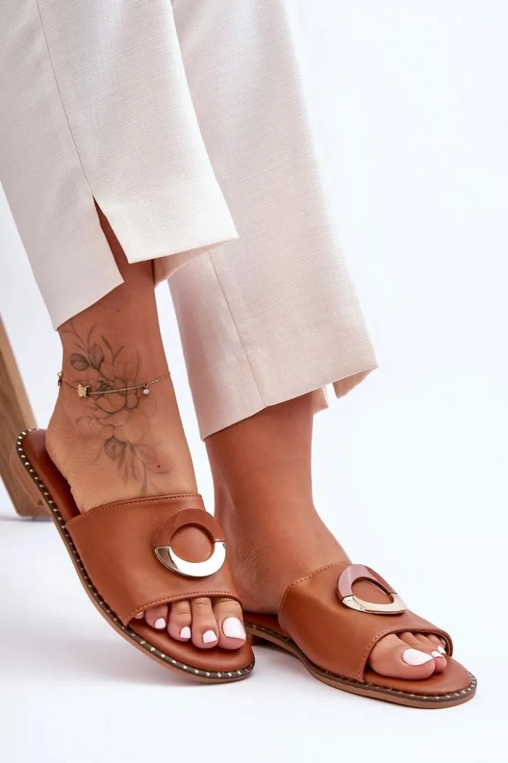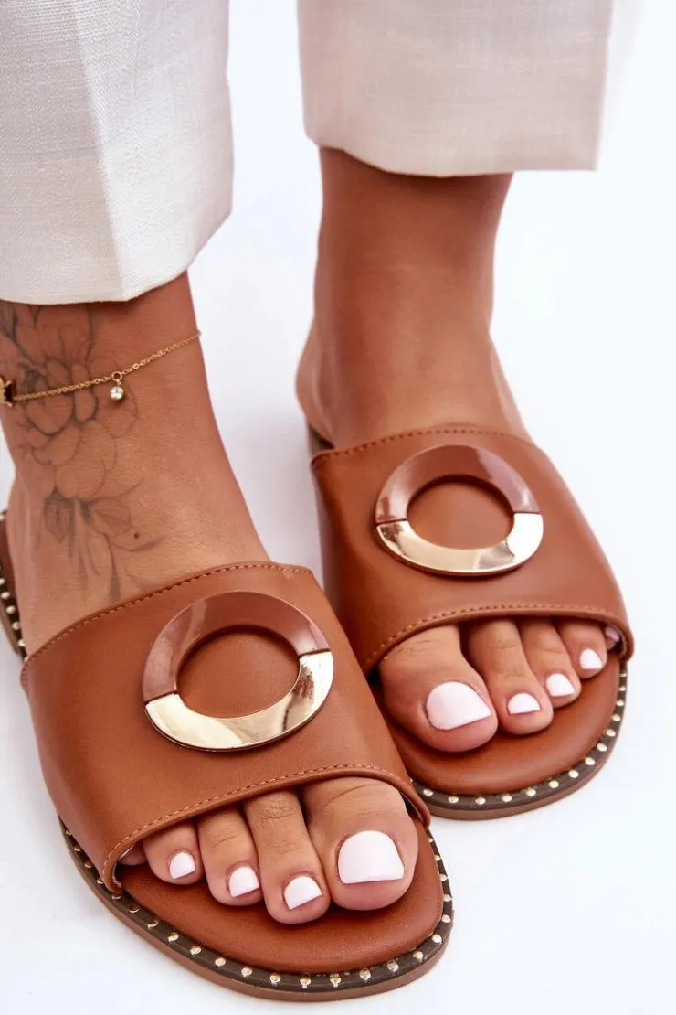 Damskie klapki zostały wykonane z eko skóry. Posiadają na przodzie ozdobę w postaci koła. Klapki osadzono na płaskim obcasie i antypoślizgowej, gumowej podeszwie. Wkładka jest niezwykle miękka i wygodna w użytkowaniu, co zwiększa komfort użytkowania. Nosek w tych klapkach jest odkryty i lekko zaokrąglony. Dodatkowo przy podeszwie znajdują się ozdobne ćwieki. Przy wyborze rozmiaru prosimy sugerować się tabelą rozmiarów.