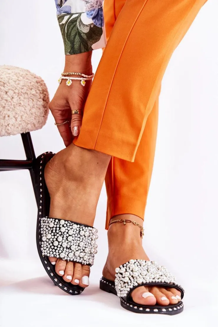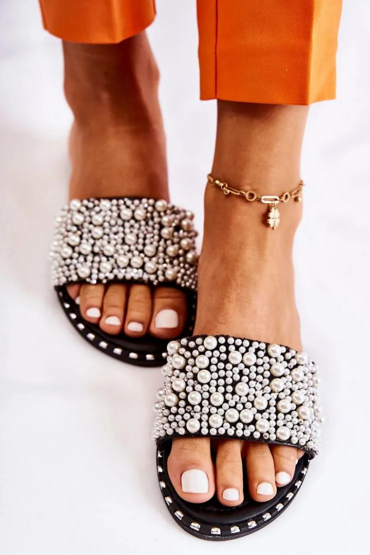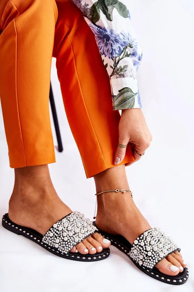 Eleganckie klapki damskie wykonane z eko skóry. Posiadają ozdoby na przednim pasku w postaci imitacji perełek oraz cyrkonii. Klapki posiadają wokół podeszwy dekoracyjne ćwieki. Miękka wkładka wykonana z eko skóry, która jest dodatkowo pikowana. Nosek odkryty, zaokrąglony. Osadzone na płaskim obcasie. Podeszwa wykonana z gumowego tworzywa, która jest dodatkowo antypoślizgowa. Solidny model, idealny na letnie dni! Przy wyborze rozmiaru prosimy sugerować się tabelą rozmiarów.