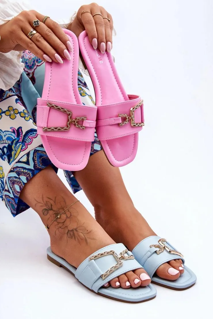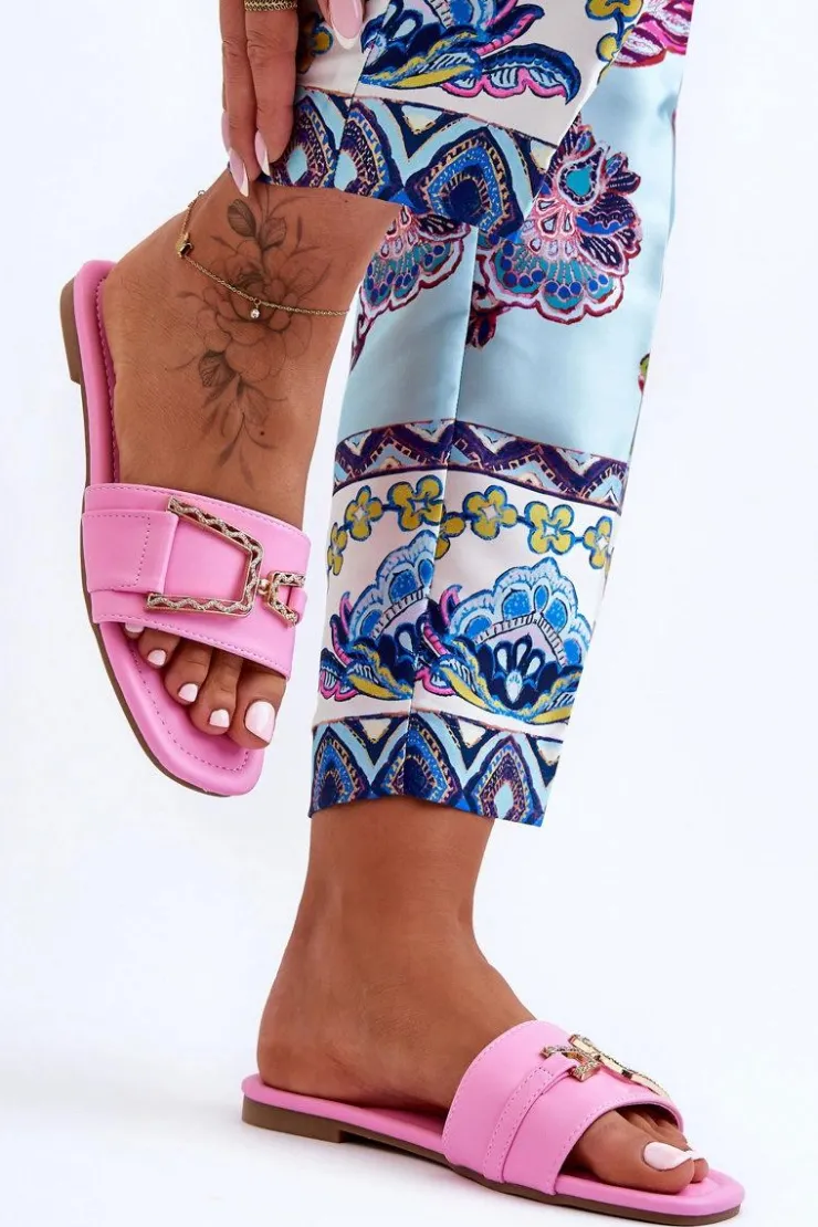 Damskie klapki zostały wykonane z eko skóry. Posiadają na przodzie ozdobę z tworzywa sztucznego z dżetami imitującymi cyrkonie. Klapki osadzono na delikatnym, płaskim obcasie. Wkładka jest wygodna w użytkowaniu i została wykonana z eko skóry. Nosek w tym obuwiu jest odkryty i lekko kwadratowy. Ten model powinien być Twój! Przy wyborze rozmiaru prosimy sugerować się tabelą rozmiarów.