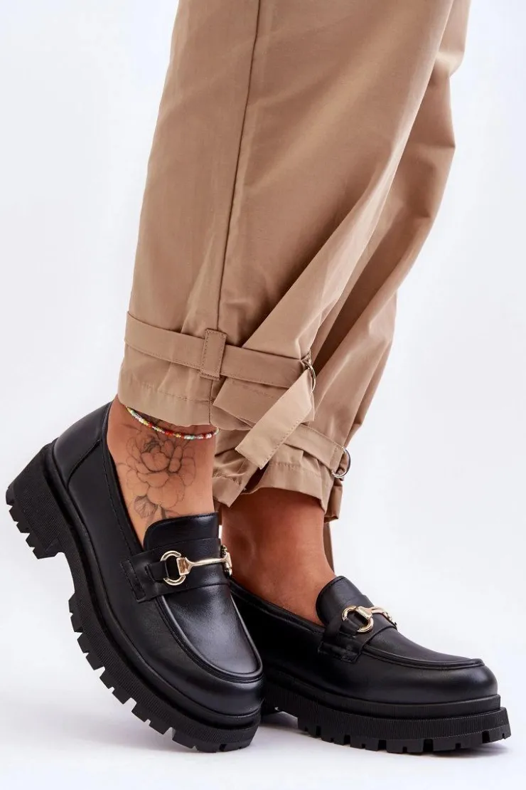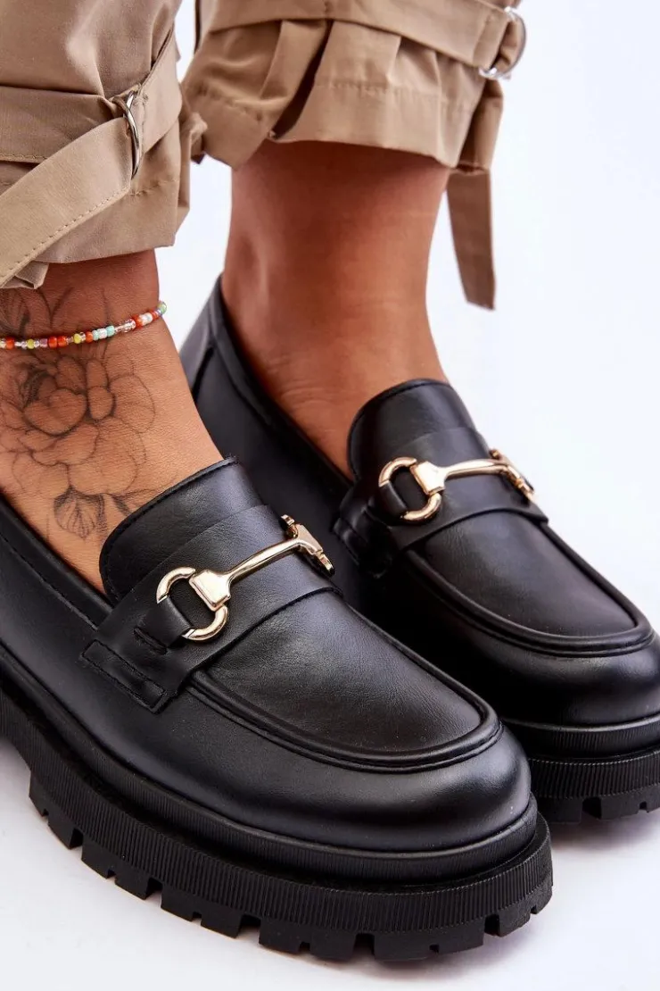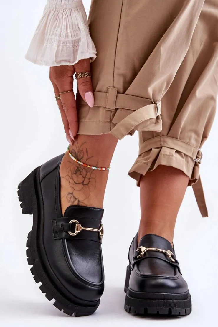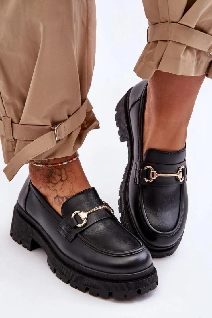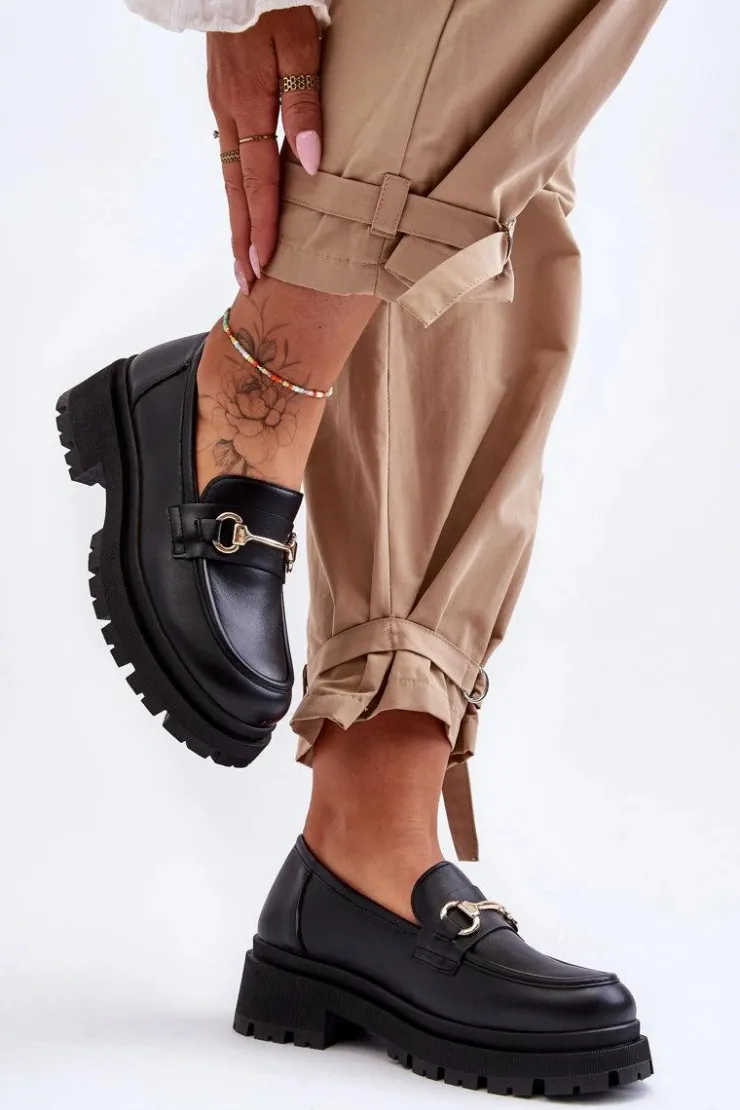 Te cudowne, damskie mokasyny osadzono na masywnej platformie i płaskim obcasie. Świetnie wpasują się w wiele stylizacji wiosenno-jesiennych. Mokasyny zostały wykonane z eko skóry. Posiadają delikatnie usztywniany zapiętek oraz miękką wkładkę. Na pasku z przodu znajduje się ozdoba z tworzywa sztucznego. Przy wyborze rozmiaru prosimy sugerować się tabelą rozmiarów.