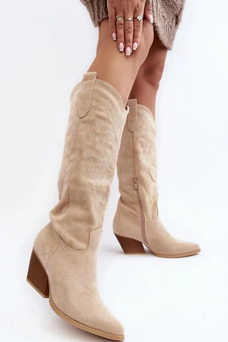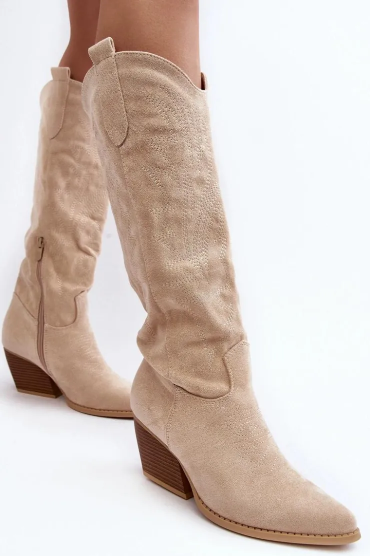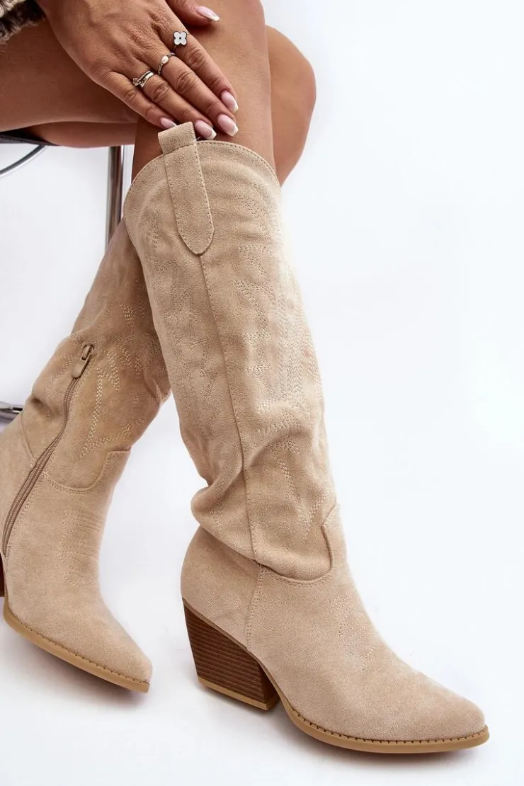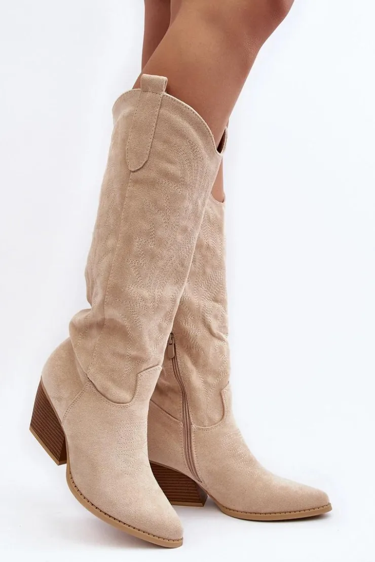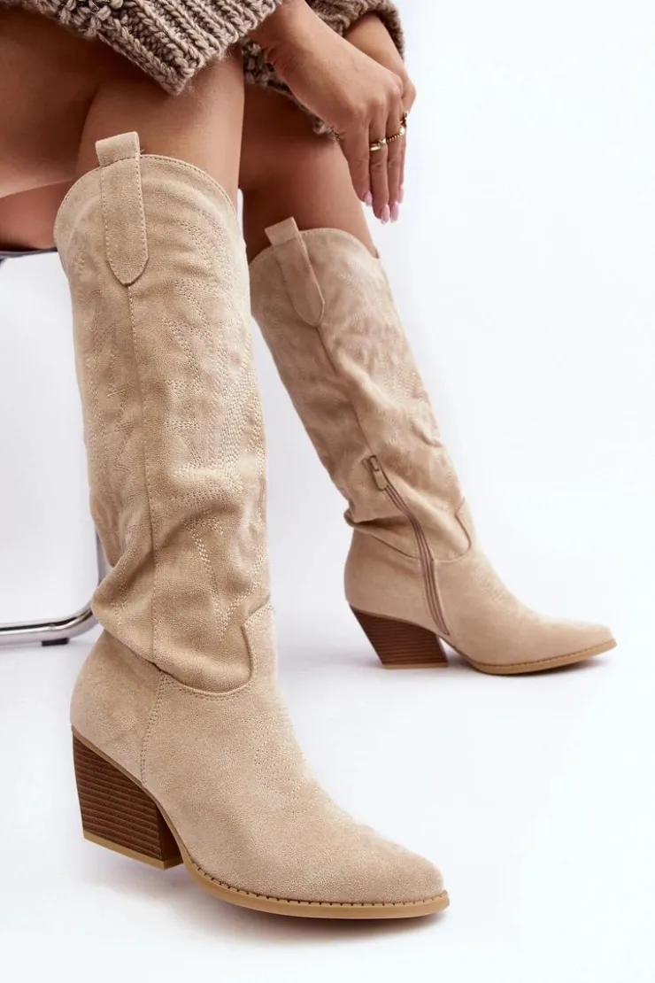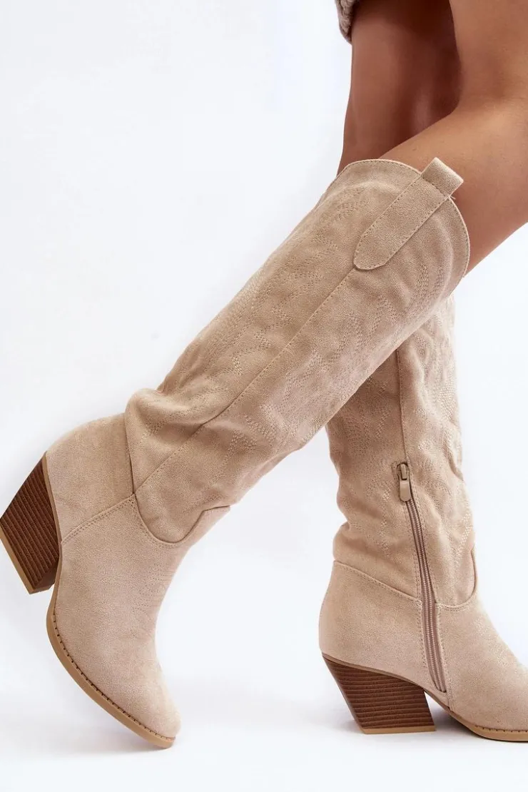 Damskie kozaki przed kolano wykonane z eko zamszu. Osadzone na obcasie w postaci niskiego słupka. Noski w szpic optycznie wysmuklą nogi. Zapiętek jest usztywniony. Miękka wkładka zapewni komfort podczas użytkowania. Cholewka ozdobiona licznymi przeszyciami. Model wsuwany z dodatkowym suwakiem. Świetnie sprawdzą się podczas jesiennych stylizacji! Przy wyborze rozmiaru prosimy sugerować się tabelą rozmiarów.