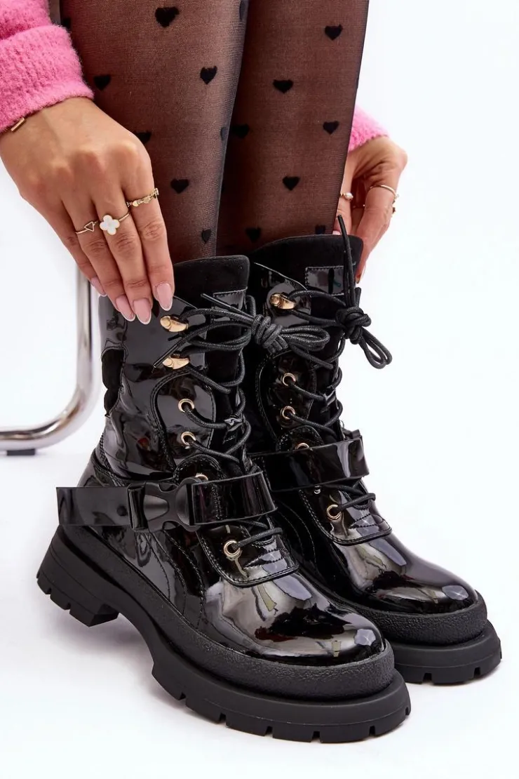 Damskie botki w stylu workerów zostały wykonane z eko skóry. Osadzone na płaskim obcasie oraz platformie ze żłobieniami. Model klasycznie sznurowany. Cholewka ozdobiona paskiem. Noski zaokrąglone. Zapiętek usztywniony. Ten model na pewno wykorzystasz w wielu stylizacjach! Przy wyborze rozmiaru prosimy sugerować się tabelą rozmiarów.