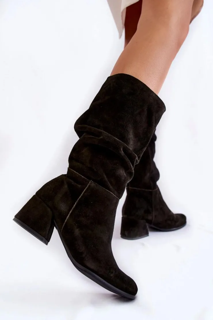 Buty marszczone. Damskie kozaki zostały wykonane z wysokiej jakości naturalnych skór. Model ten jest wsuwany. Kozaki osadzono na niskim obcasie w postaci szerszego słupka. Nie posiadają ocieplenia. Dodatkowo zapiętek jest usztywniany. Cholewka przyozdobiona delikatnymi marszczeniami. Ten model świetnie będzie prezentować się ze spódniczkami i krótkimi sukienkami. Przy wyborze rozmiaru prosimy sugerować się tabelą rozmiarów.