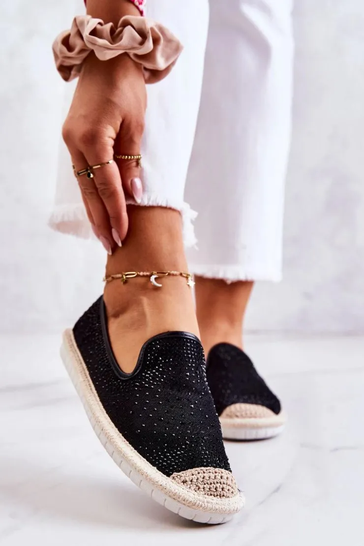 Klasyczne espadryle w nowoczesnym wydaniu! Wykonane z przewiewnego materiału tekstylnego z dżetami imitującymi cyrkonie. Osadzone na płaskiej podeszwie wykonanej z gumowego tworzywa. Dodatkowo są antypoślizgowe. Miękka, eko skórzana wkładka zapewni komfortowe użytkowanie. Przy podeszwie oraz na nosku znajduje się ozdobna plecionka. Model wsuwany, który wykorzystasz do wielu stylizacji! Koniecznie powinnaś je mieć! Podczas wyboru rozmiaru prosimy sugerować się tabelą rozmiarów.