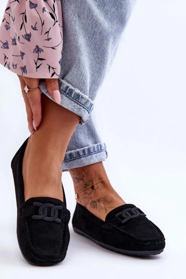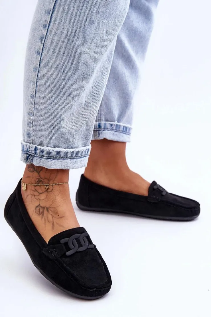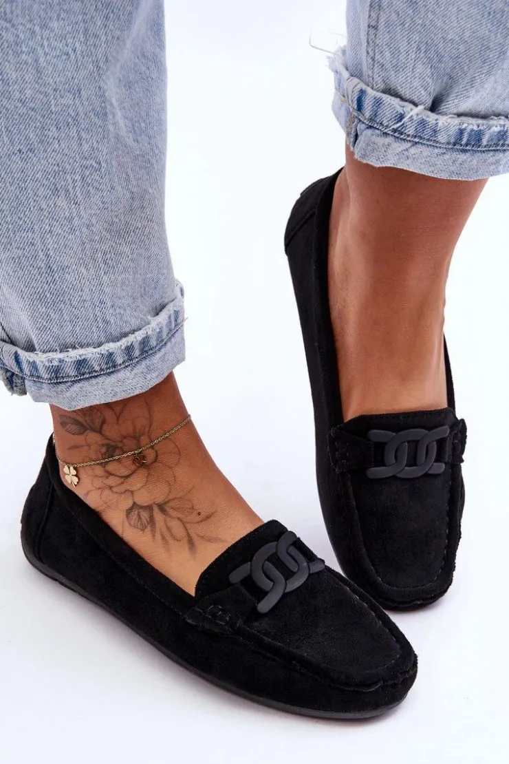 Damskie mokasyny powinny znaleźć się w każdej kobiecej szafie! Ten model został wykonany z miłego w dotyku eko zamszu. Na przodzie znajduje się ozdoba z tworzywa sztucznego. Mokasyny osadzono na antypoślizgowej podeszwie. Miękka wkładka z eko skóry zapewni komfort podczas użytkowania obuwia. Dodatkowo jest delikatnie perforowana. Przy wyborze rozmiaru prosimy sugerować się tabelą rozmiarów.