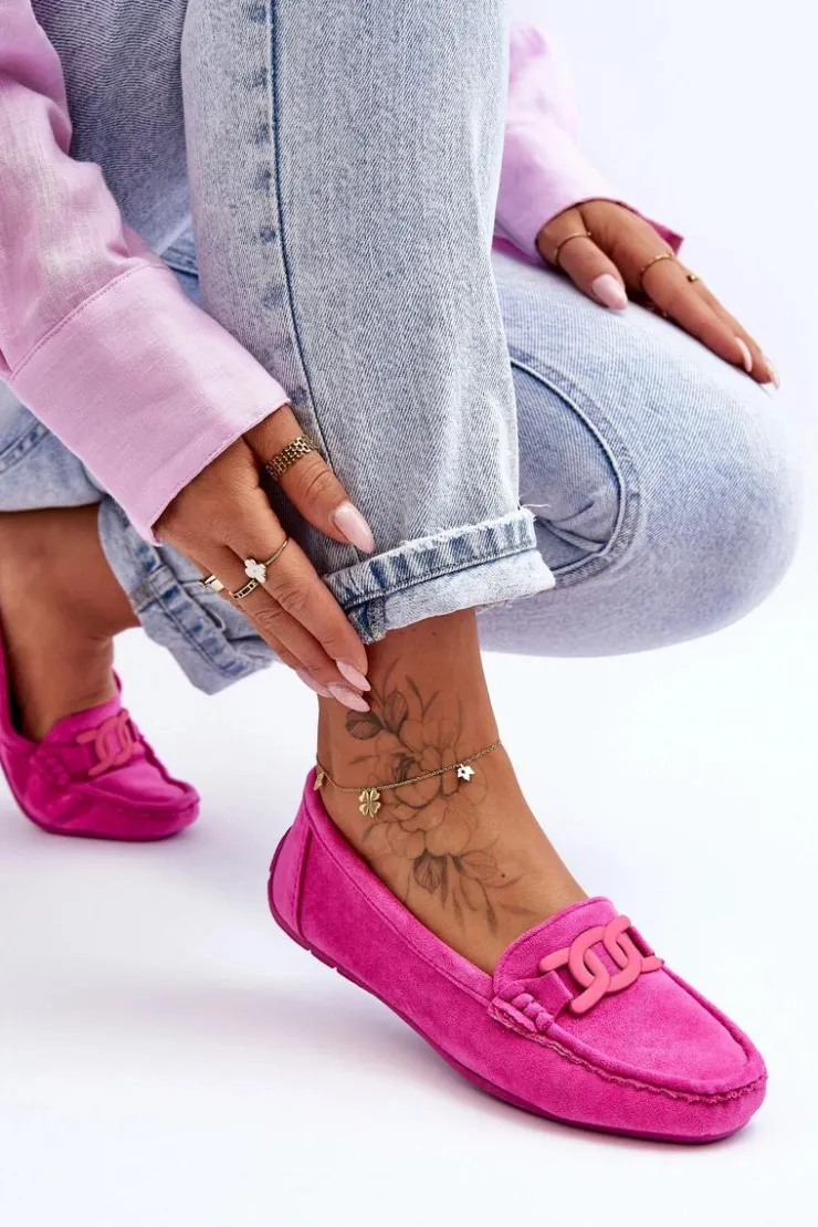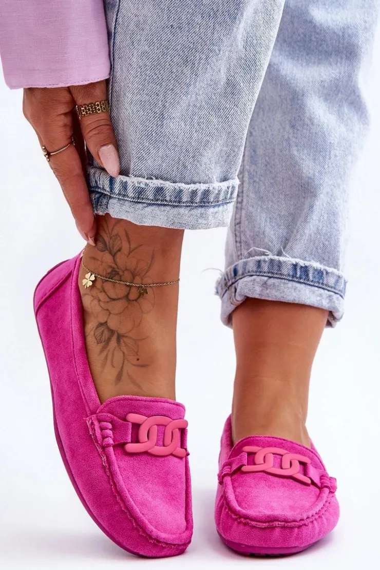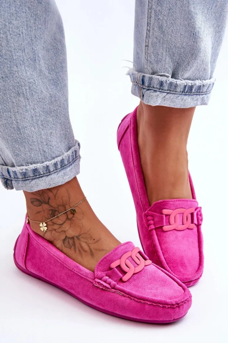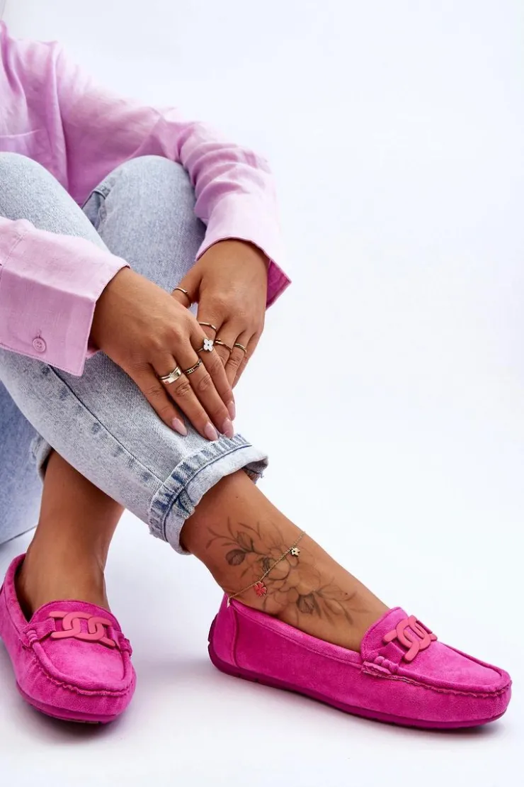 Damskie mokasyny powinny znaleźć się w każdej kobiecej szafie! Ten model został wykonany z miłego w dotyku eko zamszu. Na przodzie znajduje się ozdoba z tworzywa sztucznego. Mokasyny osadzono na antypoślizgowej podeszwie. Miękka wkładka z eko skóry zapewni komfort podczas użytkowania obuwia. Dodatkowo jest delikatnie perforowana. Przy wyborze rozmiaru prosimy sugerować się tabelą rozmiarów.