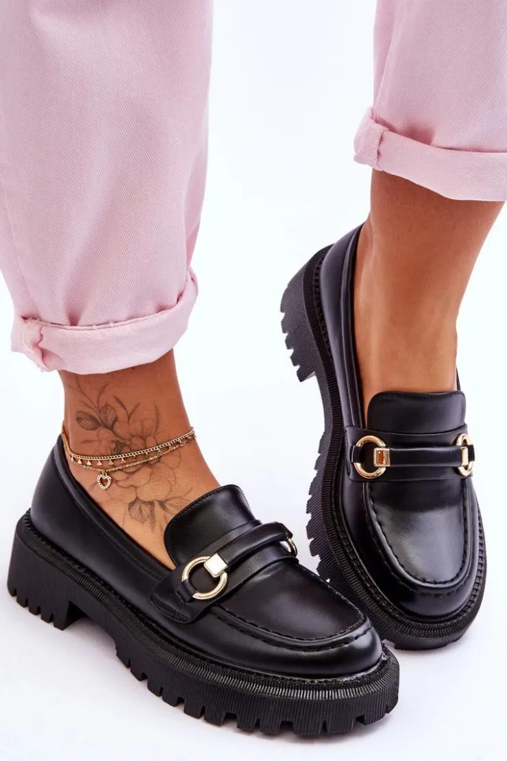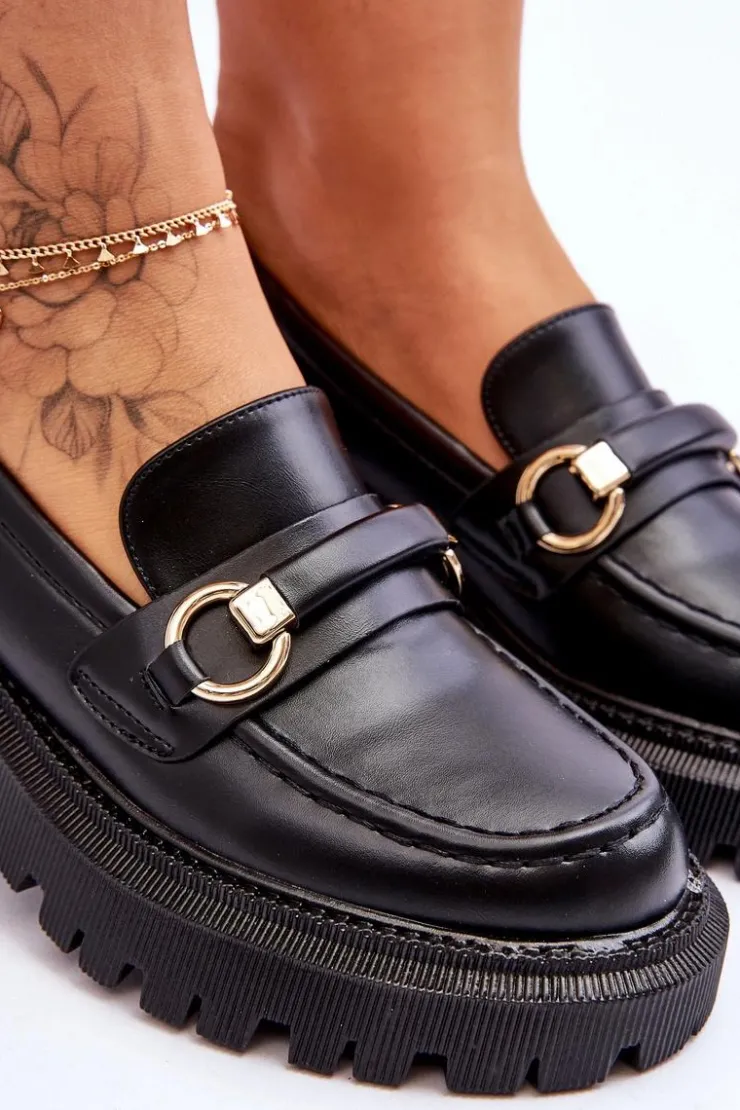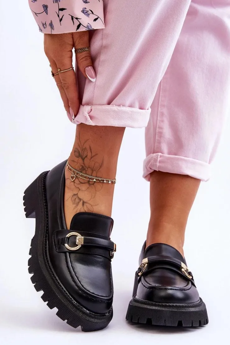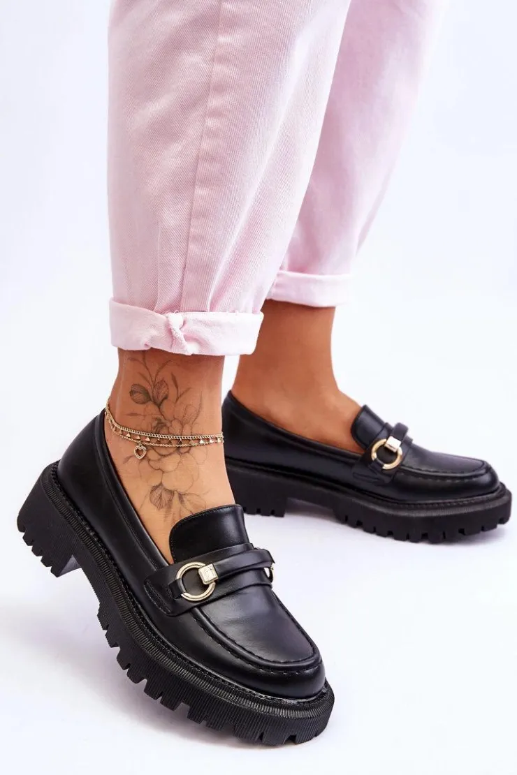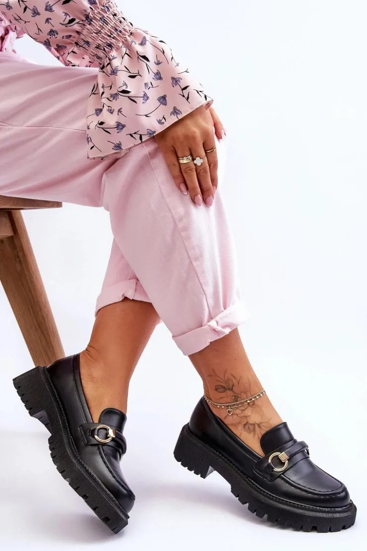 Damskie mokasyny osadzone na masywnej platformie i płaskim obcasie świetnie wpasują się w wiele stylizacji! To obuwie jest idealne na wiele sezonów! Mokasyny zostały wykonane z eko skóry. Posiadają delikatnie usztywniany zapiętek. Na pasku znajduje się ozdoba. Mokasyny posiadają także eko skórzaną wkładkę. Przy wyborze rozmiaru prosimy sugerować się tabelą rozmiarów.