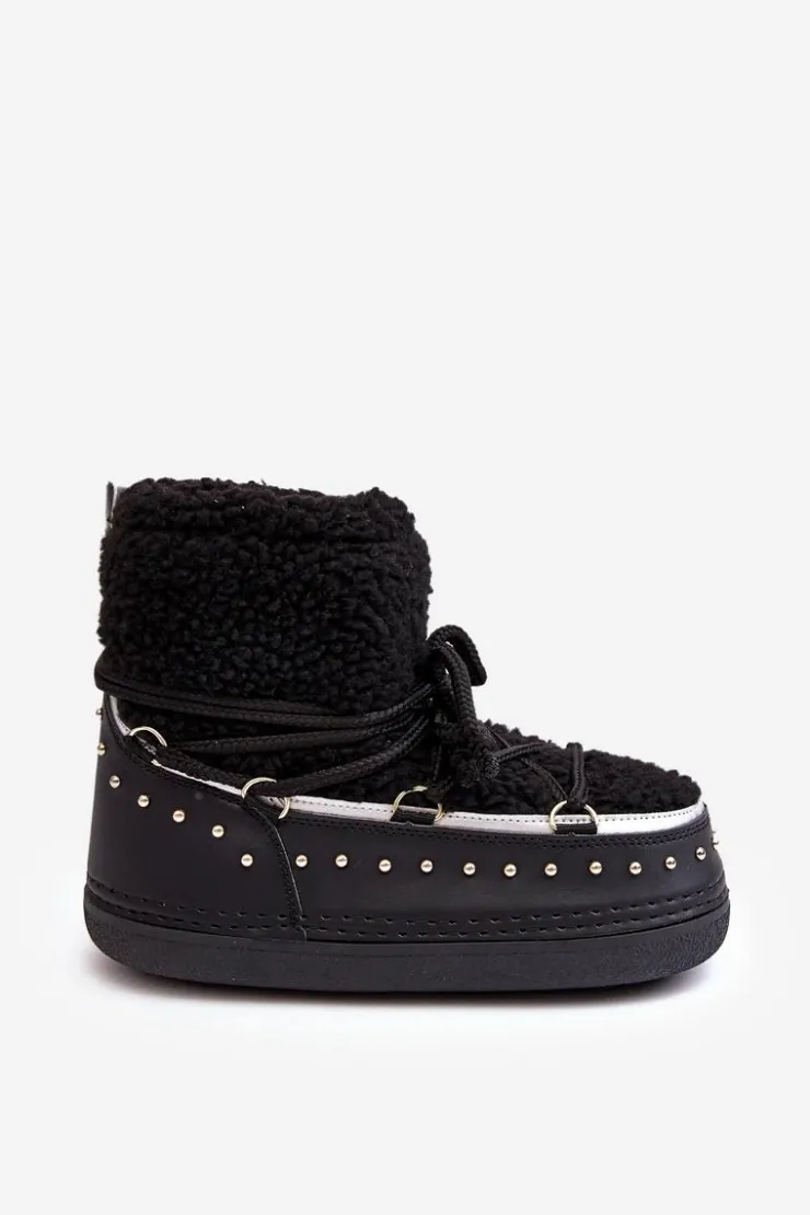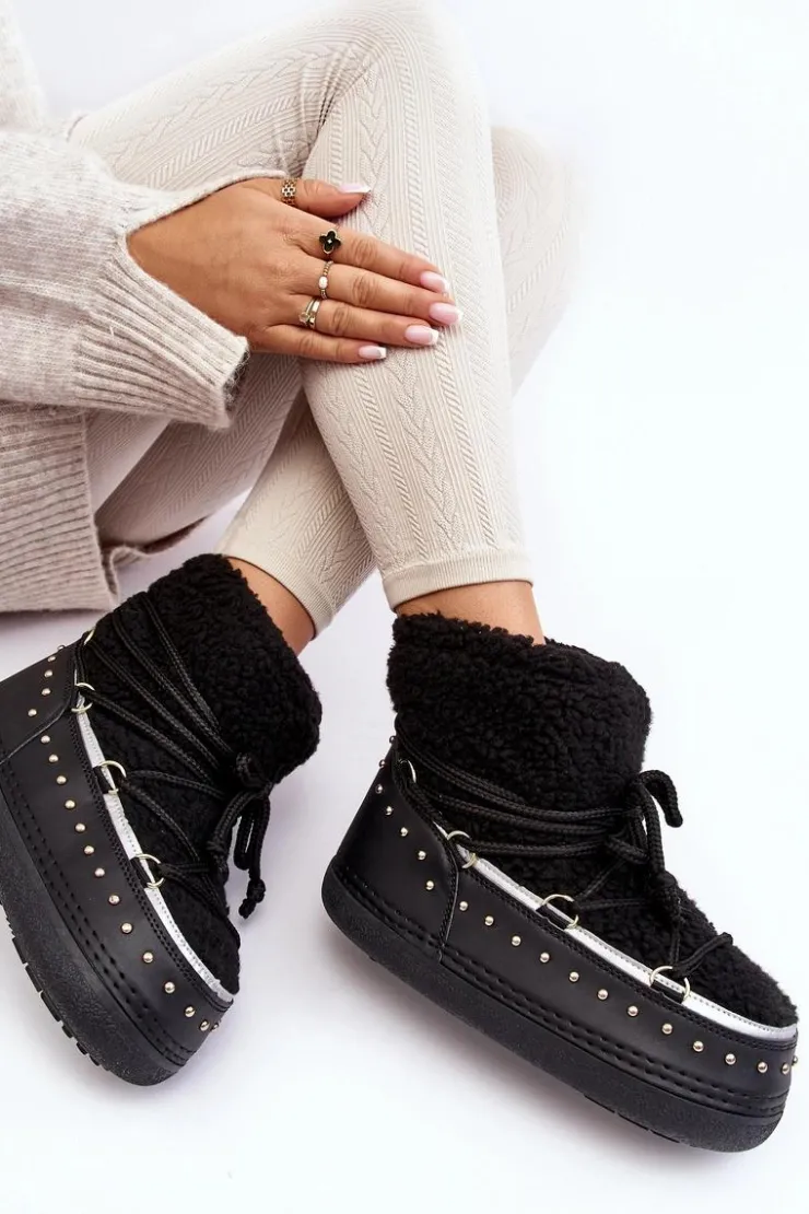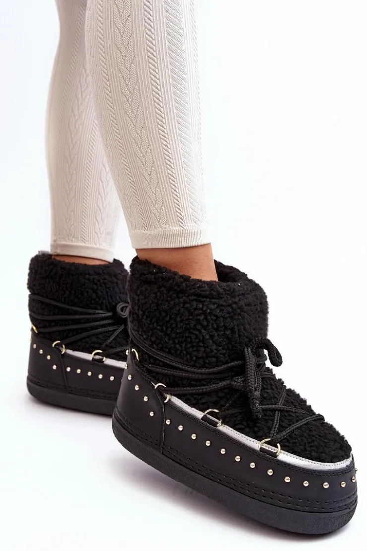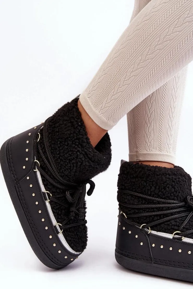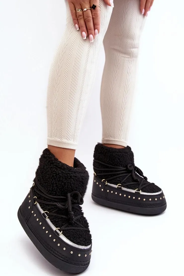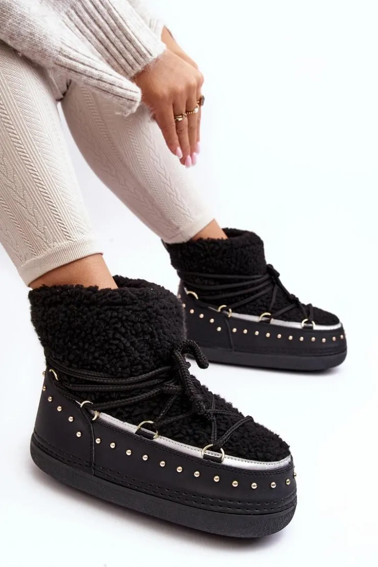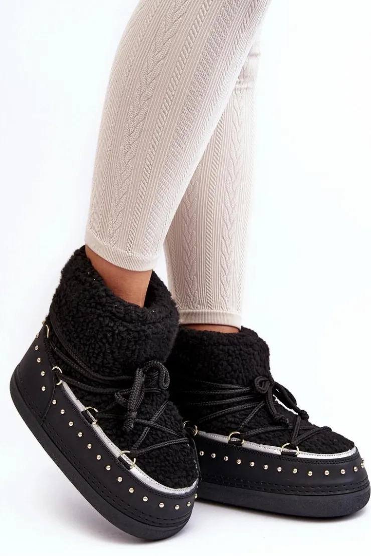 Wyjątkowe, damskie śniegowce zostały wykonane z materiału odpornego na zimno i wiatr. Cholewka ze sztucznym kożuszkiem i ćwiekami świetnie sprawdzi się w sezonie jesienno-zimowym. Model klasycznie wsuwany z dodatkowym sznurowaniem. Śniegowce zostały osadzone na masywnej platformie. Posiadają w środku ocieplenie w postaci pianki i koca obuwniczego, które zapewniają wysoką ochronę w chłodne dni. Przy wyborze rozmiaru prosimy sugerować się tabelą rozmiarów.