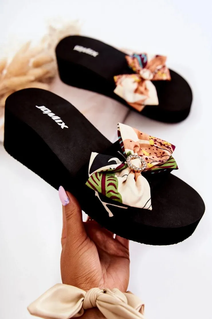Klasyczne klapki damskie osadzone na koturnie oraz platformie. Pasek wraz z kokardą wykonane z materiału tekstylnego. Podeszwa wraz z koturnem zostały wykonane z piankowego tworzywa. Fason, który na pewno spodoba się niejednej miłośniczce modowych inspiracji! Kokarda została przyozdobiona elementem z tworzywa sztucznego z dżetami imitującymi cyrkonie. Przy wyborze rozmiaru prosimy sugerować się tabelą rozmiarów.
