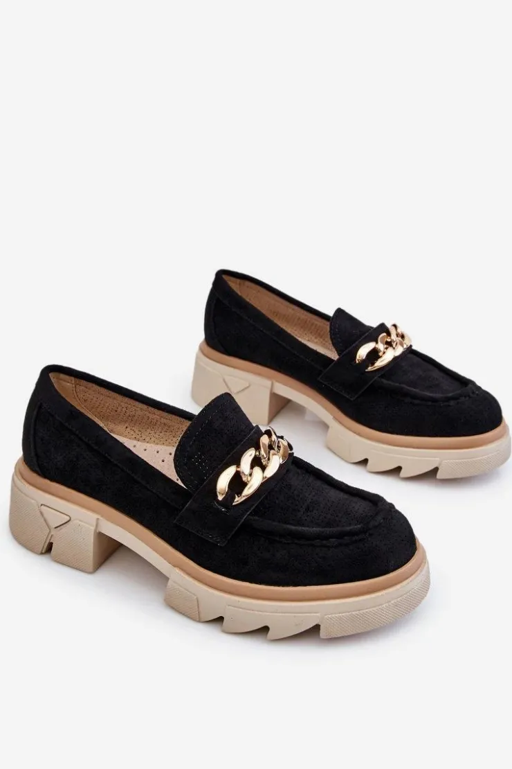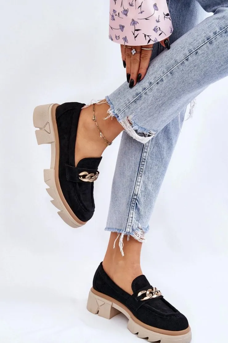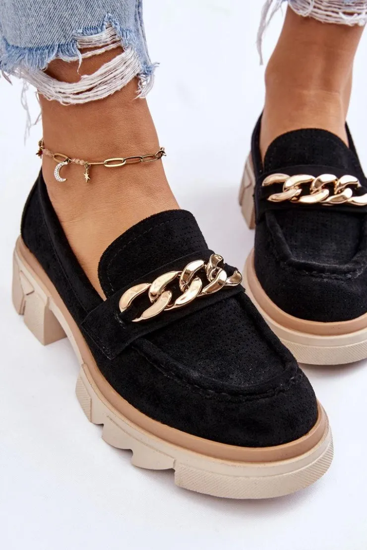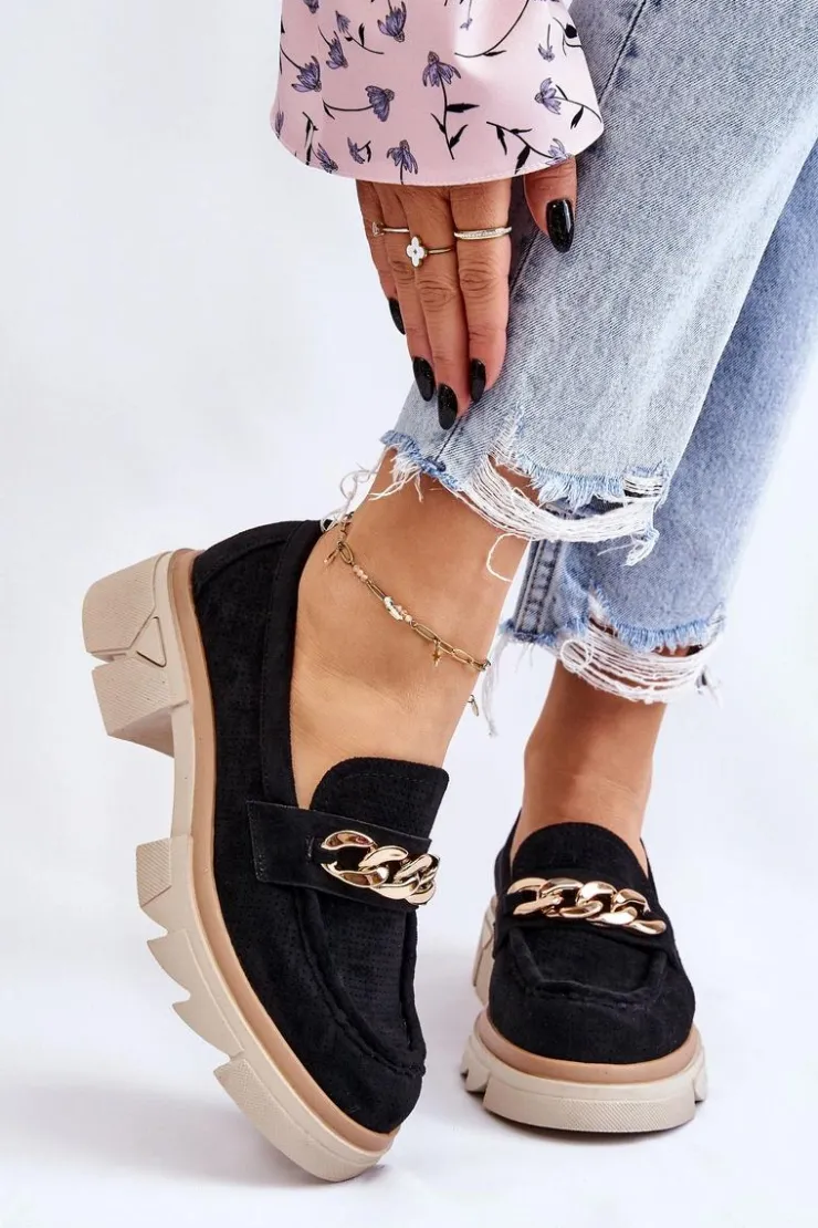 Damskie półbuty w stylu mokasynów zostały osadzone na masywnym, płaskim obcasie i platformie. Ozdobione eleganckim łańcuchem z przodu buta. Wykonane z materiału przypominającego eko zamsz. Miękka wkładka z naturalnej skóry zapewni wygodę podczas użytkowania. Cholewka w ażurowy wzór. Idealny model do wielu stylizacji! Przy wyborze rozmiaru prosimy sugerować się tabelą rozmiarów.