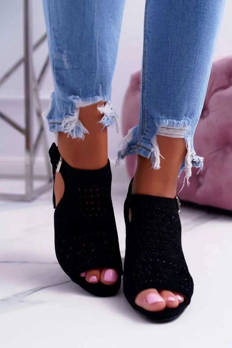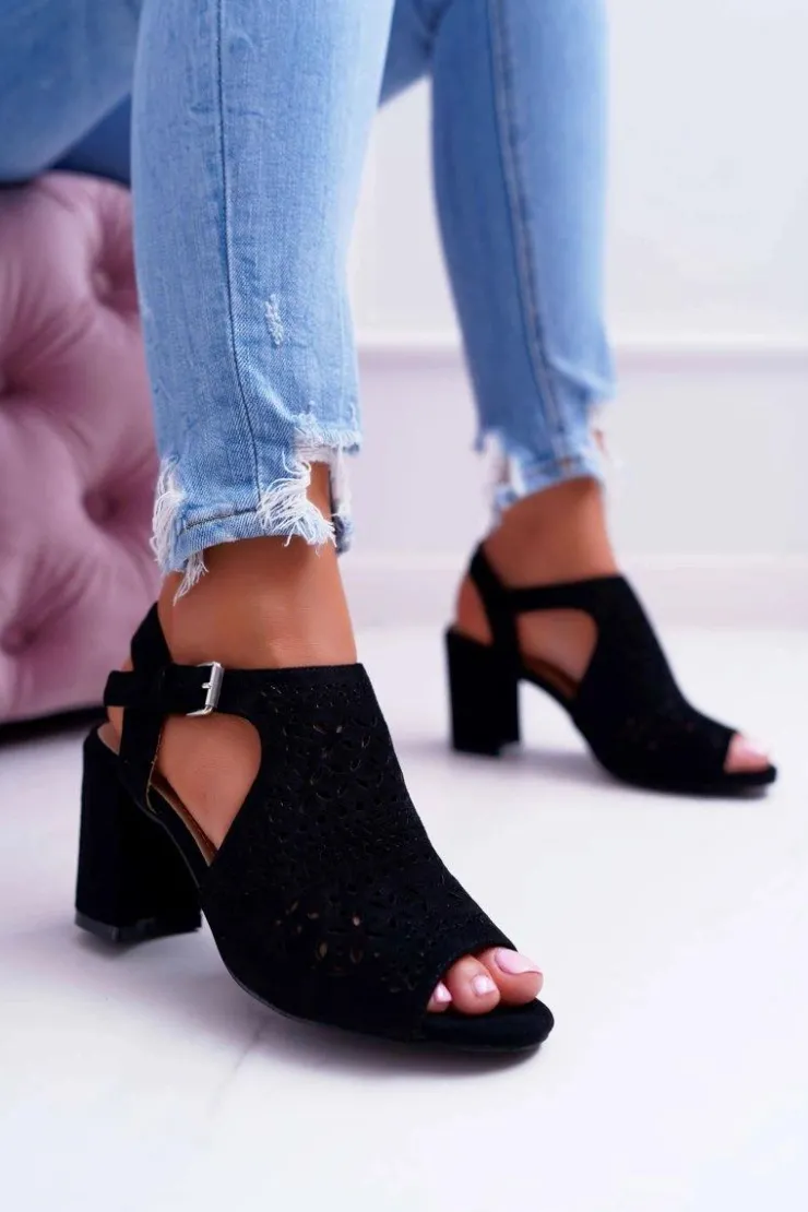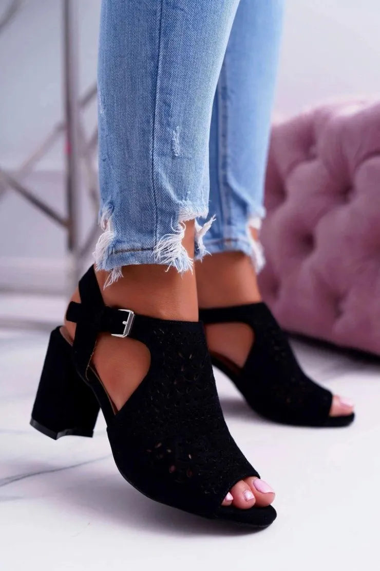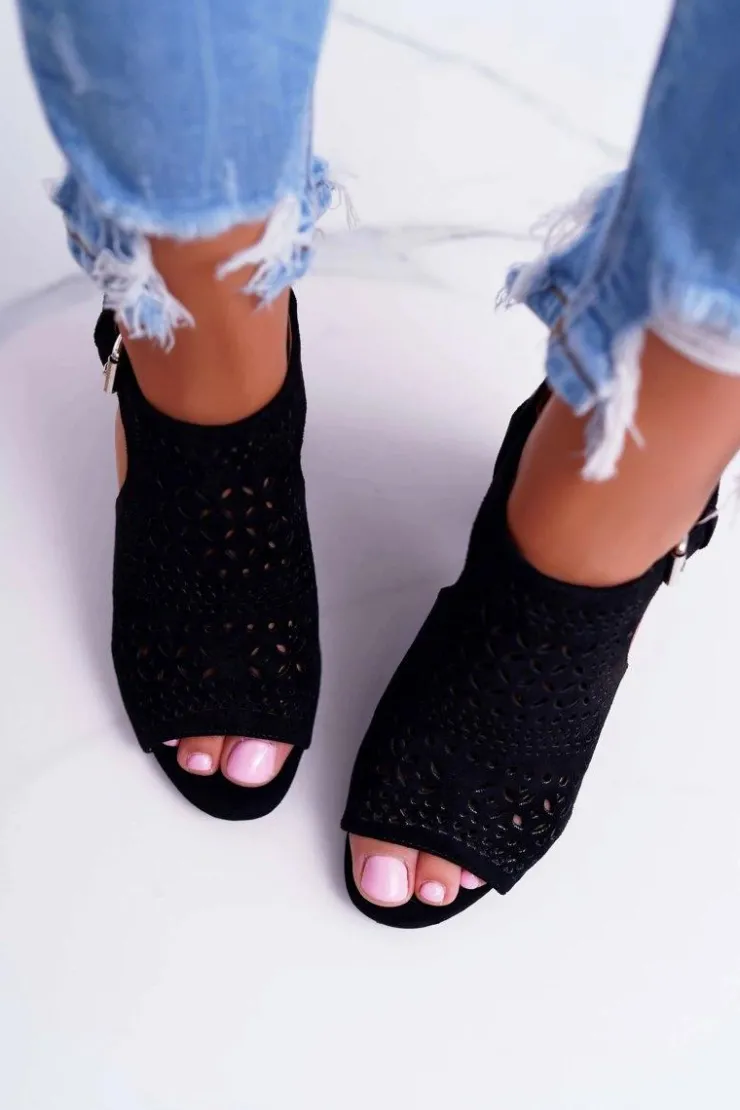 Modne sandały damskie wykonane z eko-zamszu. Ażurowe wykończenie, nosek w tylu peep toe oraz stabilny słupek. Te buty mają wszystko o czym zawsze marzyłyśmy. Idealne dopasowanie dzięki wszytej gumce. Przy wyborze rozmiaru prosimy sugerować się tabelą rozmiarów, która dostępna jest po najechaniu bądź kliknięciu w dany rozmiar.