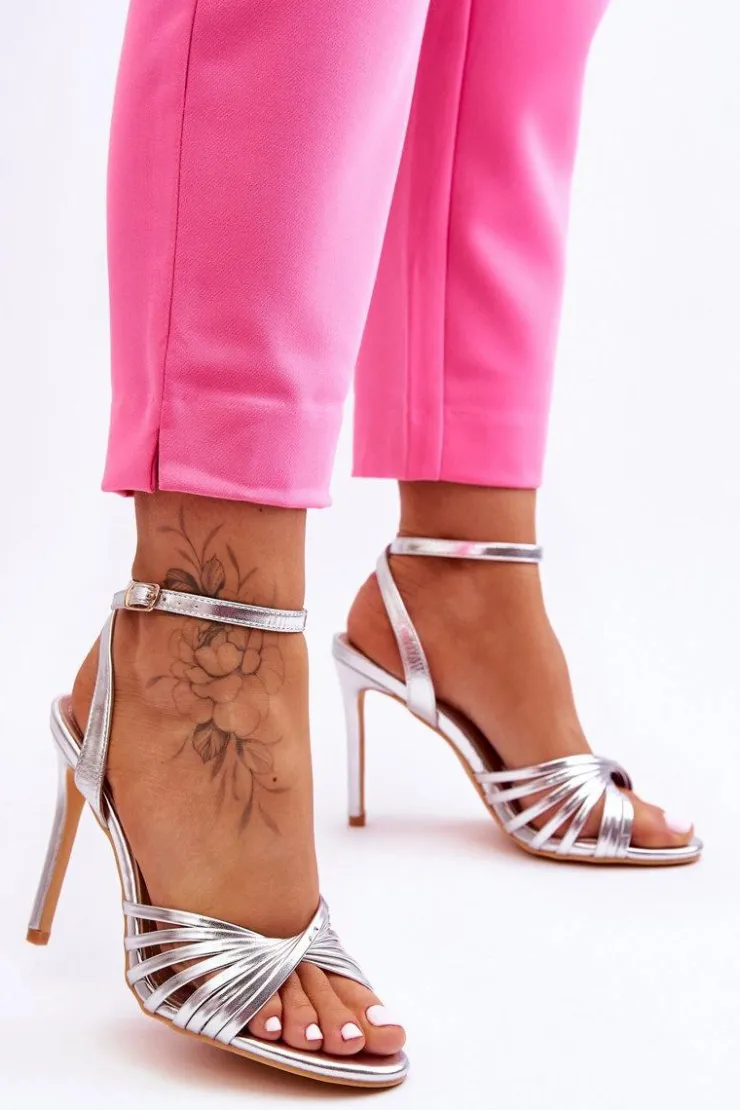 Te piękne sandałki damskie osadzono na obcasie w postaci szpilki. Model ten został wykonany z eko skóry. Sandałki posiadają na przodzie związane paseczki. Zapinane wokół kostki na regulowany pasek ze sprzączką. Te eleganckie sandałki z pewnością sprawdzą się w wielu stylizacjach na różnego rodzaju imprezy, spotkania czy uroczystości! Przy wyborze rozmiaru prosimy sugerować się tabelą rozmiarów.