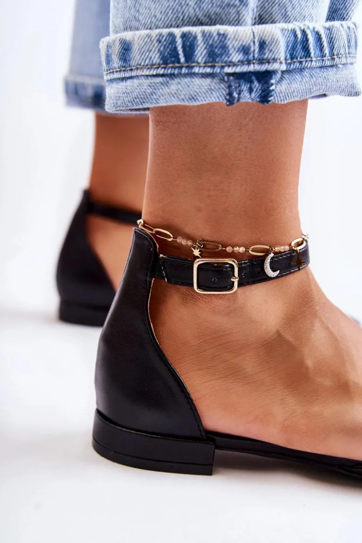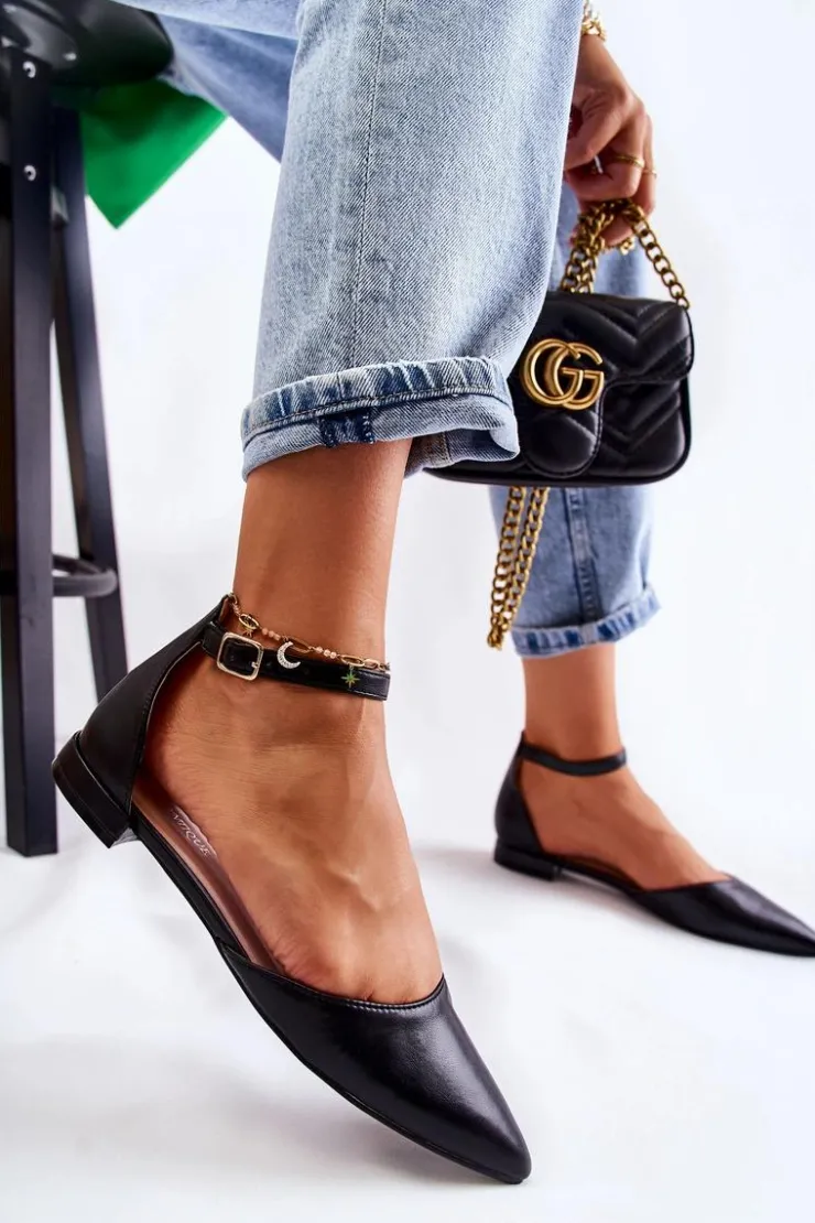 Niezwykłe baleriny w formie sandałek. Modny fason świetnie sprawdzi się podczas upalnych dni. Zostały wykonane z eko skóry. Posiadają zapinanie na regulowany pasek ze sprzączką. Miękka, eko skórzana wkładka zapewni komfort podczas użytkowania. Osadzone na niskim obcasie. Dodatkowo buty te posiadają usztywniany zapiętek. Nosek w szpic. Podczas wyboru rozmiaru prosimy sugerować się tabelą rozmiarów.