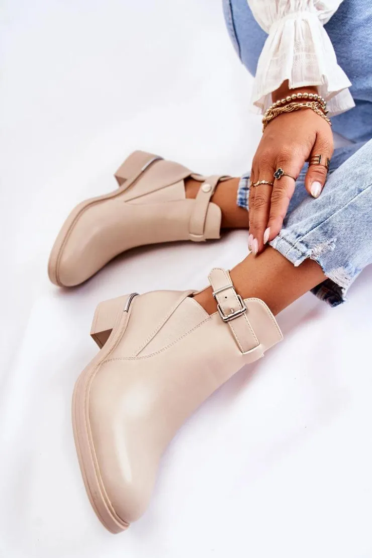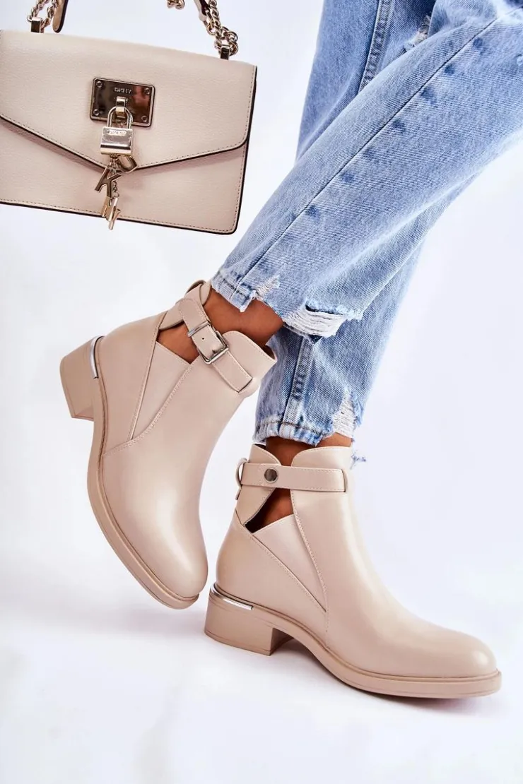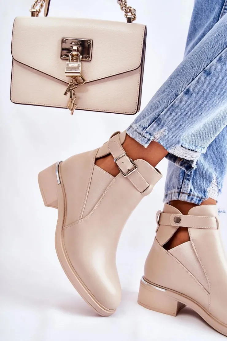 Modne botki damskie z delikatnymi wycięciami po bokach cholewki oraz gumkami pozwalającymi na odpowiednie dopasowanie obuwia do tęgości nogi. Model ten został wykonany z eko skóry. Wkładka materiałowa. Dodatkowo buty posiadają usztywniany zapiętek. Pasek zapinany na napę oraz sprzączkę, który można ściągnąć. Osadzone na płaskim obcasie. Przy wyborze rozmiaru prosimy sugerować się tabelą rozmiarów.