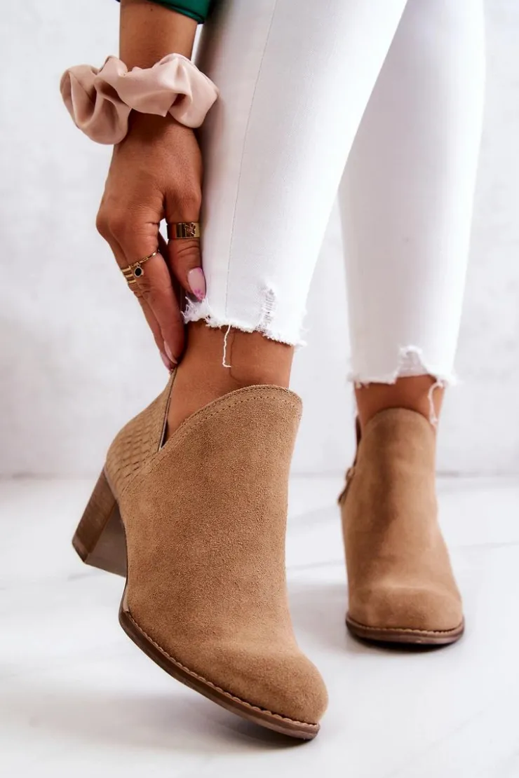 Wyjątkowe botki wykonane z naturalnej zamszowej skóry. Wnętrze zostało pokryte skórą naturalną i materiałem tekstylnym, co sprawia, że są bardzo komfortowe podczas użytkowania. Miękka, skórzana wkładka wykonana została ze skóry naturalnej. Z boku cholewki znajduje się zamek błyskawiczny, który ułatwia zakładanie obuwia. Obcas w postaci słupka zapewnia stabilizację. Tłoczona faktura oraz modny fason w stylu kowbojek zachwyci każdego.Przy wyborze rozmiaru prosimy sugerować się tabelą rozmiarów.