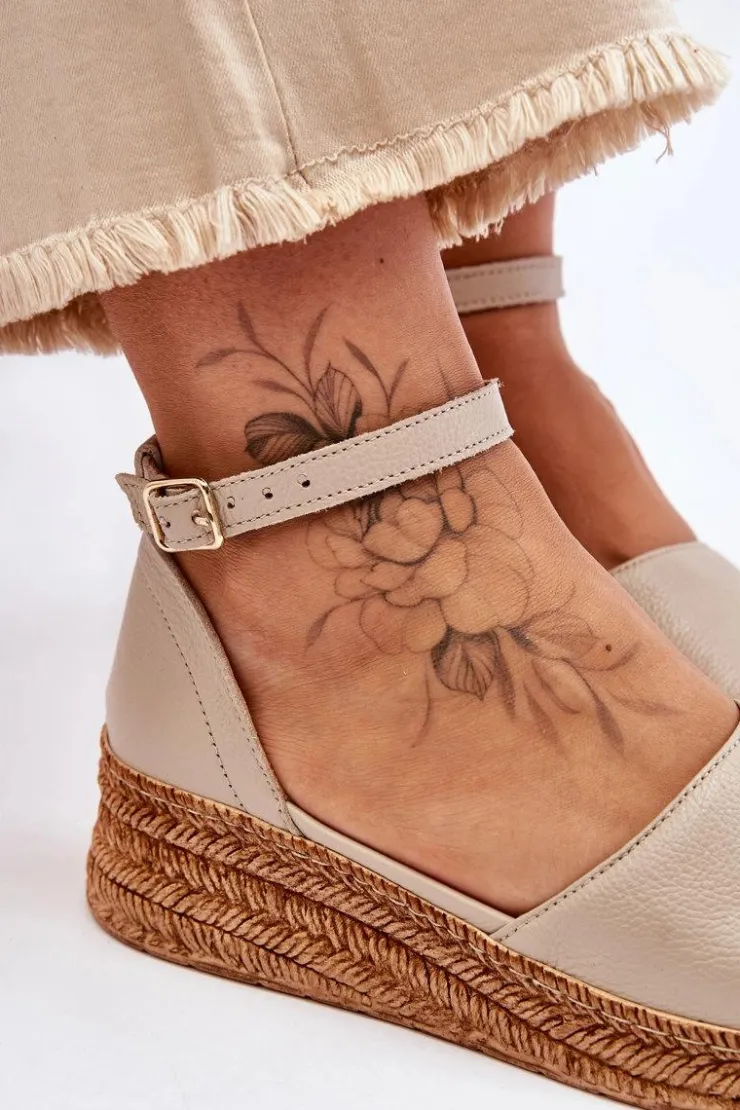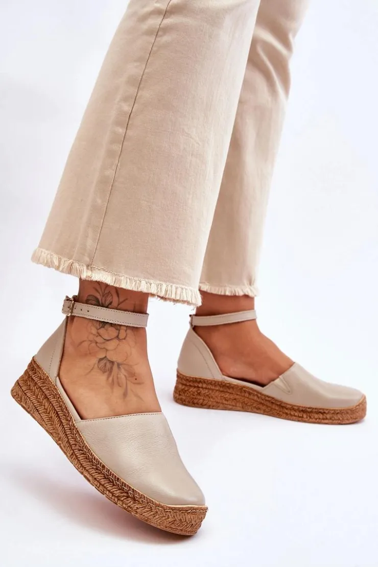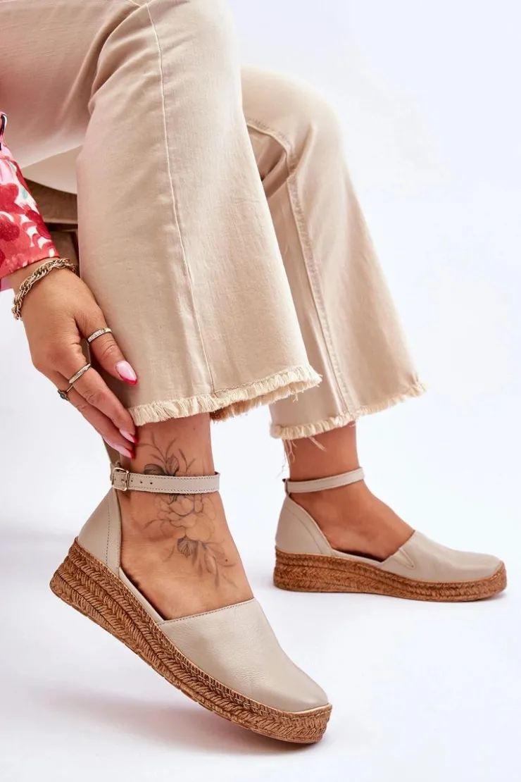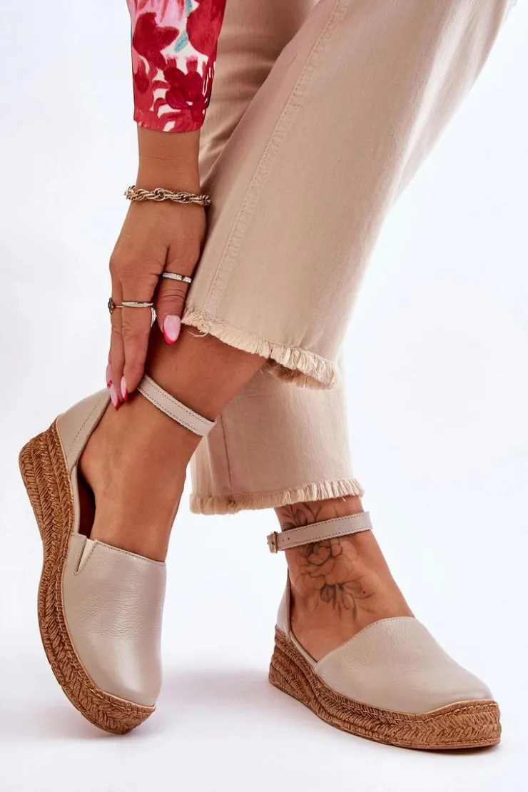 Espadryle osadzone na platformie oraz koturnie zostały wykonane z naturalnej skóry. Zapinane wokół kostki na sprzączkę z regulowanym paskiem. Platforma została wykonana z tworzywa z imitacją plecionki. Miękka wkładka z naturalnej skóry pozwoli na komfortowe użytkowanie. Sprawdź także pozostałe modele espadryli dostępne w naszej ofercie!Przy wyborze rozmiaru prosimy sugerować się tabelą rozmiarów.