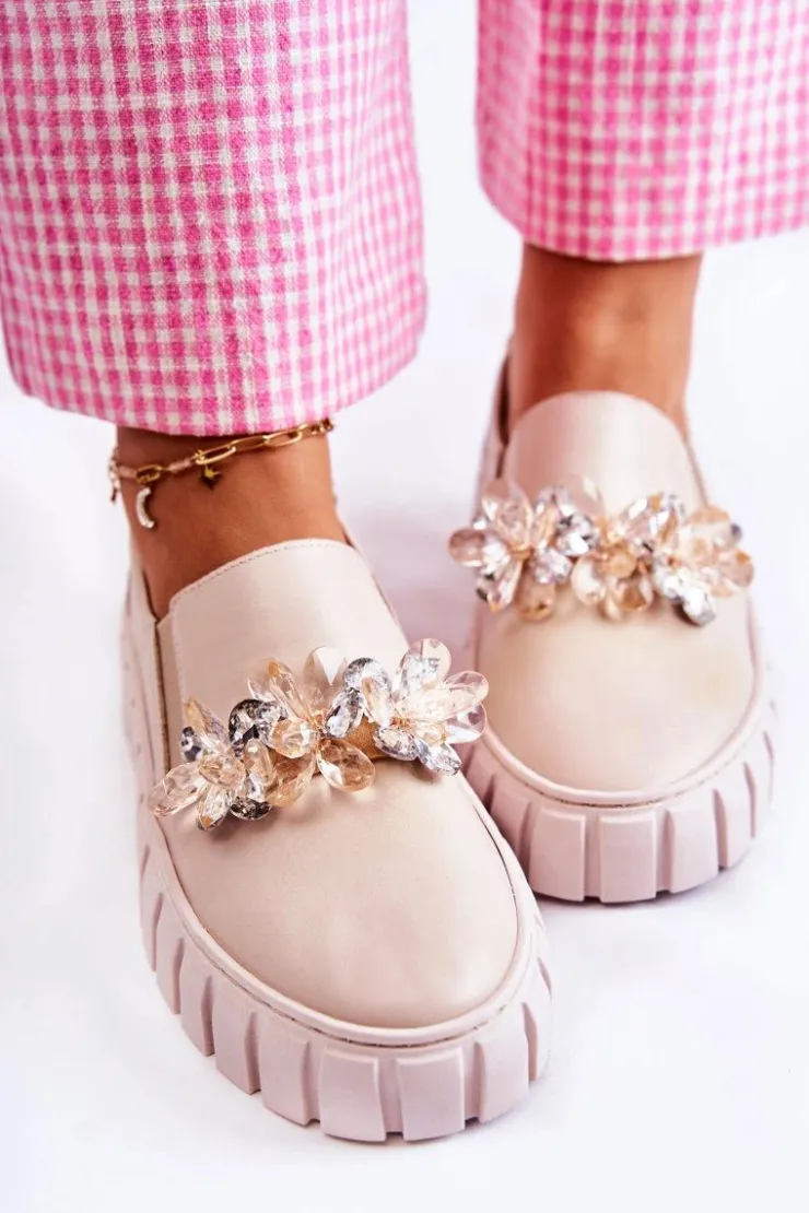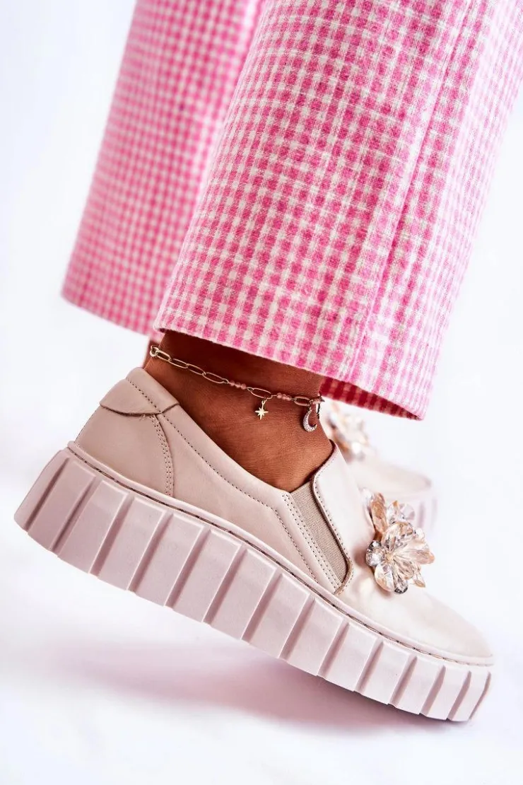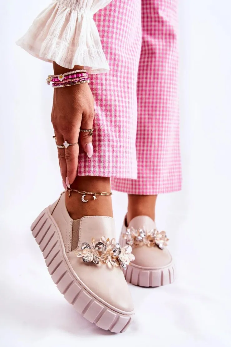 Modne tenisówki z ozdobą na przodzie w postaci imitacji kryształków. Model slip-on. Buty zostały wykonane z naturalnej skóry. Posiadają usztywniany zapiętek. Model z okrągłym noskiem. Buty zostały osadzone na masywnej platformie z antypoślizgową podeszwą. Model ten posiada gumki pozwalające na odpowiednie dopasowanie obuwia do tęgości nogi. Miękka, skórzana wkładka jest bardzo komfortowa podczas użytkowania. Przy wyborze rozmiaru prosimy sugerować się tabelą rozmiarów.