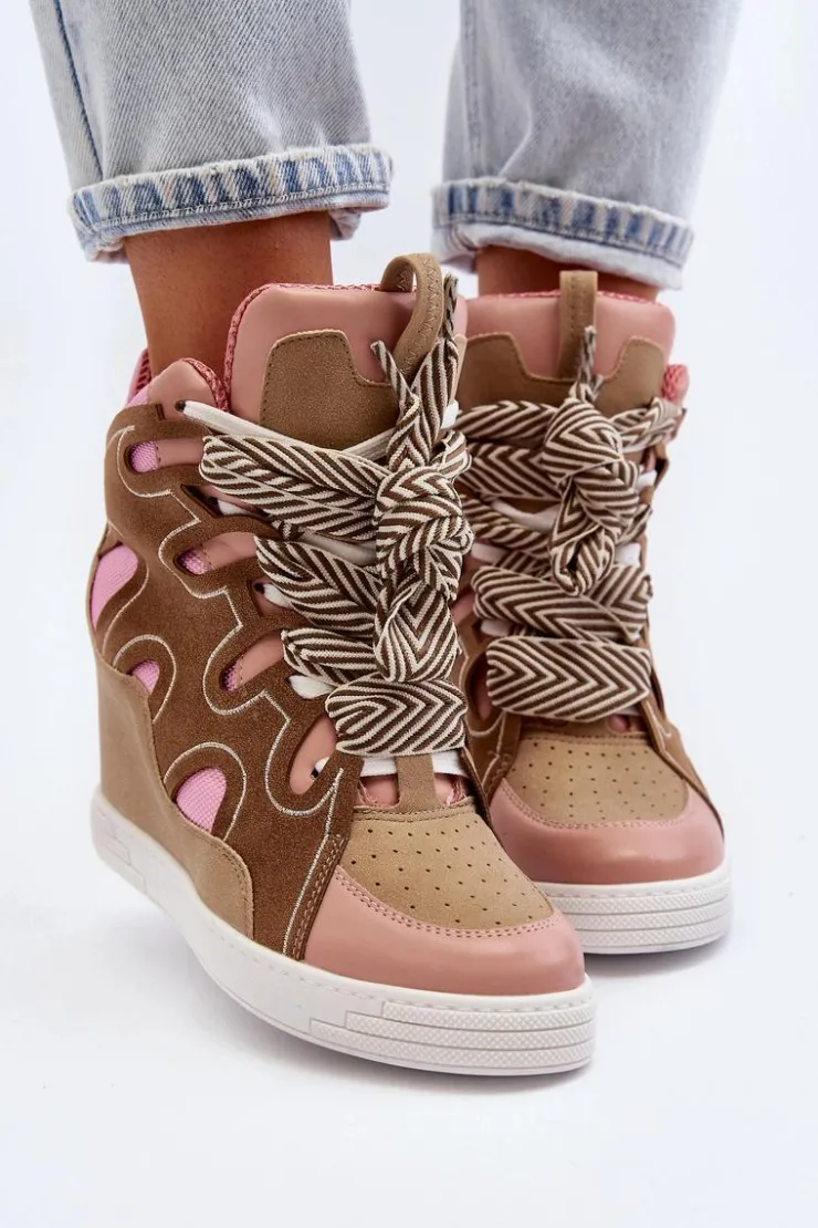Sneakersy damskie wykonane z połączenia eko skóry i materiału tekstylnego. Osadzone na ukrytym koturnie, który delikatnie uniesie Twoją sylwetkę. Model ten posiada podwójne sznurowanie. Koniecznie powinnaś mieć ten fason w swojej garderobie, jeżeli cenisz sobie modny design! Przy wyborze rozmiaru prosimy kierować tabelą rozmiarów.