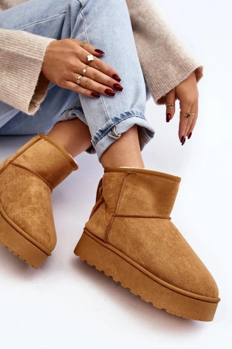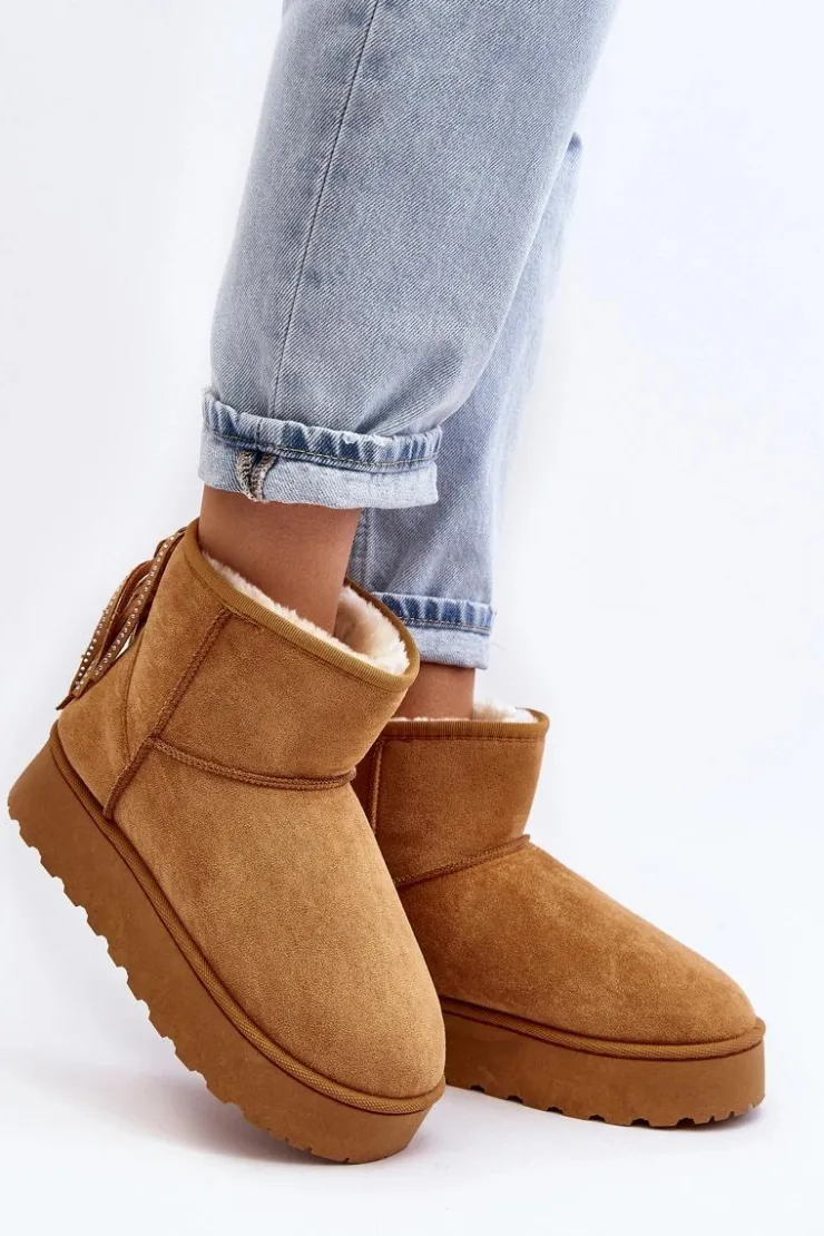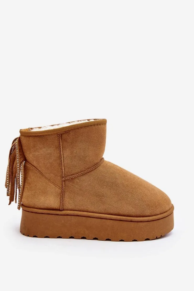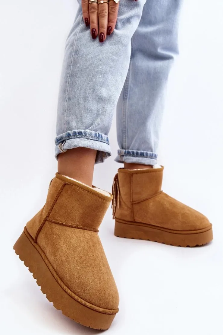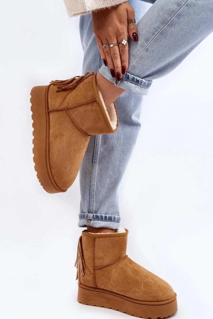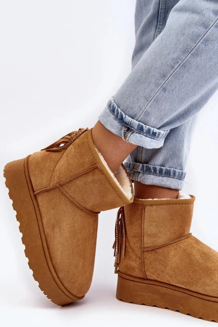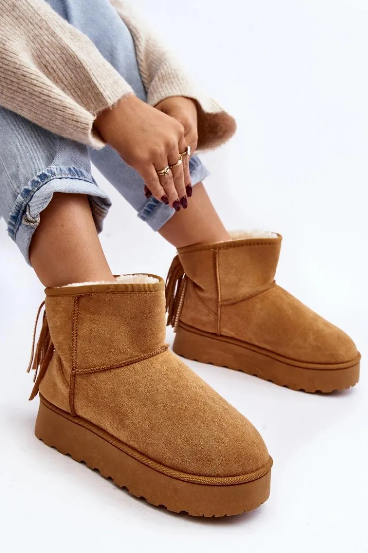 Damskie śniegowce wykonane z eko zamszu. Osadzone na masywnej podeszwie z gumowego tworzywa. Cholewka za kostkę ozdobiona frędzlami z tyłu. Środek ocieplony grubym futerkiem. Model ten występuje również w rozmiarówce dziecięcej. Stwórz komplet mama + dziecko! Przy wyborze rozmiaru prosimy sugerować się tabelą rozmiarów.