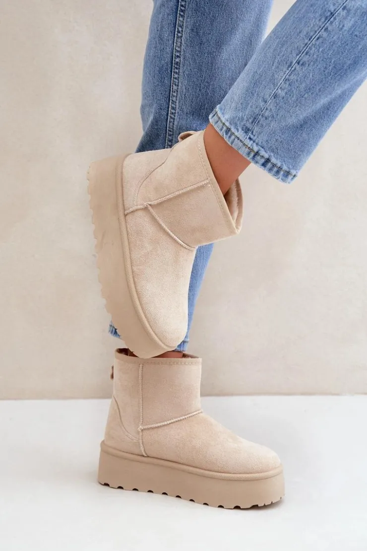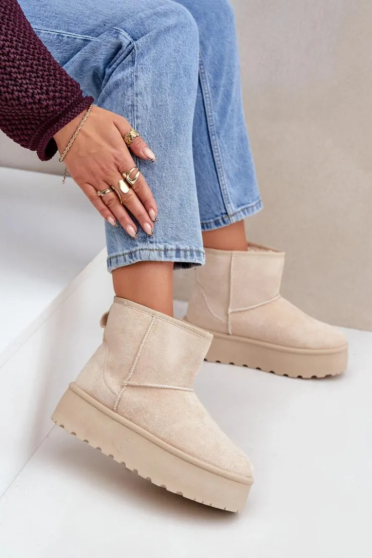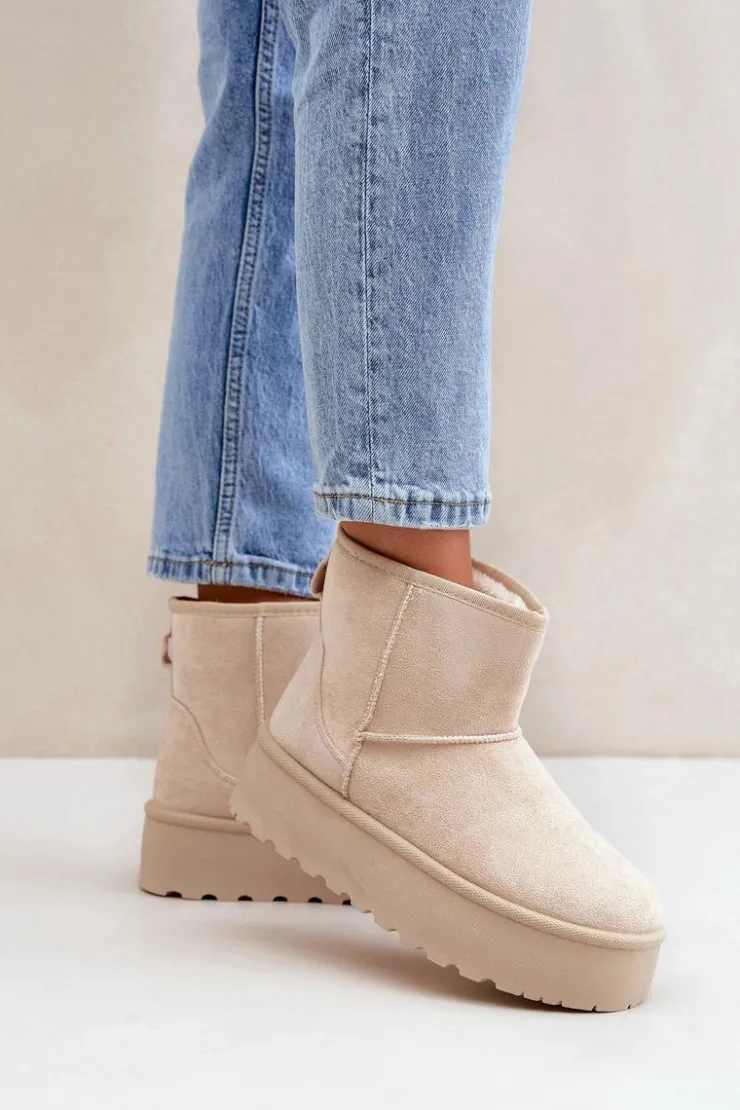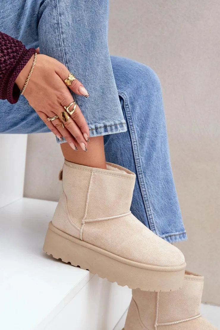 Damskie śniegowce wykonane z eko zamszu. Zamontowane na platformie. Wnętrze wyłożone futerkiem, dzięki czemu są doskonałym wyborem na chłodne dni, zapewniając ochronę przed zimnem. Ich stylowy fason pozwala na łączenie ich z różnymi stylizacjami, dodając każdemu zimowemu outfitowi unikalnego charakteru! Przy wyborze rozmiaru prosimy sugerować się tabelą rozmiarów.
